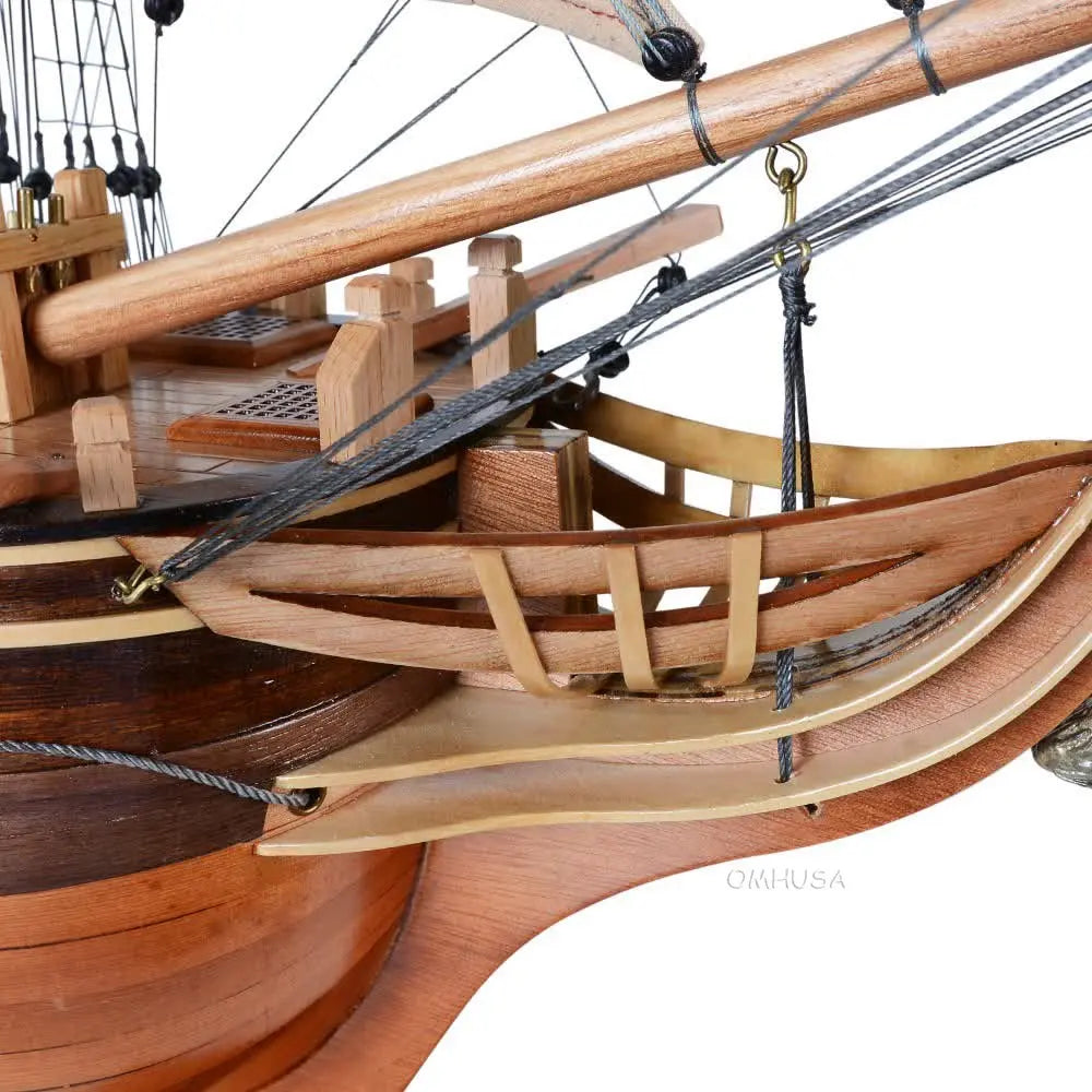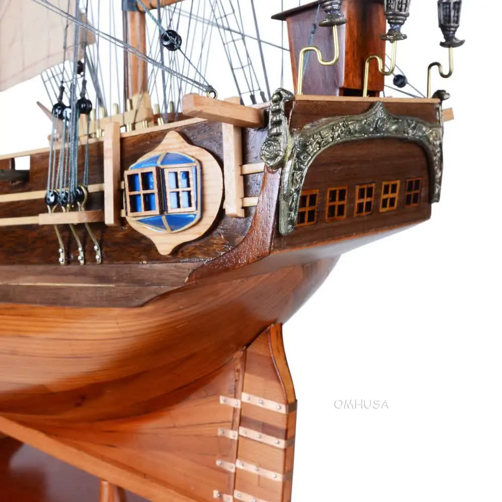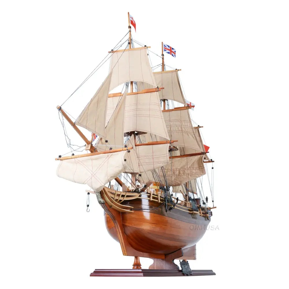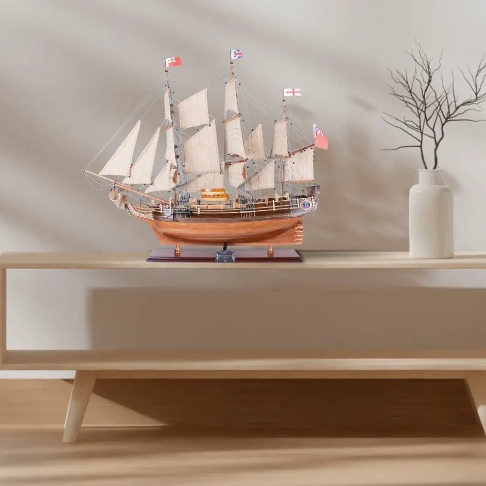 This museum-quality HMS Bounty replica is a fully assembled tall ship model handcrafted from premium woods like western red cedar, rosewood, and mahogany. As part of our Exclusive Edition, each model is laser-etched with a unique serial number on the hull. Built using plank-on-frame construction, it features three detailed decks, brass statues, lifeboats, rigging, and hand-stitched sails. Admirer favorites include the ornate admiral’s quarter, wooden crane, bell tower, and detailed stern with metal lanterns and anchors. With over 100 hours of expert craftsmanship behind every model, this historic piece is ready to display on a solid wood base with a brass nameplate. Ideal for collectors, nautical decorators, or anyone drawn to maritime history.