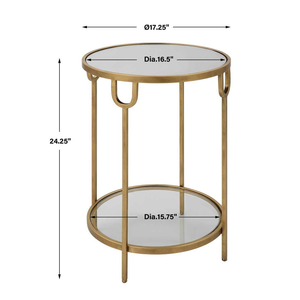This round two-tier accent table combines elegant design with practical functionality. Crafted with a durable iron frame and finished in antique gold, the table brings warmth and sophistication to a variety of interior styles. The top tier features a mirrored surface that reflects light and enhances the decorative appeal, while the lower shelf is made of tempered glass, providing additional space for books, décor, or everyday essentials. Measuring 17.25 inches wide and 24.25 inches high, the table is compact enough to fit beside a sofa, lounge chair, or bed while still offering useful storage and display space. Its versatile design makes it a stylish addition to living rooms, bedrooms, or entryways.