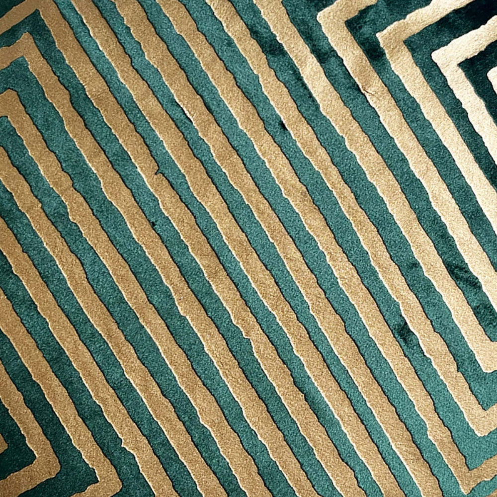 Crafted from durable polyester fabric, the surface is enhanced with a metallic geometric foil pattern that creates depth and a light-reflective finish. The structured motif adds a contemporary edge while maintaining timeless sophistication suitable for modern glam and transitional interiors.