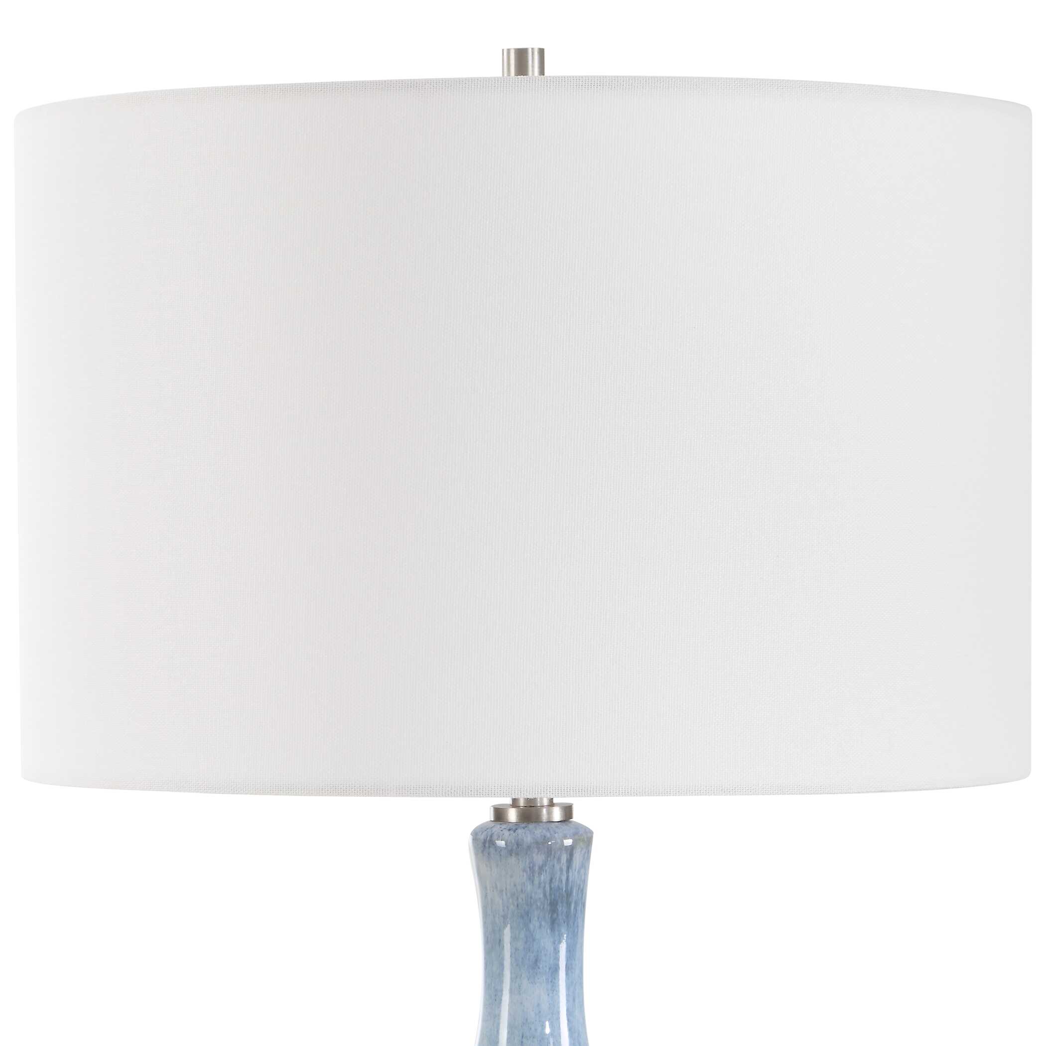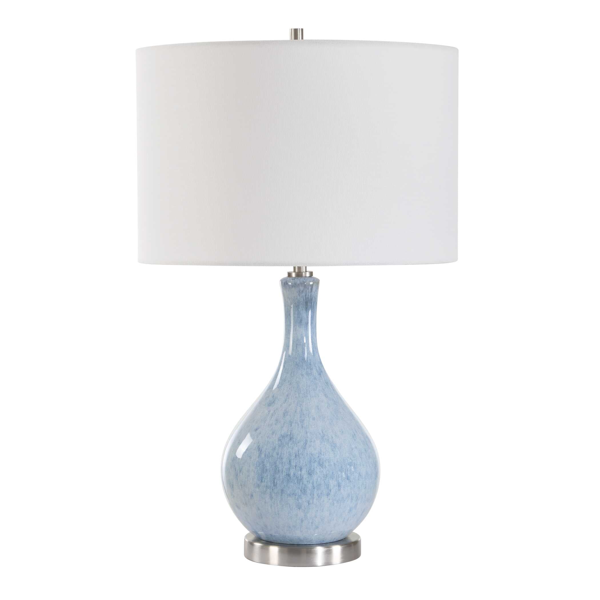 Soft blue ceramic table lamp designed to bring subtle elegance and refined style to modern interiors. The sculptural base features a soft blue glaze with mottled details, accented by plated brushed nickel highlights for a sophisticated finish. Measuring 15.5" L x 15.5" W x 23.5" H, this lamp is ideal for bedside tables, consoles, or living room side tables.Topped with a round white linen drum hardback shade (9" H, top 14W x 14D, bottom 14W x 14D), it softly diffuses light to create a warm, inviting glow. Compatible with a 100W bulb, this accent lamp combines functional illumination with decorative appeal, perfect for modern, coastal, or transitional interiors seeking a subtle pop of color.