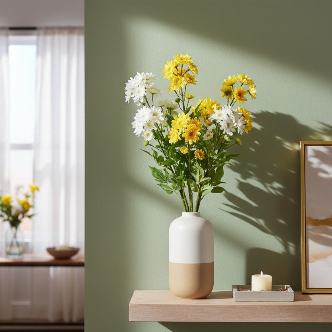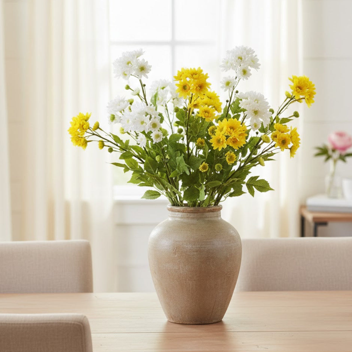 Bring vibrant color and natural beauty indoors with the Mum Spray Set (Set of 12). Each spray measures 31.5 inches tall and features lifelike blooms in green, yellow, and white tones, crafted from durable polyester. Perfect for vases, wall baskets, or mixed floral arrangements, these sprays effortlessly brighten any indoor space and covered outdoor areas. Designed for long-lasting charm, they maintain their color and structure over time. Sold in a set of twelve pieces with two assorted designs, they create balanced and visually appealing displays. Lightweight yet durable, these faux mum sprays provide a simple, maintenance-free way to elevate your home décor with a pop of natural elegance.