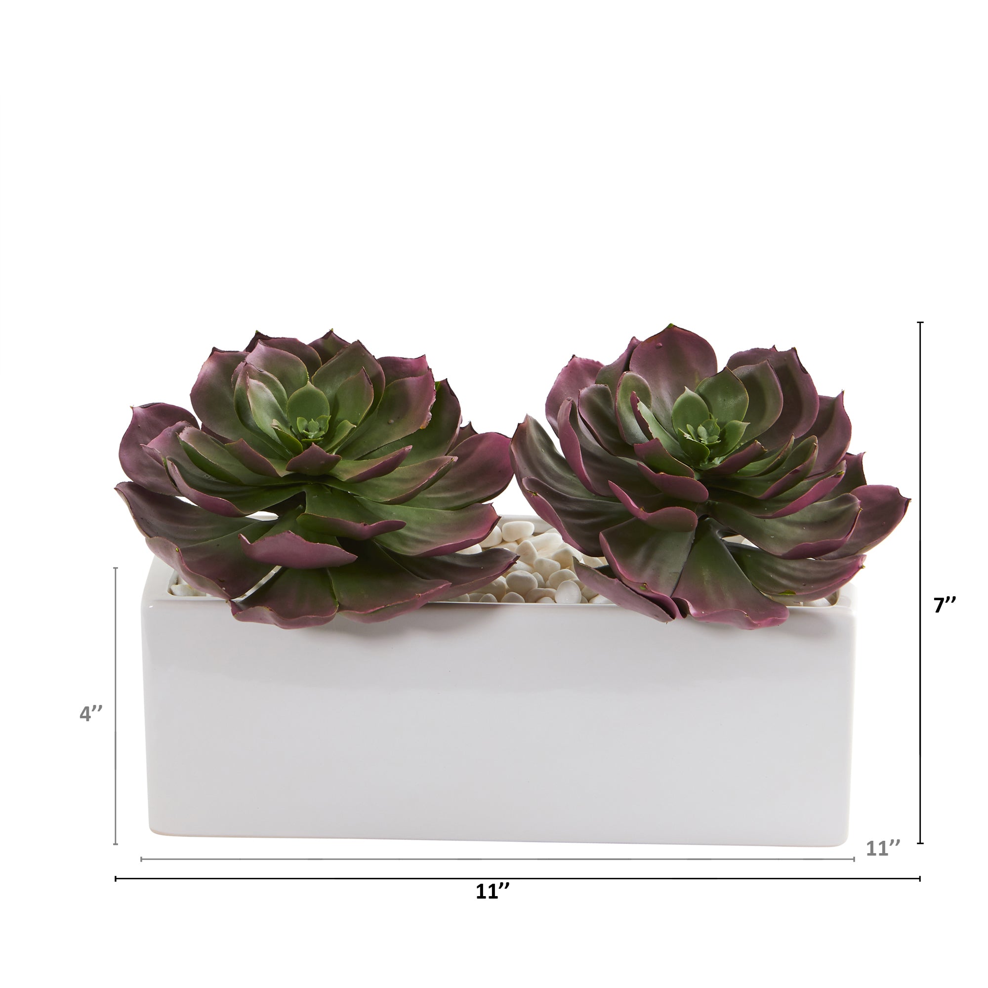 Incorporate realistic textures to help breathe life into everyday interiors with this artificial plant boasting a pair of realistic looking echeveria succulents in earthly tones, handsomely nestled within a white planter with natural tone rocks. Resting 11" wide, this handsome fake plant is perfectly suitable for empty spaces on a bookshelf or coffee table