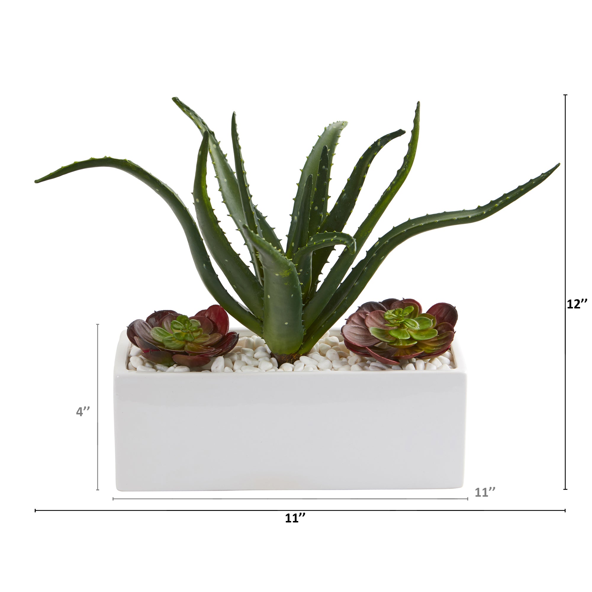 Accent your home or office with this artificial plant showcasing a mix of complementary succulents, a realistic looking aloe plant with lifelike leaves spawning upwards, handsomely accented at the base with a pair of complementary echeveria succulents. Standing 12" high from a white planter nestled with white rocks, this handsome fake plant evokes color and texture wherever displayed