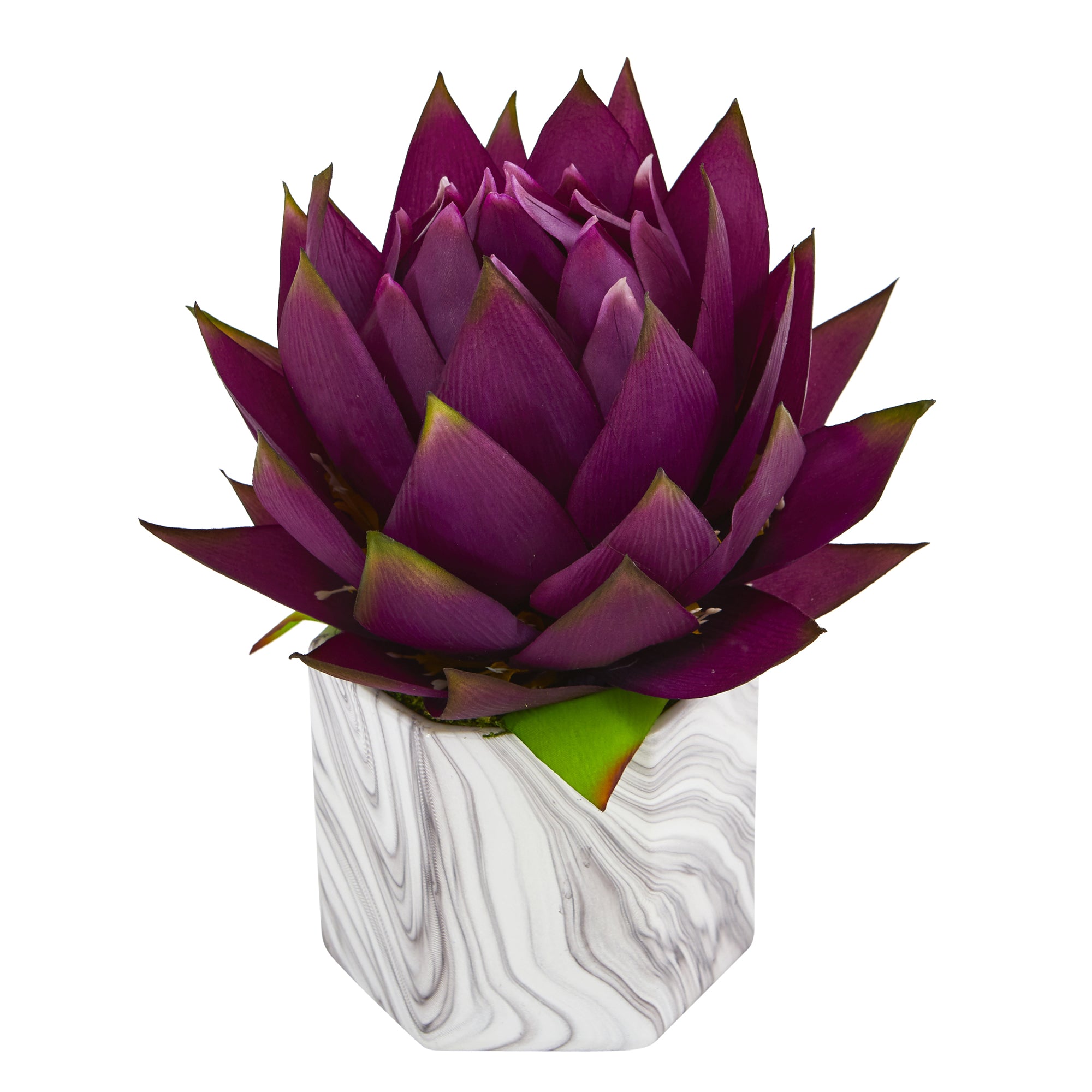Highlight tight, intimate corners with this artificial arrangement showcasing a single musella blossom frozen in mid-bloom, intricately designed with natural detailing and bright vivid color. Standing 12" high from a marble finished vase, this realistic looking silk arrangement would beautify even the smallest spaces