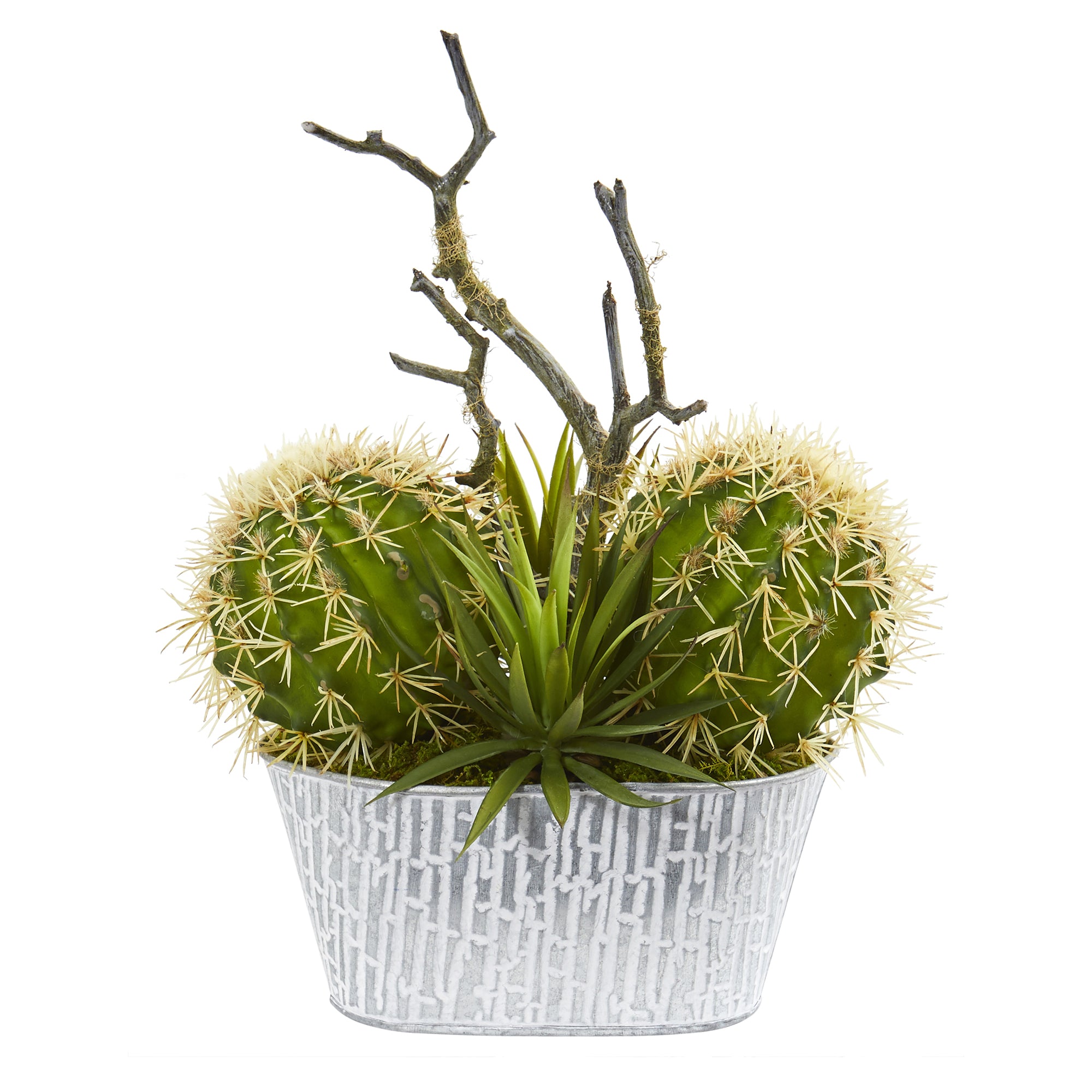 Channel the beauty of the southwest indoors with this artificial plant boasting a mix of complementary cacti, each carefully designed in palette of year-round evergreens and from the finest materials to convey a lifelike quality. Standing 14" high from a white tin planter nestled with natural moss, this charming fake plant will continue to stay fresh for years to come