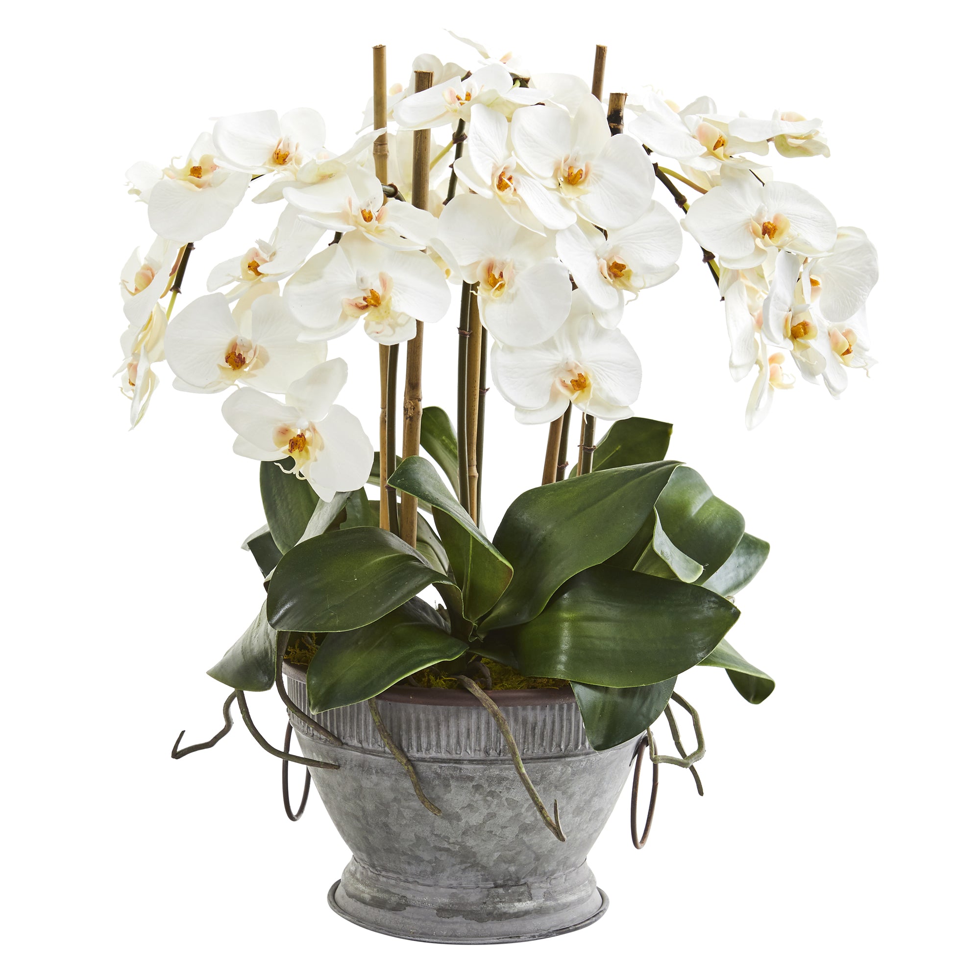 Create a dramatic focal point in a home or office space with the help of this artificial arrangement showcasing an alluring collection of intricately designed silk phalaenopsis orchids; boasting fresh, gorgeous blossoms captured in mid-bloom in soft, subtle hues and beautifully enhanced with complementary dark greenery. Standing 18" high from a copper trimmed vintage bowl, this incredibly lifelike arrangement effortlessly flaunts year-round beauty without the need for upkeep