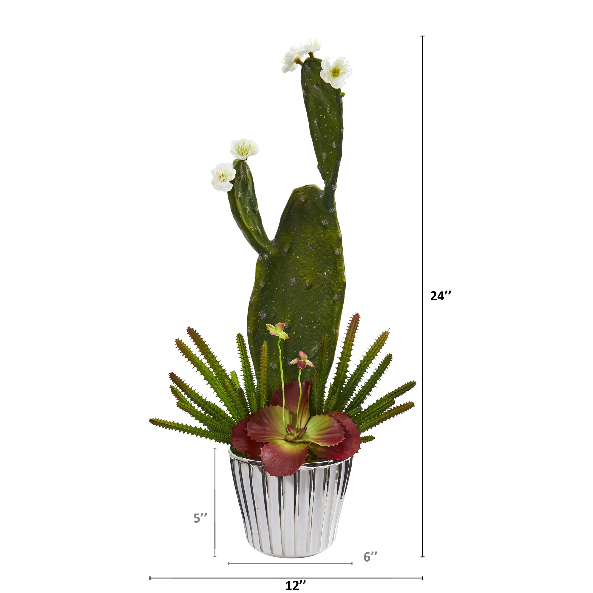 Enhance tight spaces with hints of natural accenting with this artificial plant, boasting a mix of authentic-looking cacti and succulents, each designed with naturally occurring details. Standing 24" high from a silver trimmed white planter, this realistic looking fake plant provides instant freshness wherever displayed