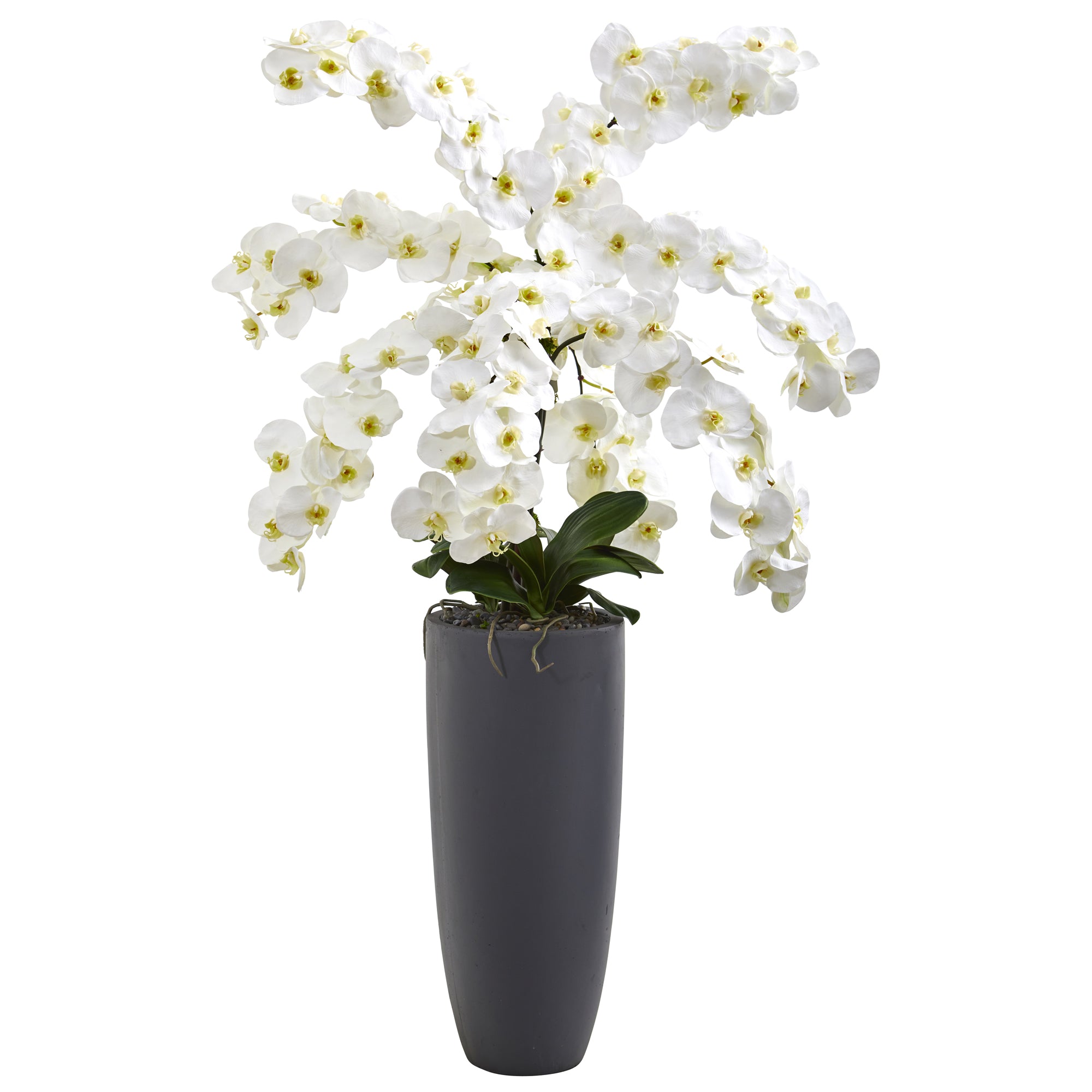 Showcase lifelike beauty throughout bare spaces with the help of this artificial arrangement showcasing an alluring collection of intricately designed silk phalaenopsis orchids; boasting fresh, gorgeous blossoms captured in mid-bloom in soft, subtle hues and beautifully enhanced with complementary dark greenery. Standing 4' high from a gray bullet vase, this incredibly lifelike arrangement effortlessly flaunts year-round freshness without the need for upkeep