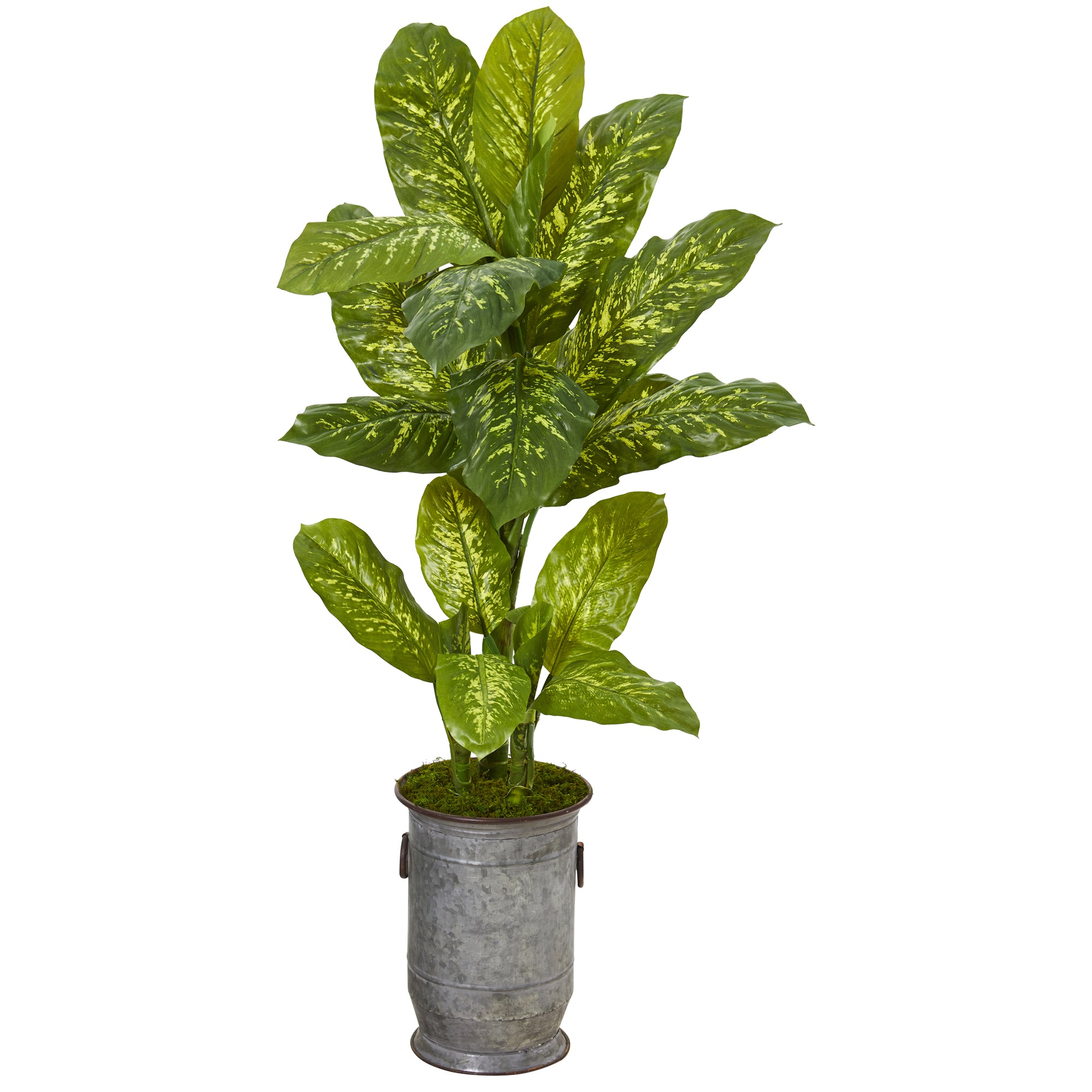 Spruce up everyday interiors with this artificial plant boasting a rich overgrowth of lush, variegated dieffenbachia foliage, carefully designed with naturally occurring details that feel real to the touch. Standing 49" high from a vintage metal planter, this fake plant will instantly freshen up any space it inhabits