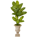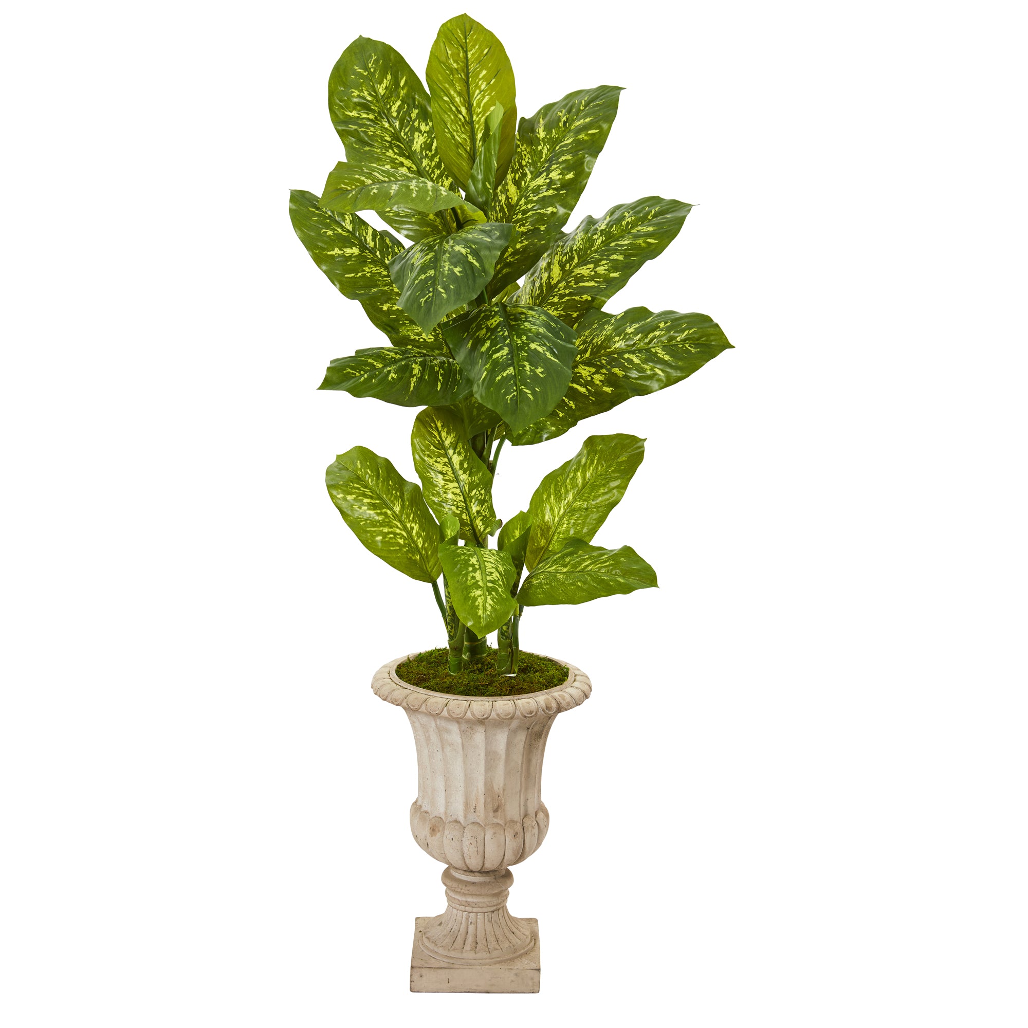 Highlight everyday interiors with this artificial plant boasting a rich overgrowth of lush, variegated dieffenbachia foliage, carefully designed with naturally occurring details that feel real to the touch. Standing 55" high from a sand finished urn, this fake plant will instantly freshen up any space it inhabits