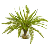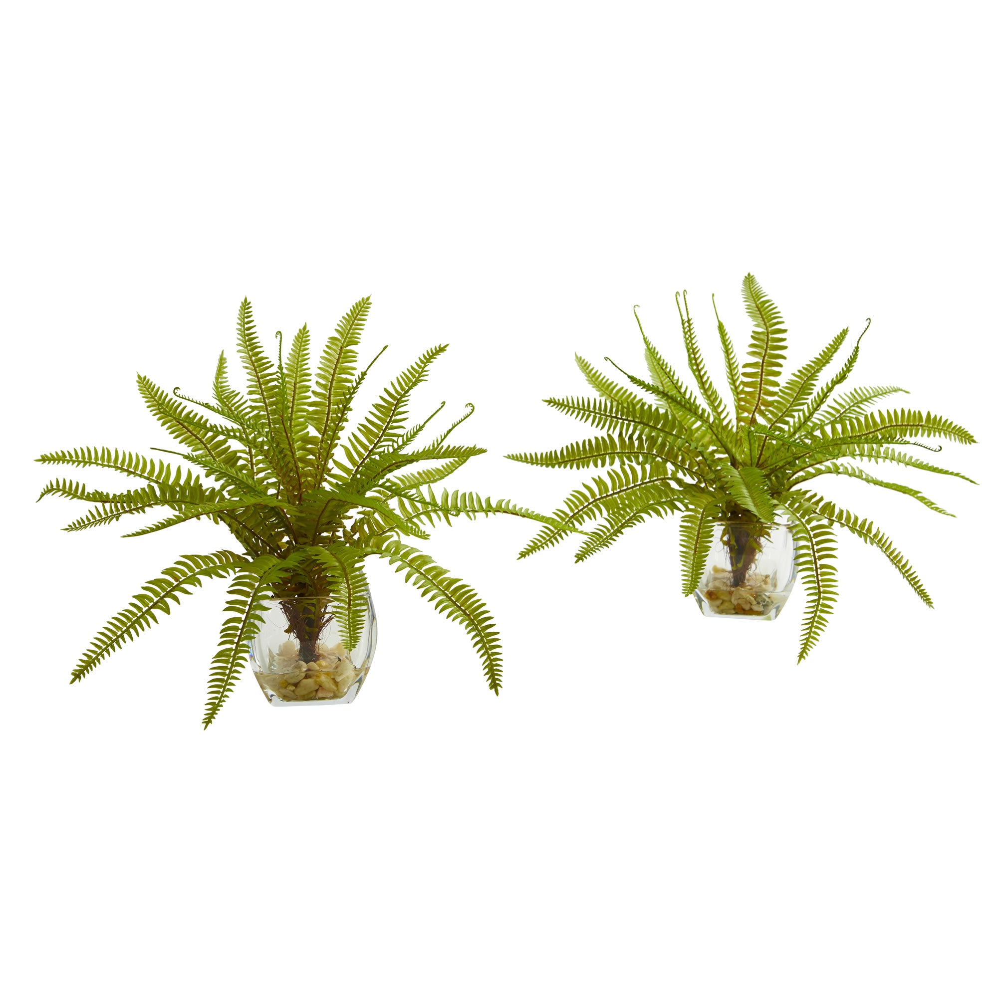 Several long, vibrant green fronds spill out of the included clear tapered vase with this fern artificial plant. With its realistic appearance and brilliant greenery, it will make a great decor piece for your sofa table. To complete the look, position this set of two on a polished decorative tray with LED candles for a more lively arrangement. Includes faux river rocks