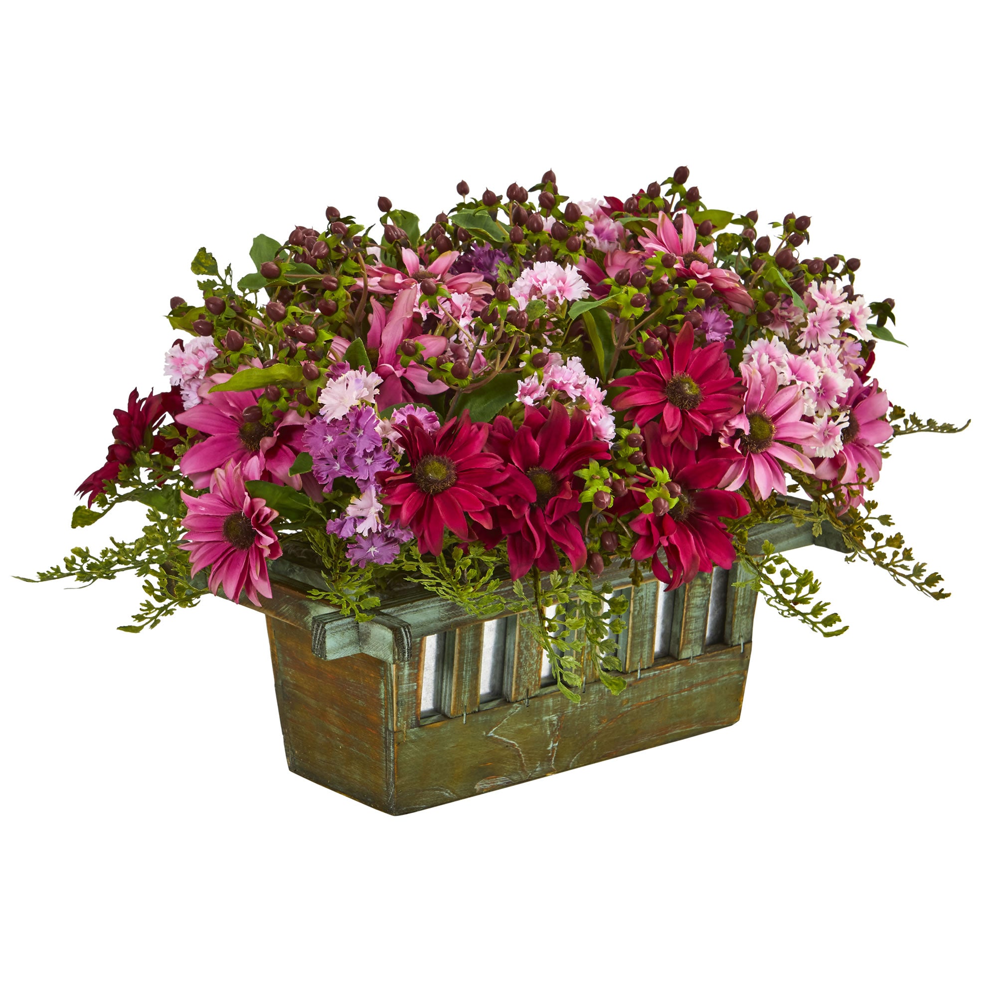 Welcome the spring into your home with this daisy artificial arrangement. With multi-hued blooms that range from light to dark pink in coloring, this piece will give any room a playful and fun atmosphere. With a decorative planter included, it can be positioned on a mantelpiece with white framed pictures and a small clock for a complete arrangement