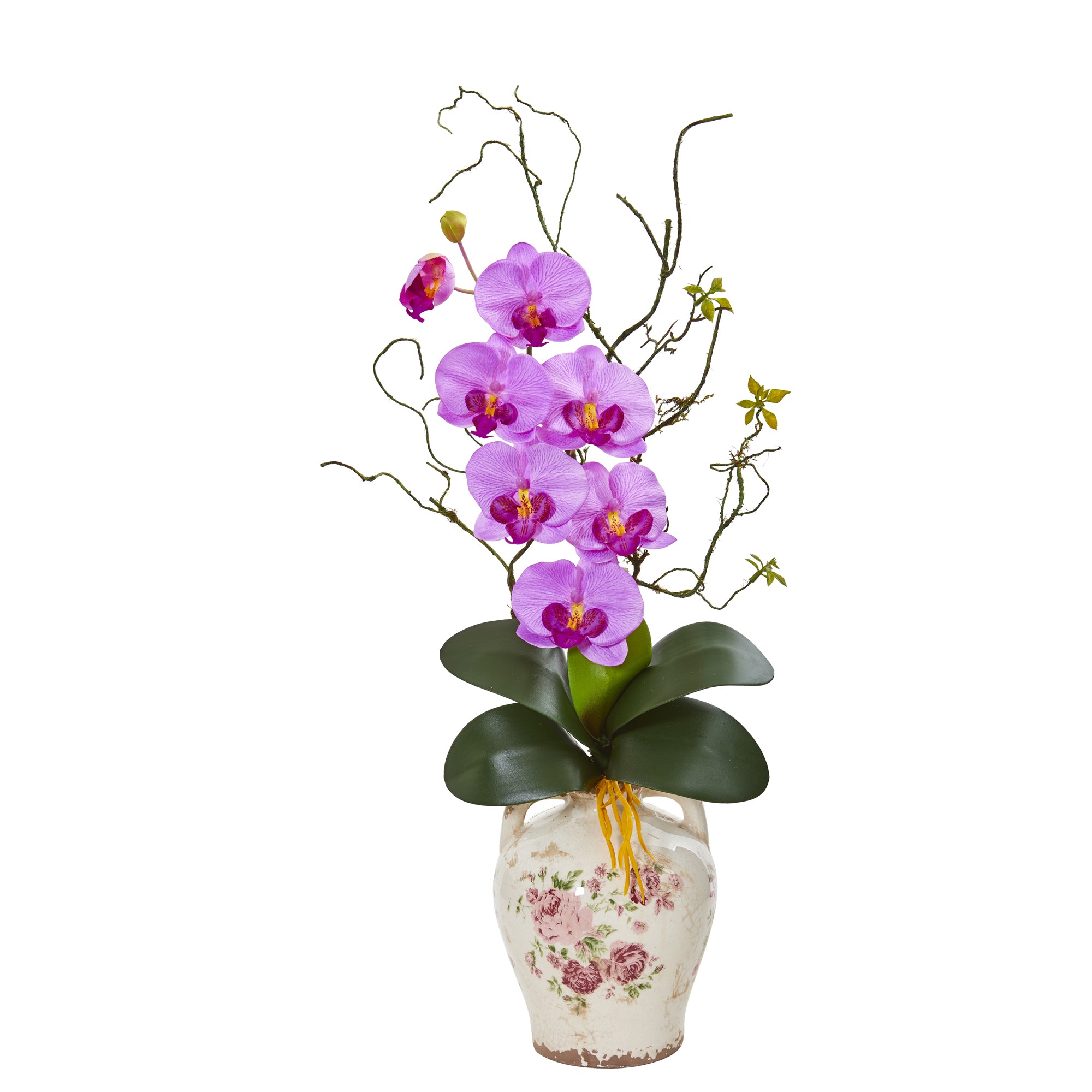``Mother Nature’s feminine drama comes to life with this artificial phalaenopsis orchid and twig arrangement. Elegantly housed in an oversized printed jar, this stunning arrangement features oversized green leaves enhanced against the bright vivid hues of the blossoms. A proud arrangement at 30`` tall, it can enhance any bare space that needs brightening. ``