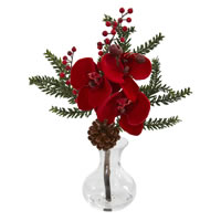 Nearly Natural 1659-S2 12" Artificial Red Phalaenopsis Orchid, Berry & Pine Arrangement in Glass Vase, Set of 2