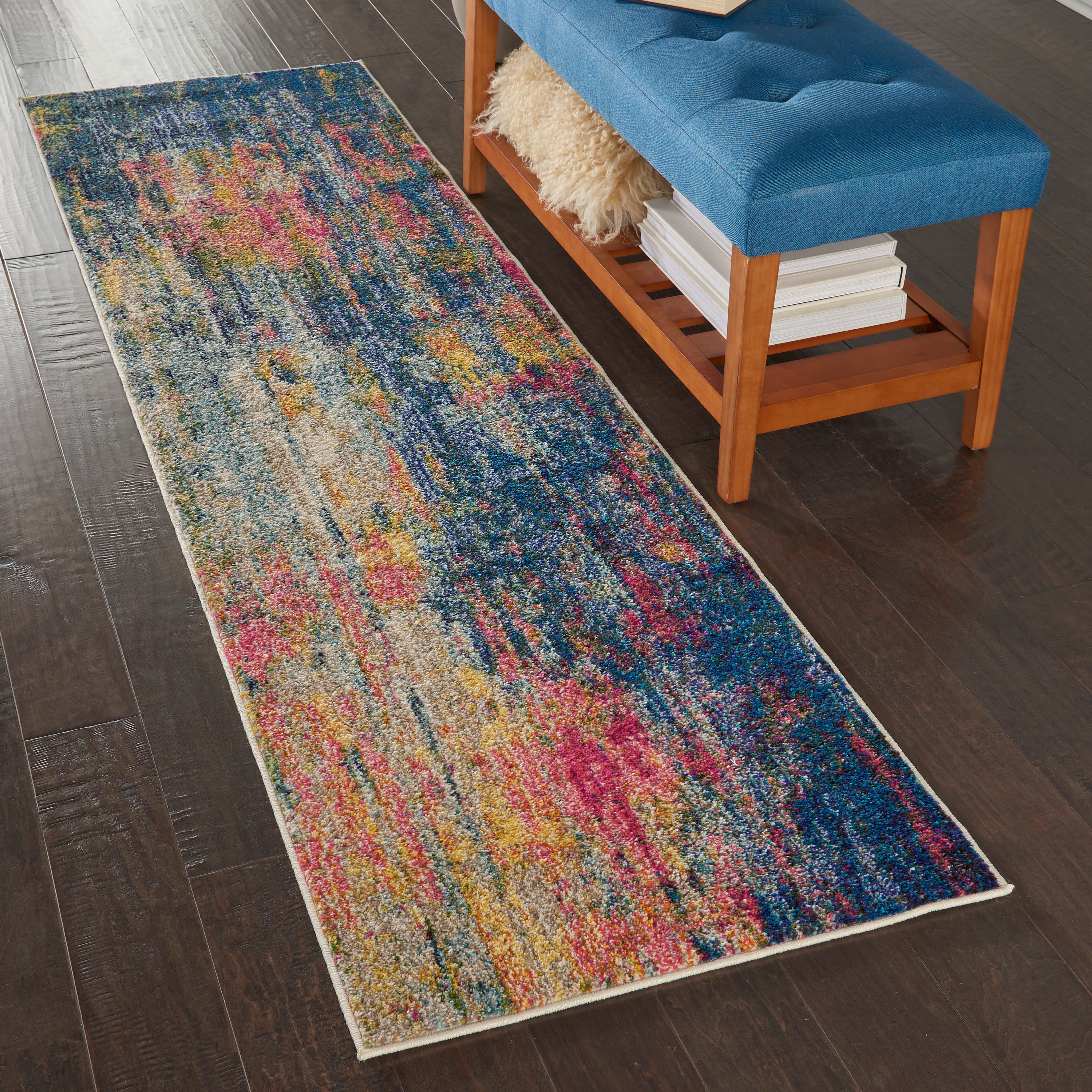 A true statement piece for your home, this blue and yellow abstract design from the Celestial rug collection evokes images of darkness giving way to light. The striated yellow and red has the dreamy aura of reflections on a deep navy field, imbuing this modern rug with a surreal beauty that`s sure to impart an artistic aesthetic into your interior design.