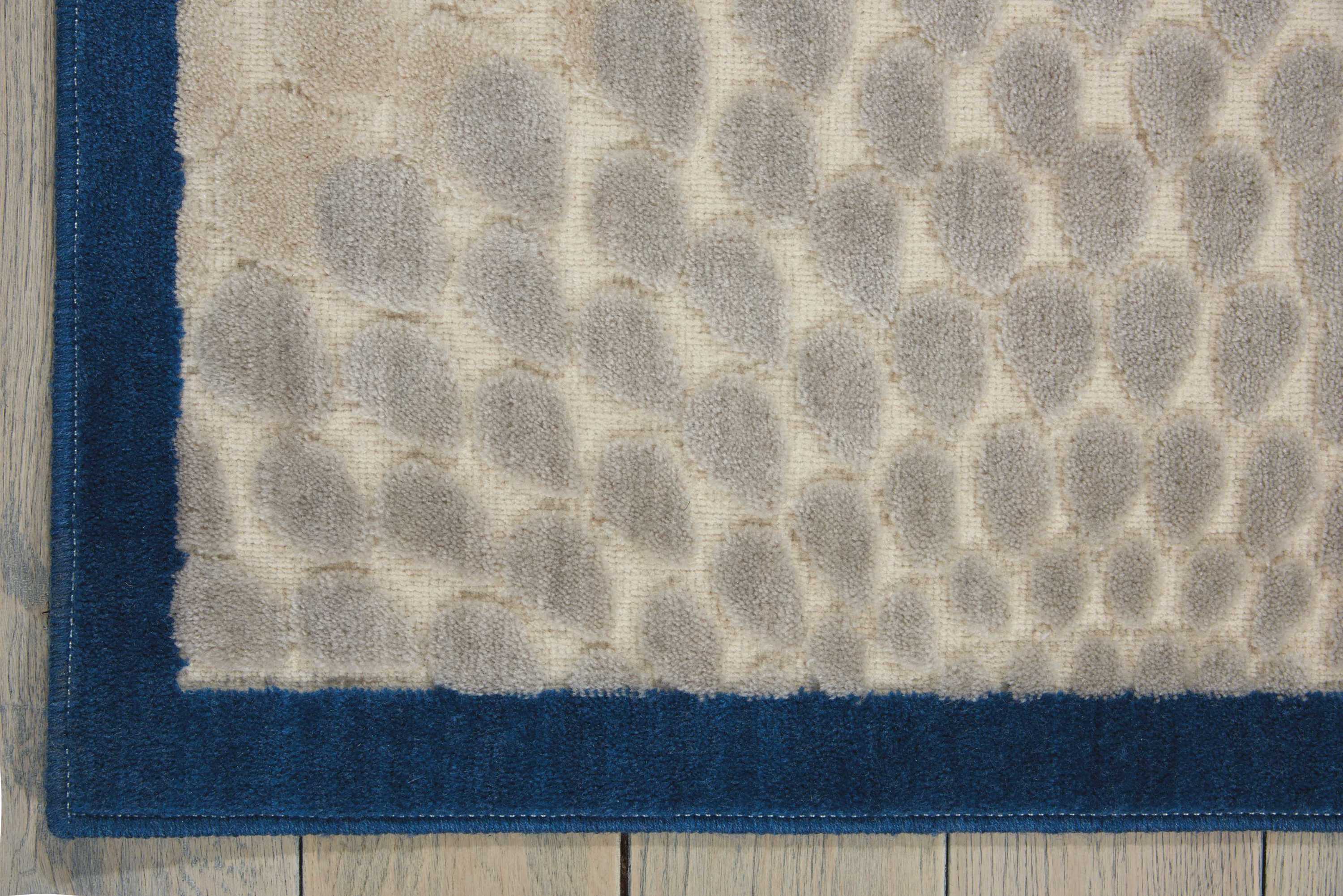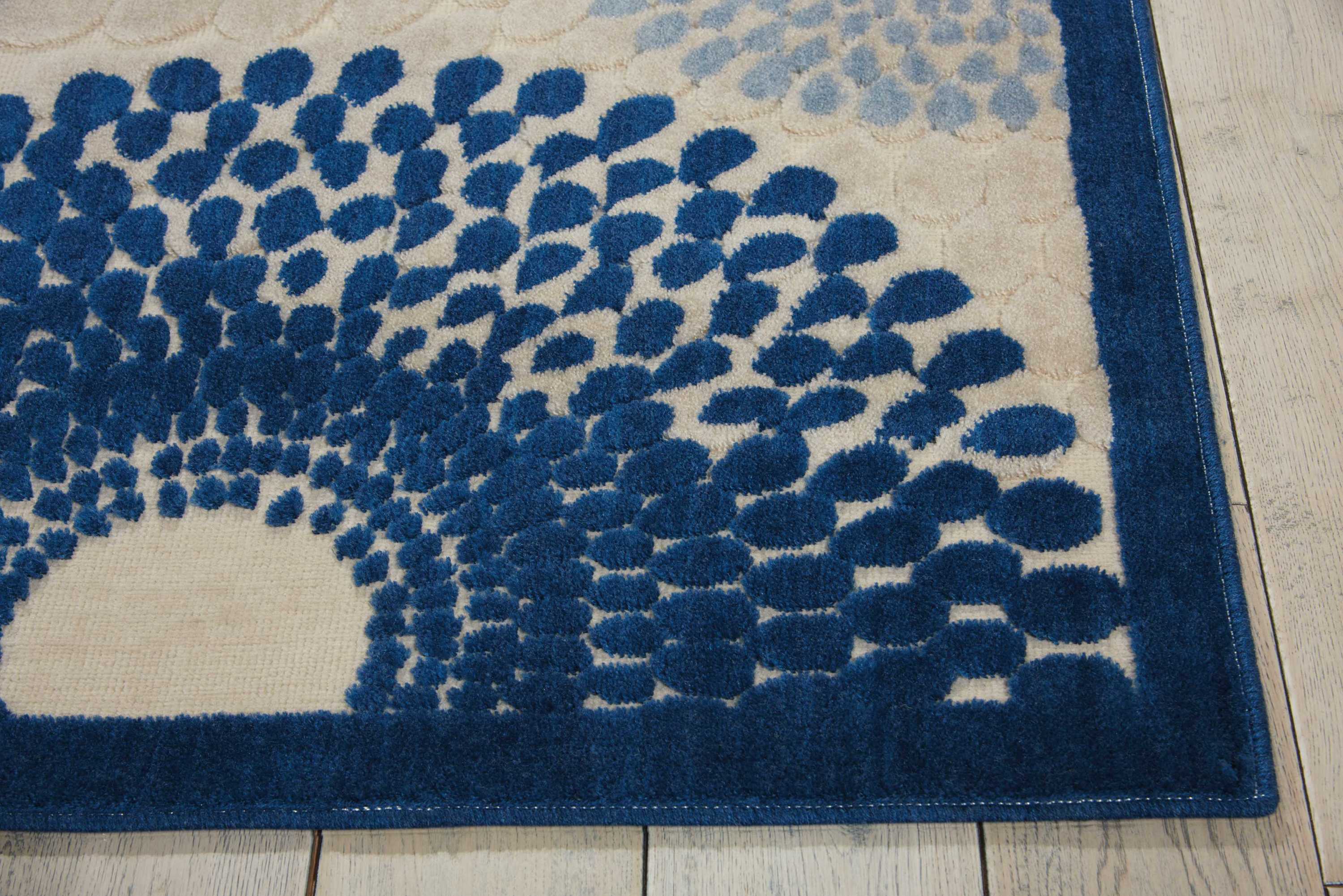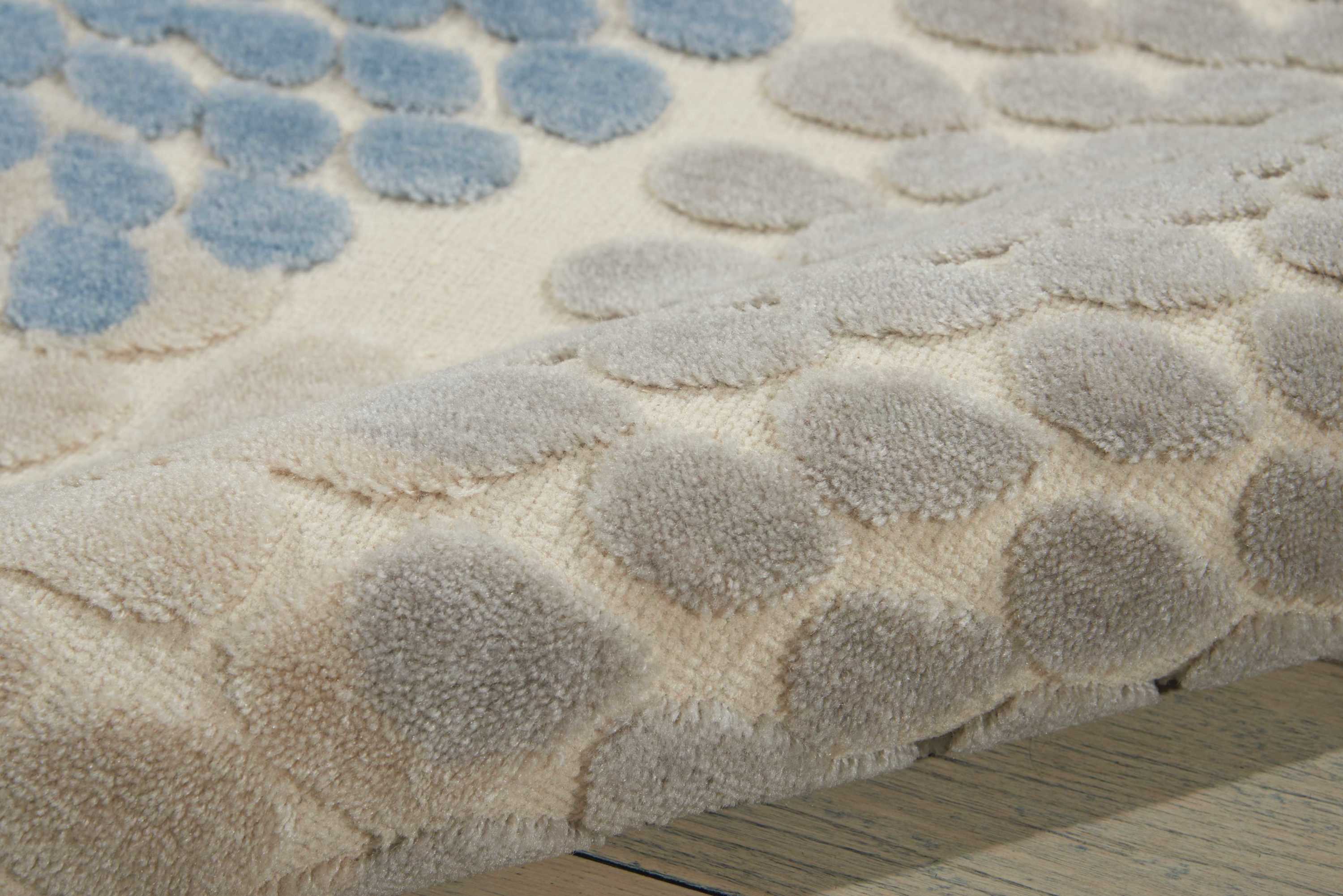 Interlocking tri-tone spheres of blue, light blue, light grey and ivory hover over a beautiful beige background as they swirl together in a graphic optical illusion of smoke and mirrors. Dynamic, graphic and replete with the exquisite texture of high-low loop pile construction and gorgeous hand carving, this rug represents the height of approachable modernity.