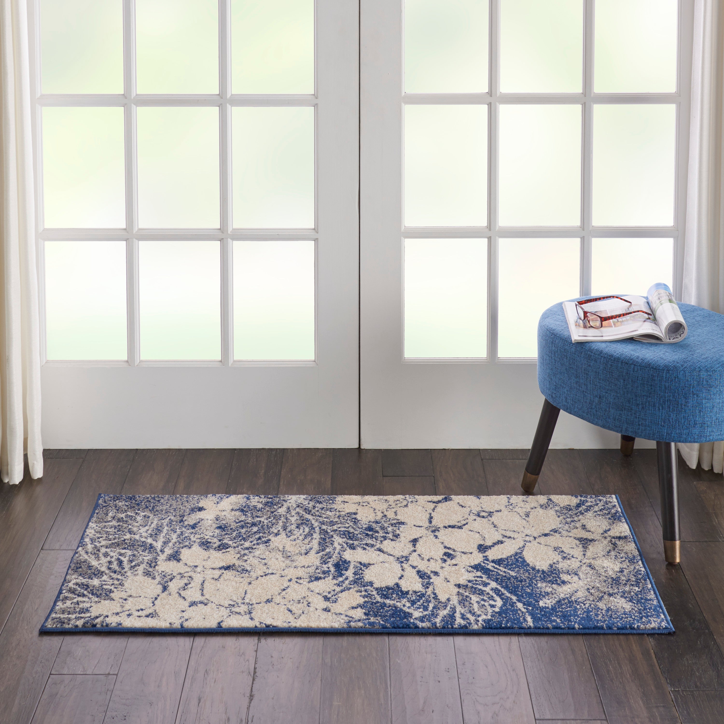 Oversized floral patterns take on a mystical glow in this contemporary Tranquil Collection rug, with ivory flower petals fading into an ombre navy and grey background. Soft, easy-care fibers make this a versatile dose of botanical beauty anywhere in the home.