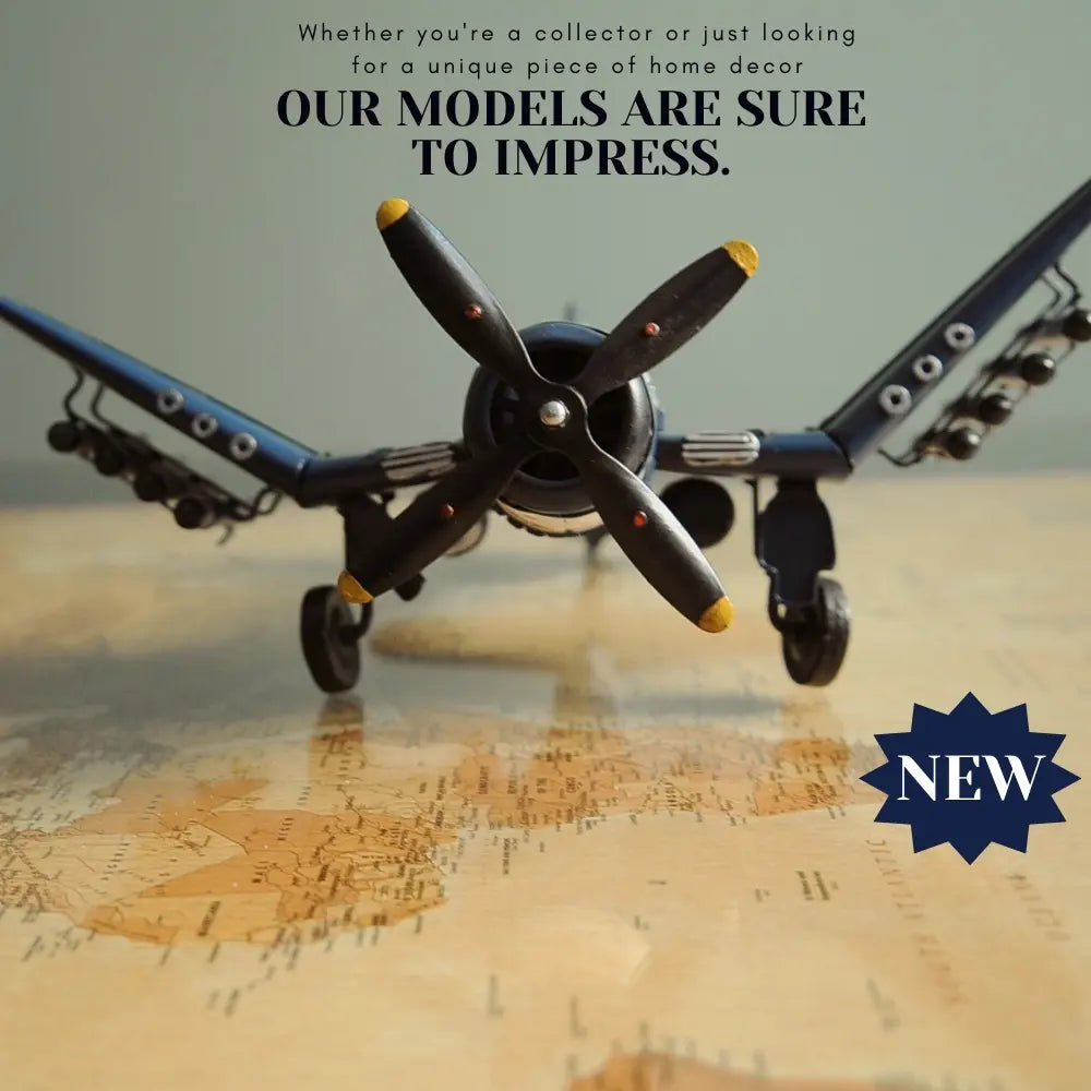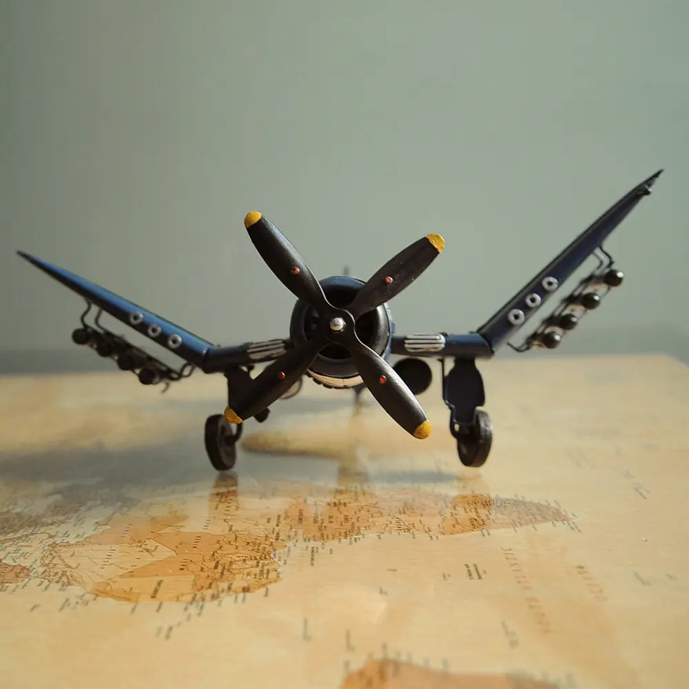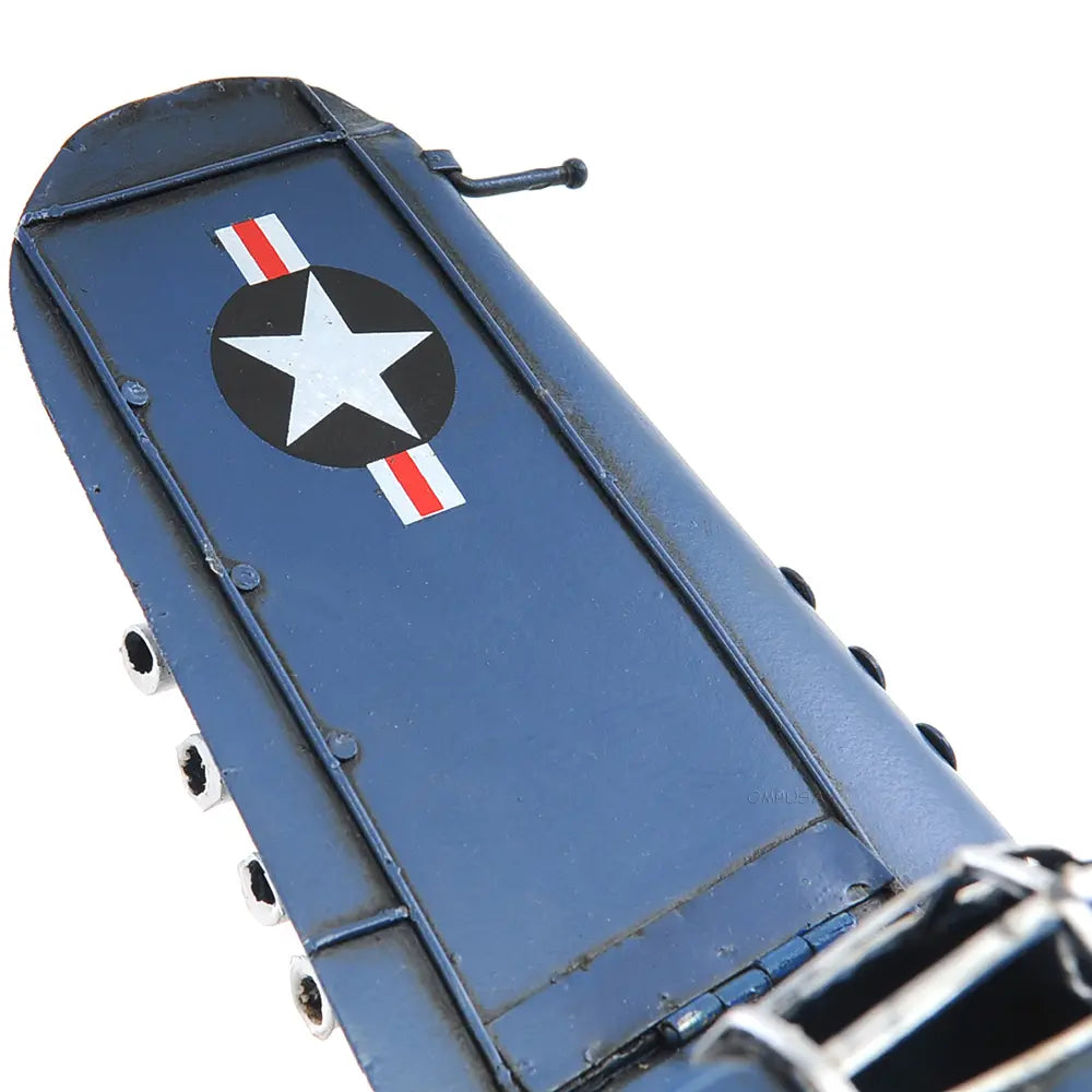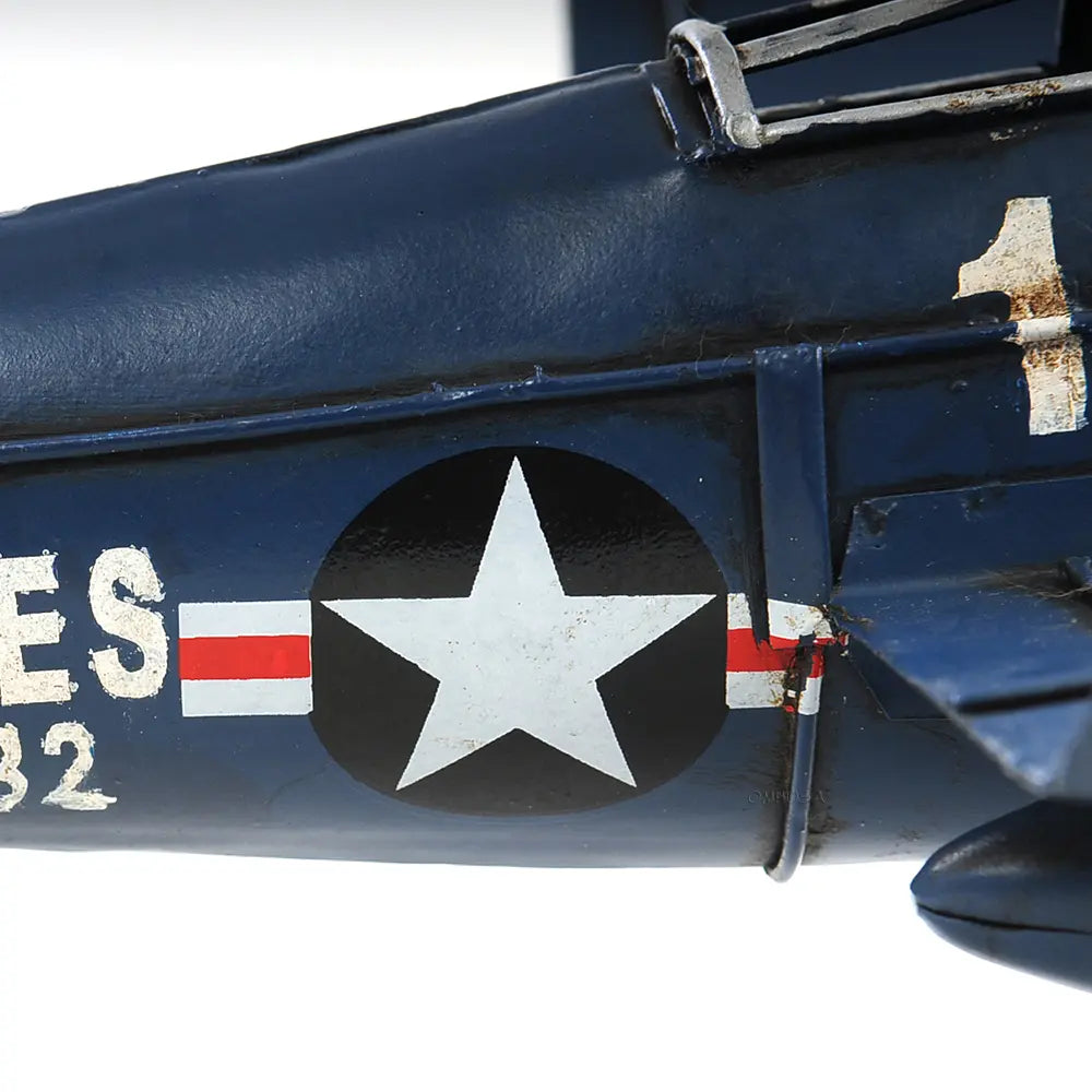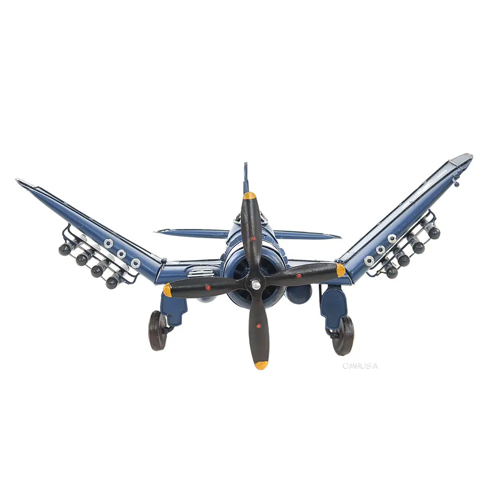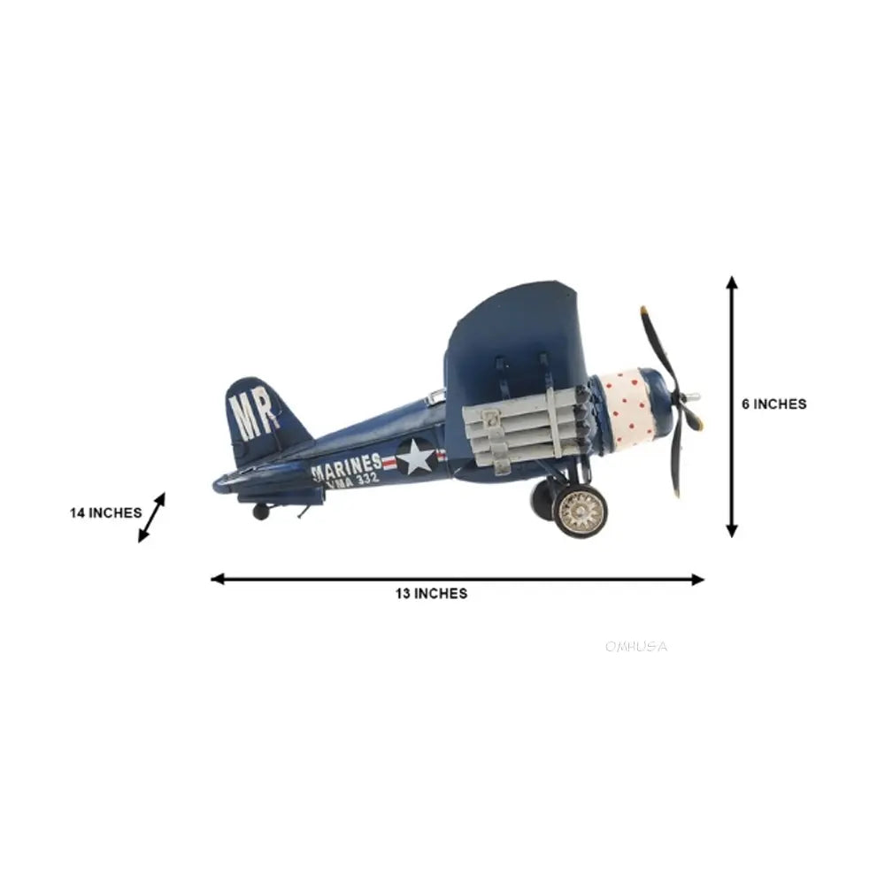 Take flight into history with the Old Modern Handicrafts 1944 F4U Corsair 1:31 Scale Model, a handcrafted tribute to one of WWII’s most iconic fighter aircraft. Expertly made from 100% iron, this vintage collectible features authentic military detailing including a spinning metal propeller, rolling wheels, hinged wings, and welded components like the landing gear, bomb, and drop fuel tank. With a bold blue finish and realistic insignias, the Corsair model brings a rugged yet refined presence to any home, office, or aviation-themed display. Measuring 13" long × 14" wide × 6" high, it’s the perfect conversation piece for collectors and enthusiasts alike.