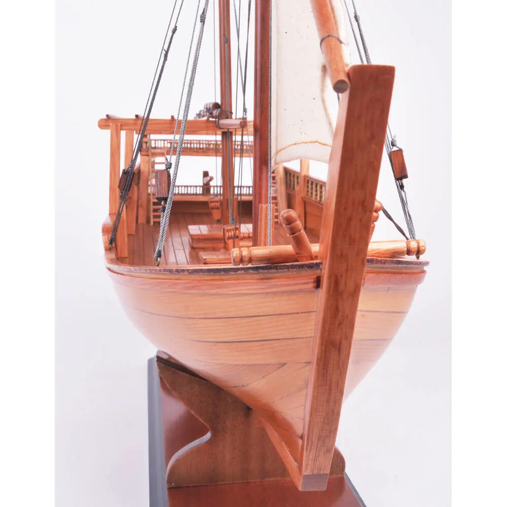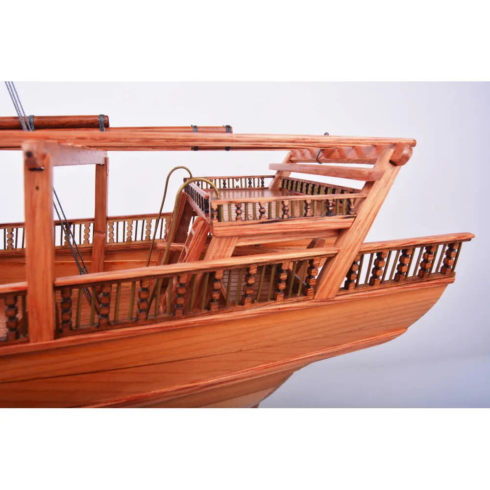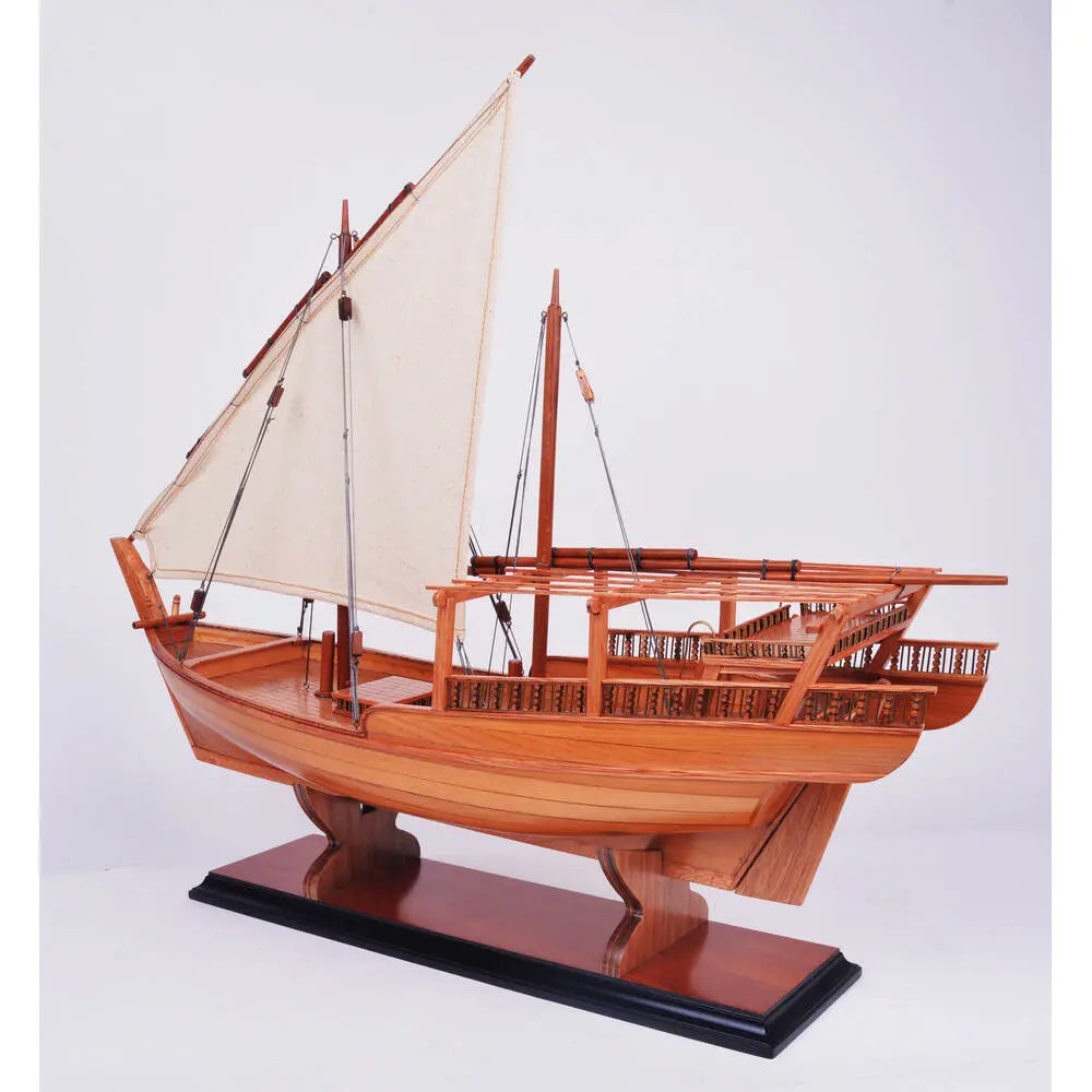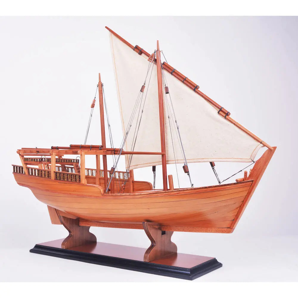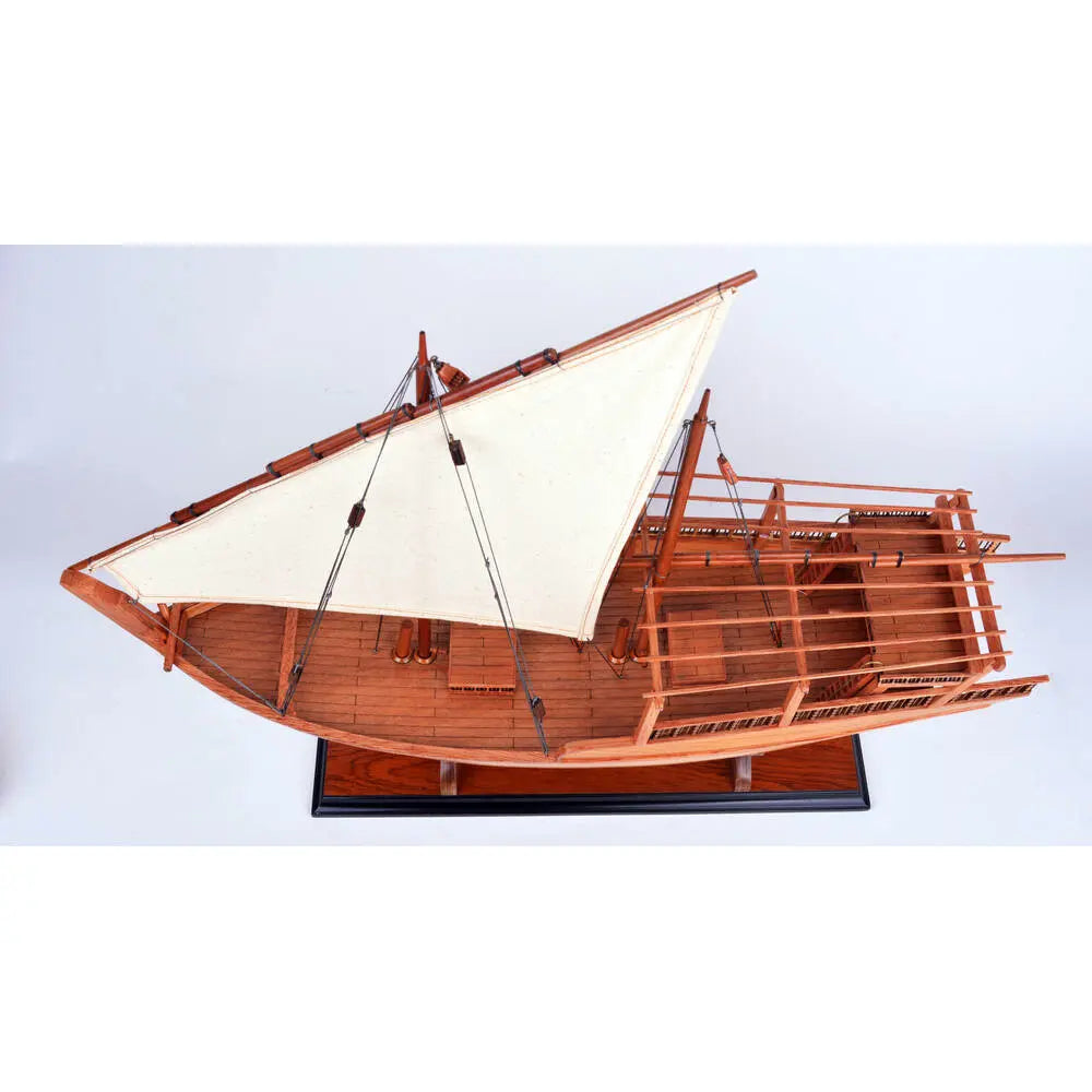 Constructed from rich red cedar wood, each model features hand-stitched linen sails, knotted rigging, and detailed wooden rudder and railings. Its triangular masts, traditional bowsprit, and hand-finished matte wood grain embody the signature design of iconic dhows once used for trade, exploration, and cultural exchange.