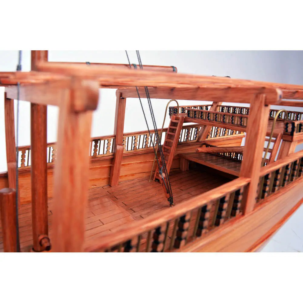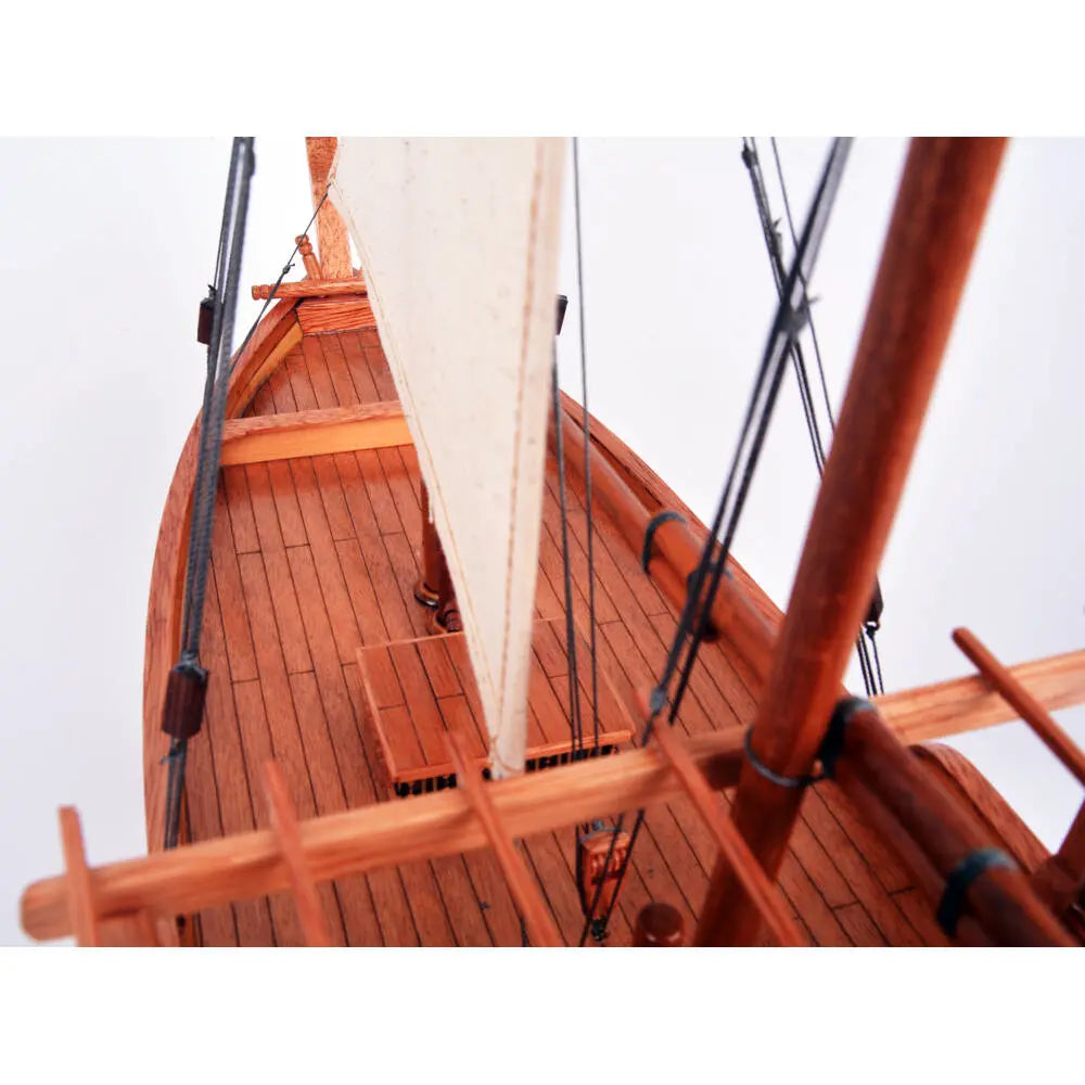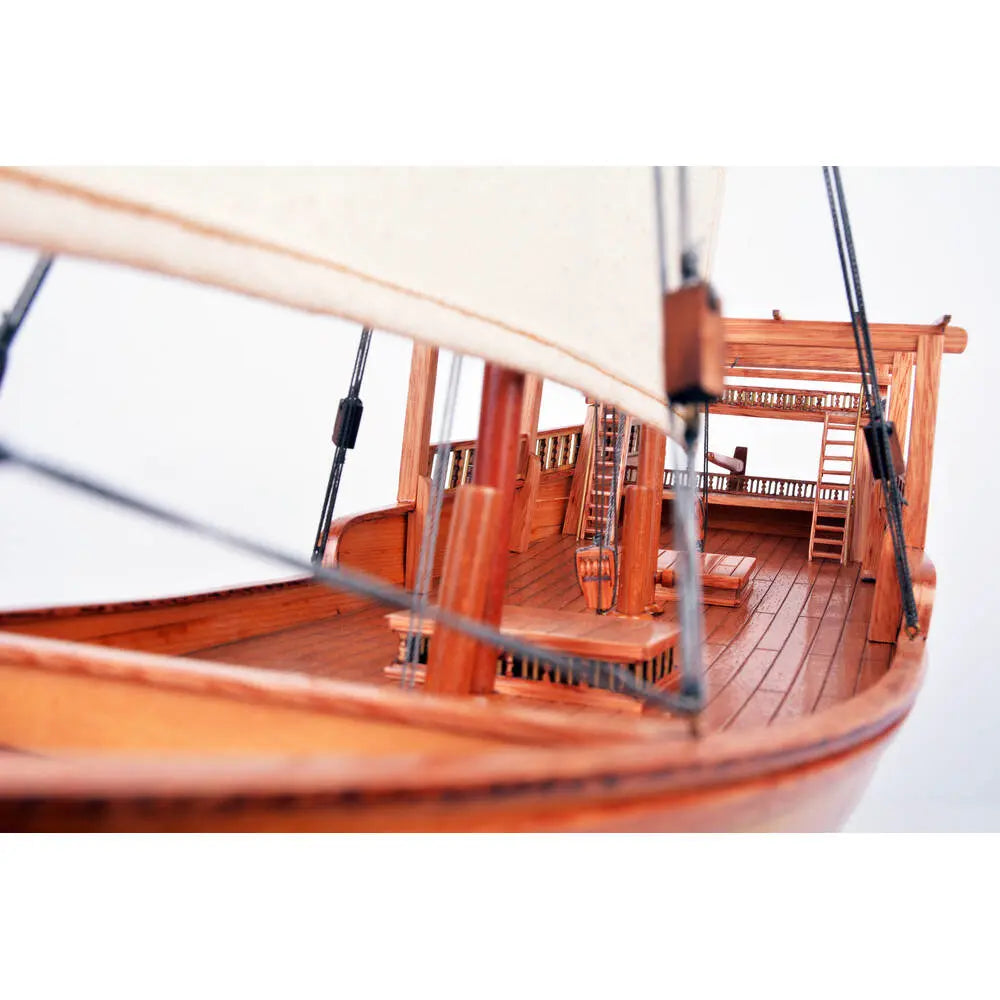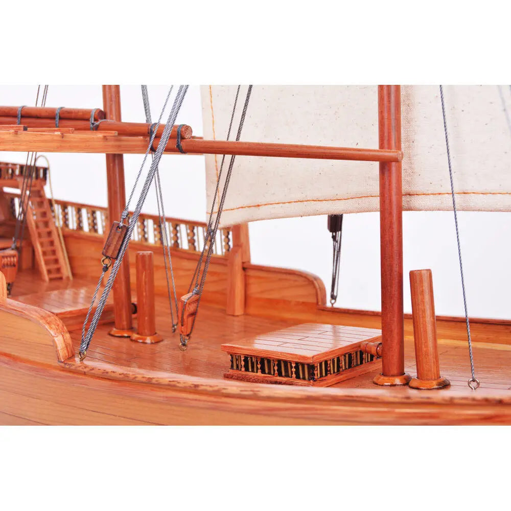 Constructed from rich red cedar wood, each model features hand-stitched linen sails, knotted rigging, and detailed wooden rudder and railings. Its triangular masts, traditional bowsprit, and hand-finished matte wood grain embody the signature design of iconic dhows once used for trade, exploration, and cultural exchange.