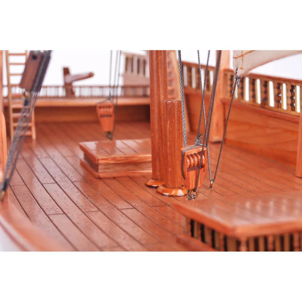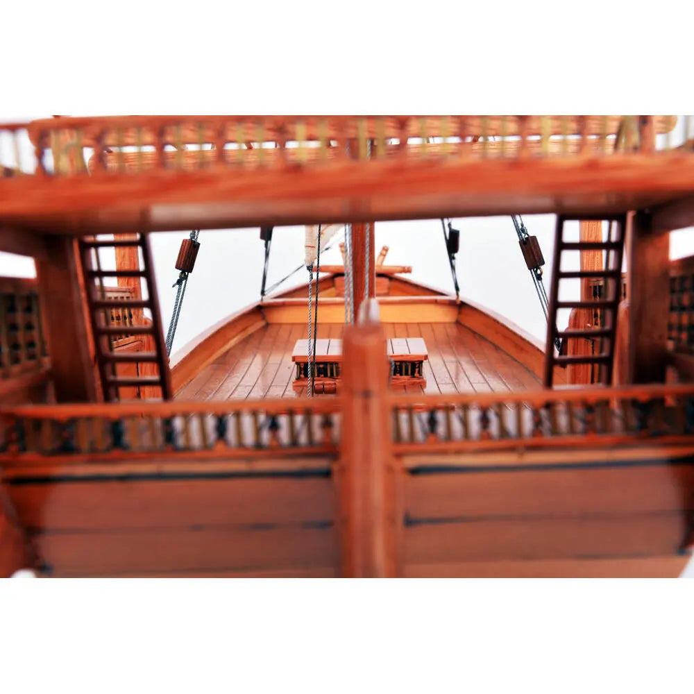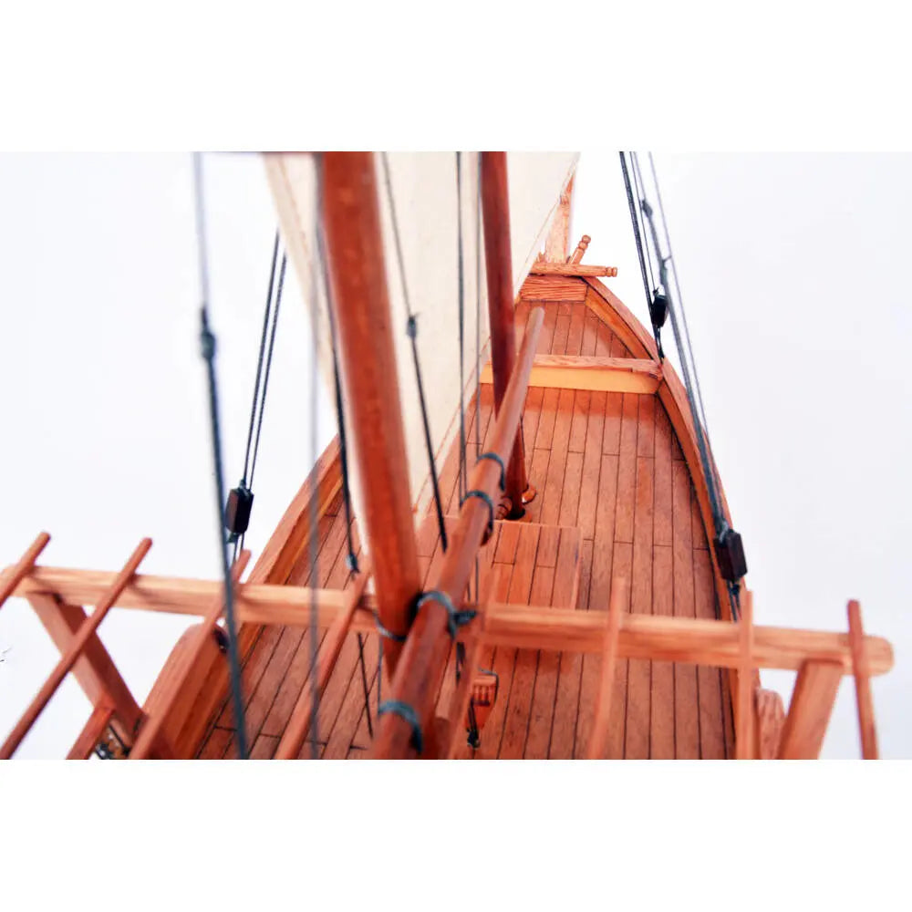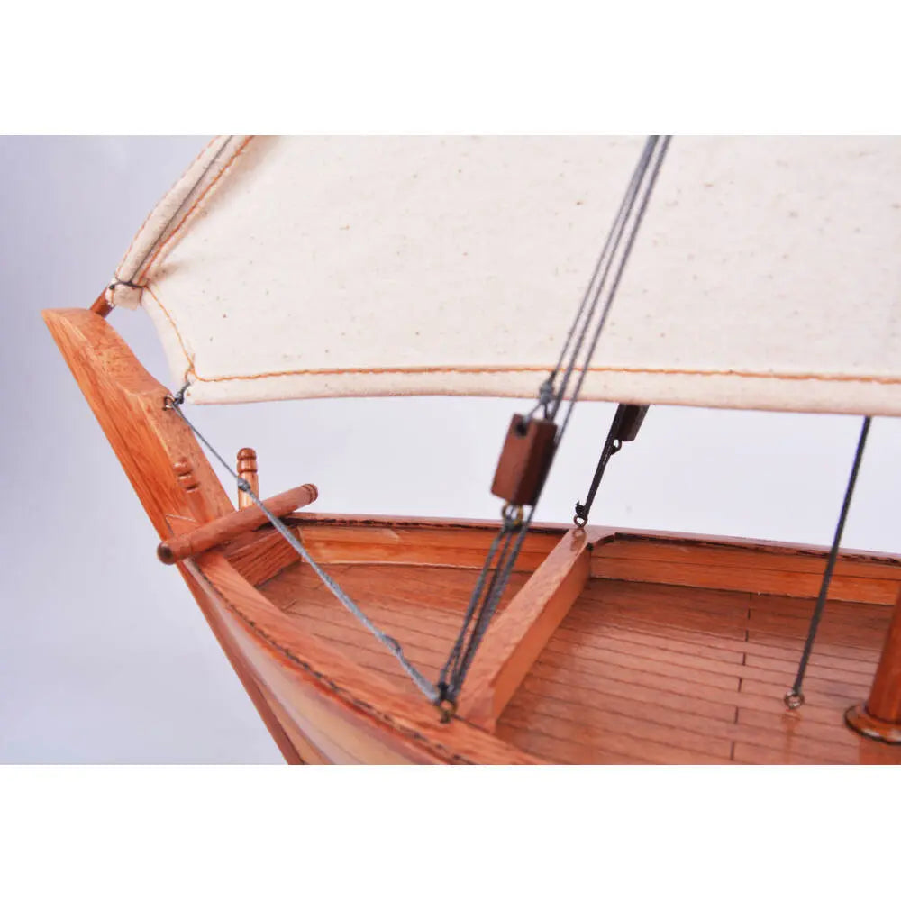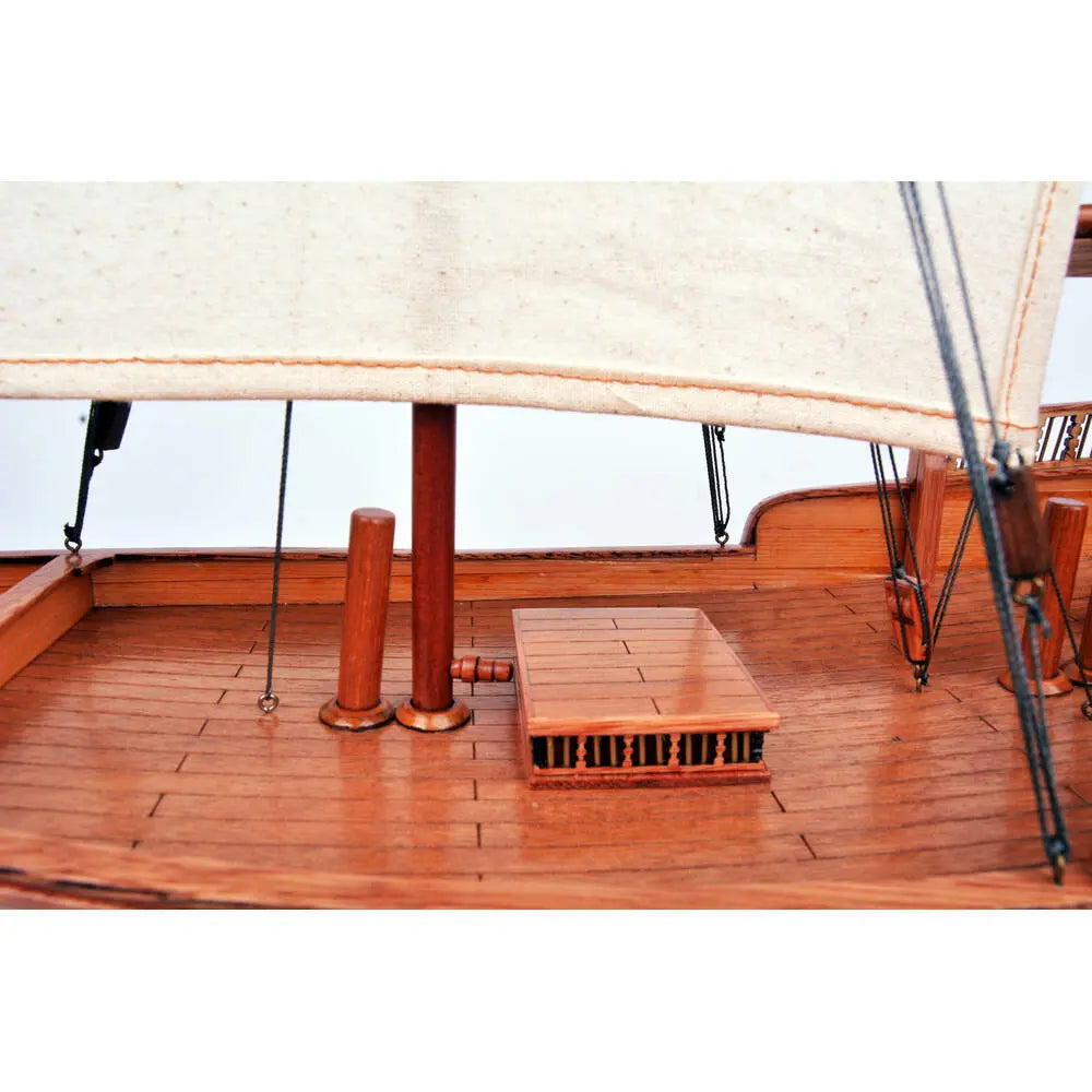 Constructed from rich red cedar wood, each model features hand-stitched linen sails, knotted rigging, and detailed wooden rudder and railings. Its triangular masts, traditional bowsprit, and hand-finished matte wood grain embody the signature design of iconic dhows once used for trade, exploration, and cultural exchange.