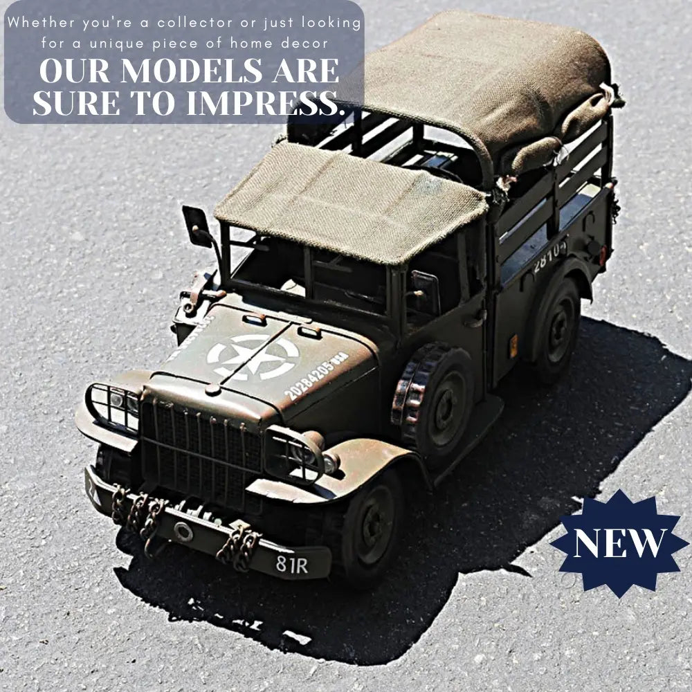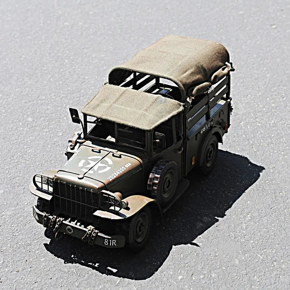 Drive back in time with this iconic 1950’s M42 Command Truck from the World War II era. Handcrafted of iron with a scale of 1:14. This Dodge M42 model comes with fine details such as wheels, hood, headlights, fenders, and split rear end curtains. A must have for the collector and enthusiast! • 100% iron frame • Metal wheels • Wheels roll • Decaled insignia • Includes seats, steering wheel, stick shift, and small details on dash • Exterior details such as chain, axe, and shovel are securely welded on • Rear top cover is made of fabric material for more authentic look