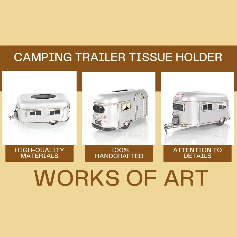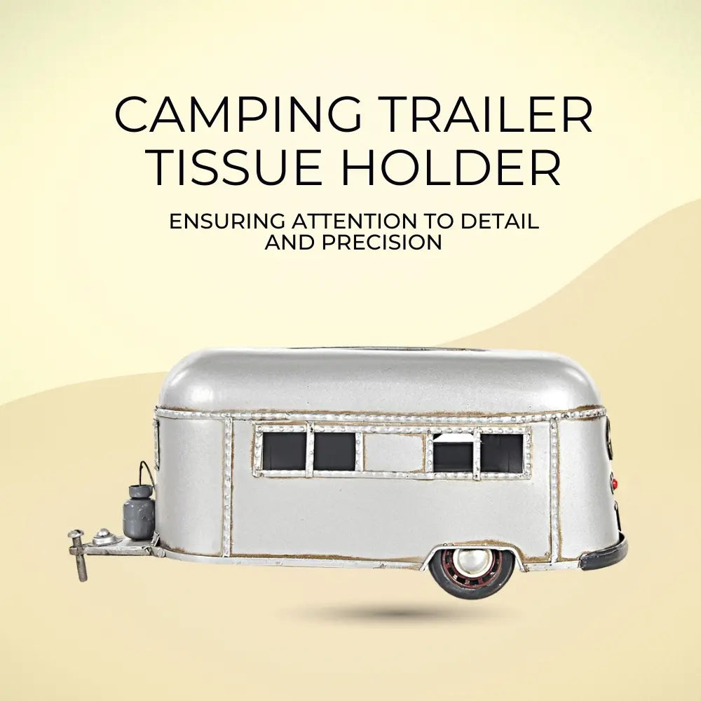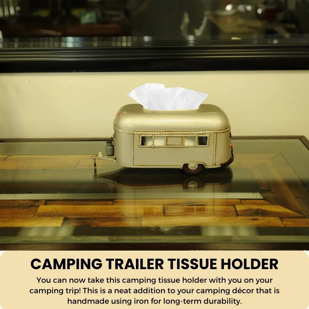 Bring adventure to your home or RV with this Camping Trailer Tissue Holder – 4.5 Inch Height. Handcrafted from durable iron, this unique piece doubles as a functional tissue or napkin dispenser and a charming decorative accent. Designed like a miniature travel trailer, it features movable wheels and a hidden bottom door for easy access. Perfect for kitchens, campers, or living spaces, it arrives fully assembled and ready to use. This playful yet sturdy design adds a rustic camping touch to any setting while keeping your tissues neatly stored and within reach. (Tissues not included.)