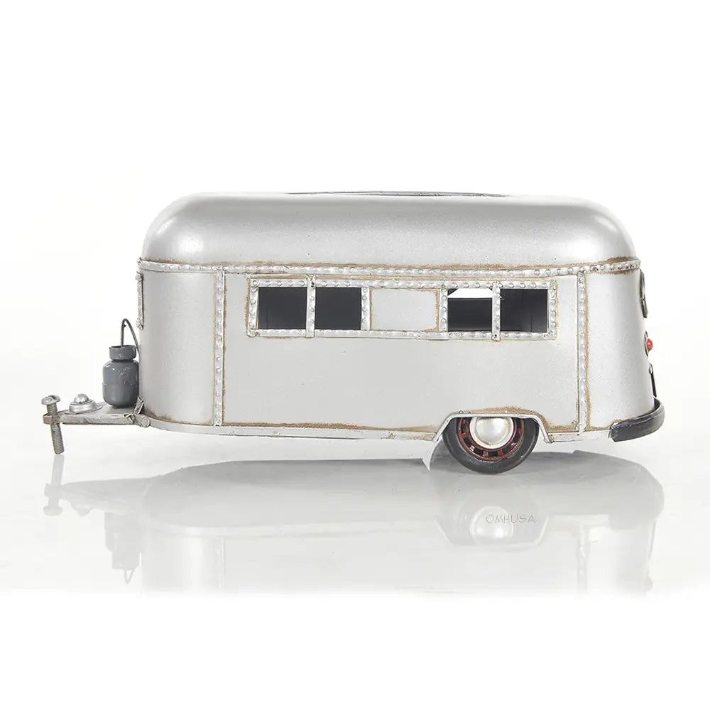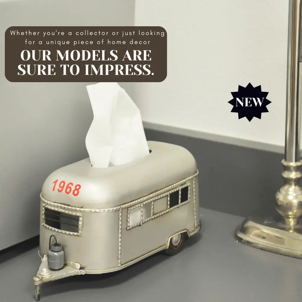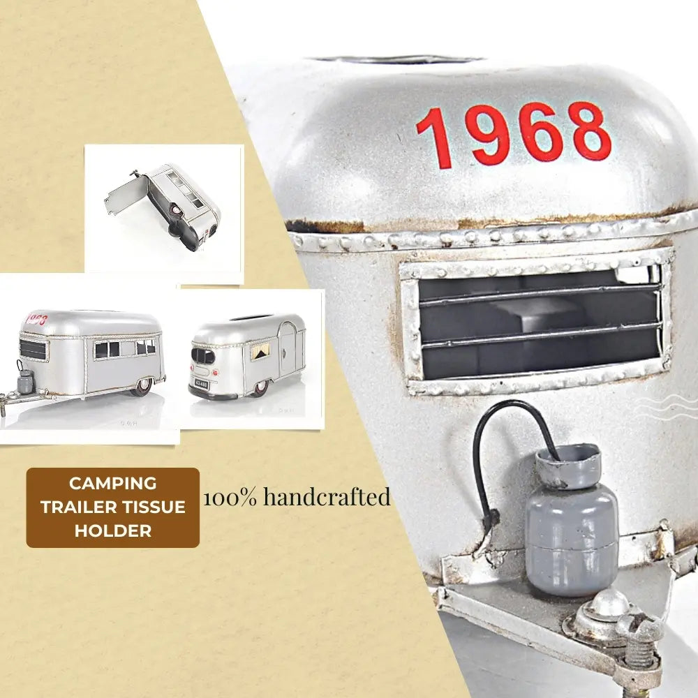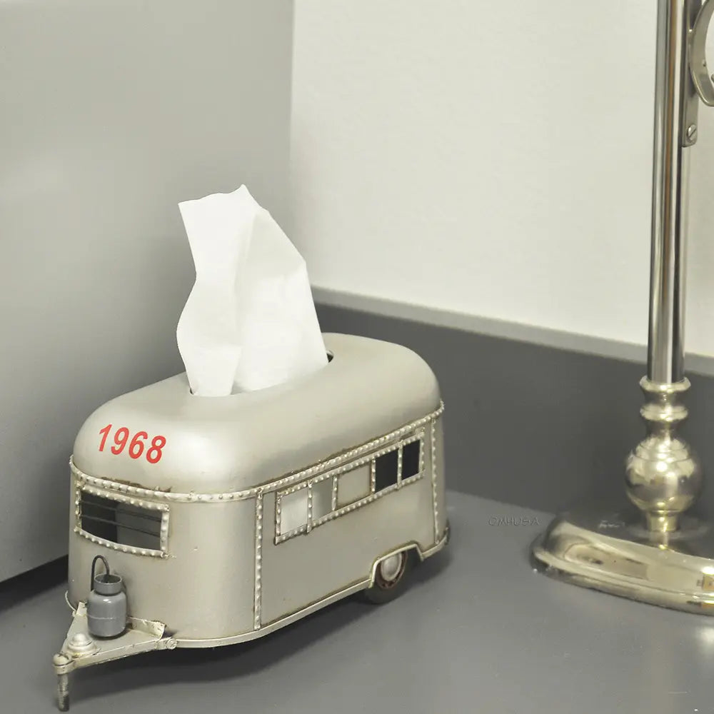 Bring adventure to your home or RV with this Camping Trailer Tissue Holder – 4.5 Inch Height. Handcrafted from durable iron, this unique piece doubles as a functional tissue or napkin dispenser and a charming decorative accent. Designed like a miniature travel trailer, it features movable wheels and a hidden bottom door for easy access. Perfect for kitchens, campers, or living spaces, it arrives fully assembled and ready to use. This playful yet sturdy design adds a rustic camping touch to any setting while keeping your tissues neatly stored and within reach. (Tissues not included.)