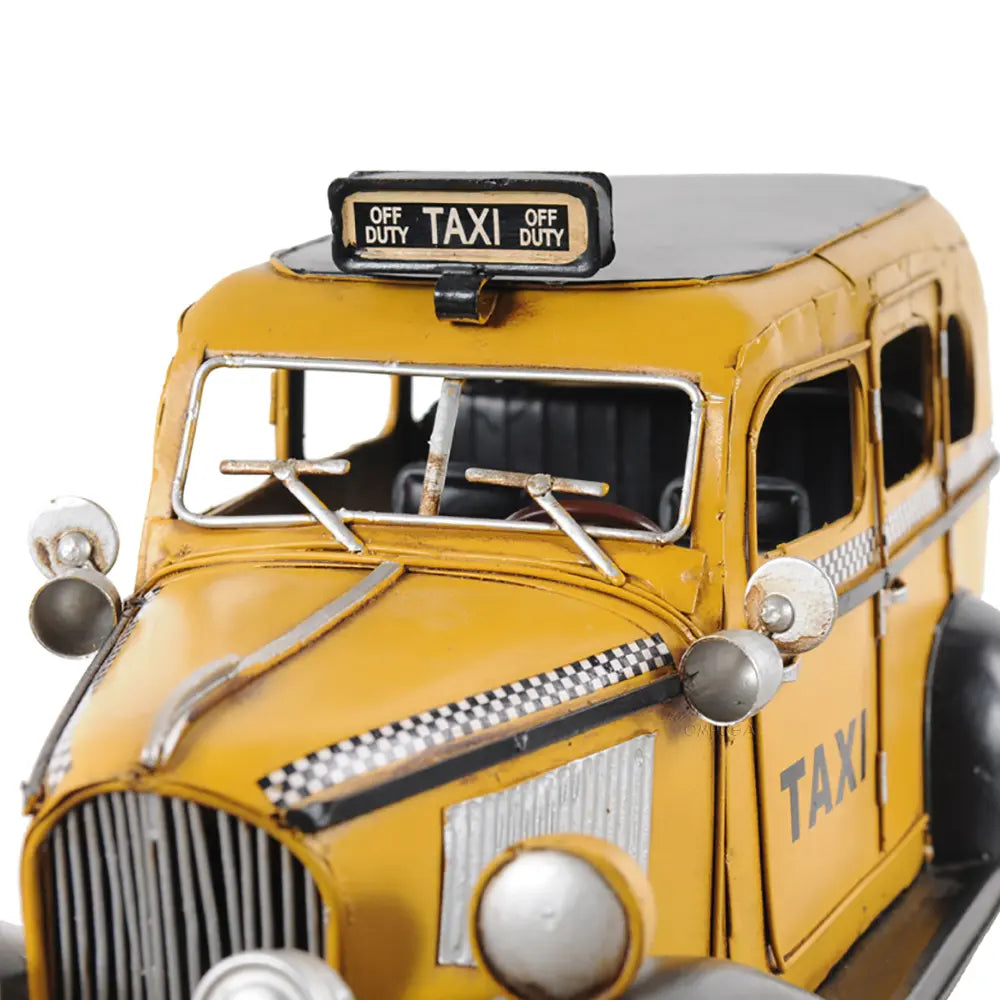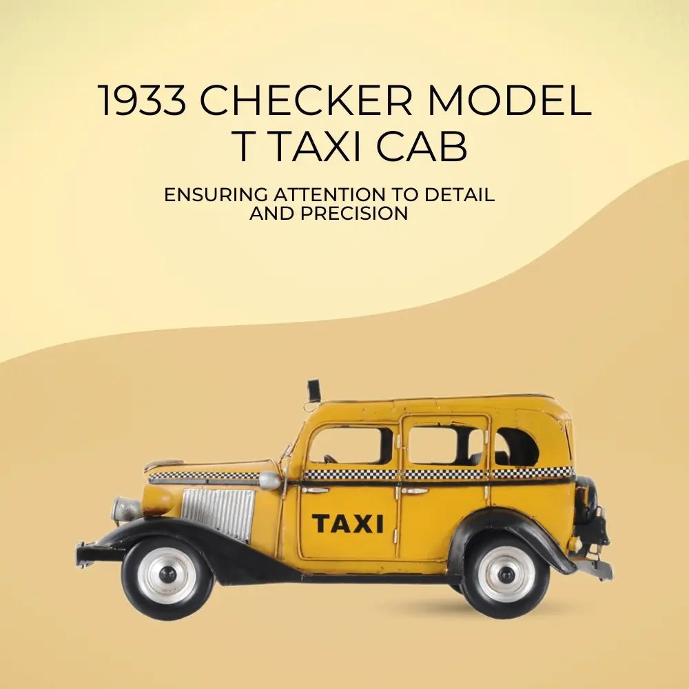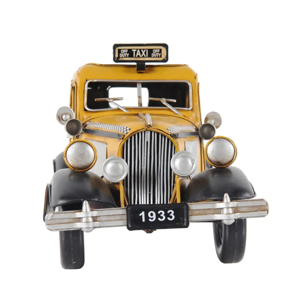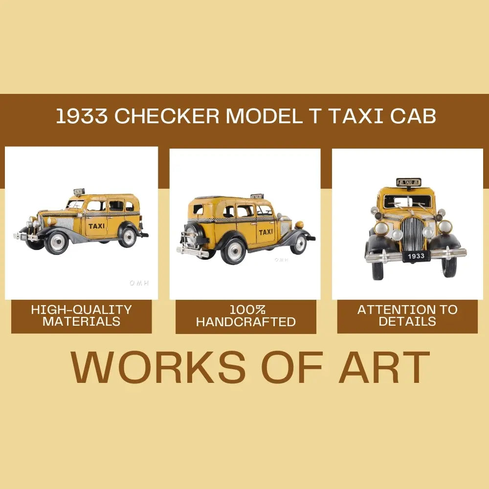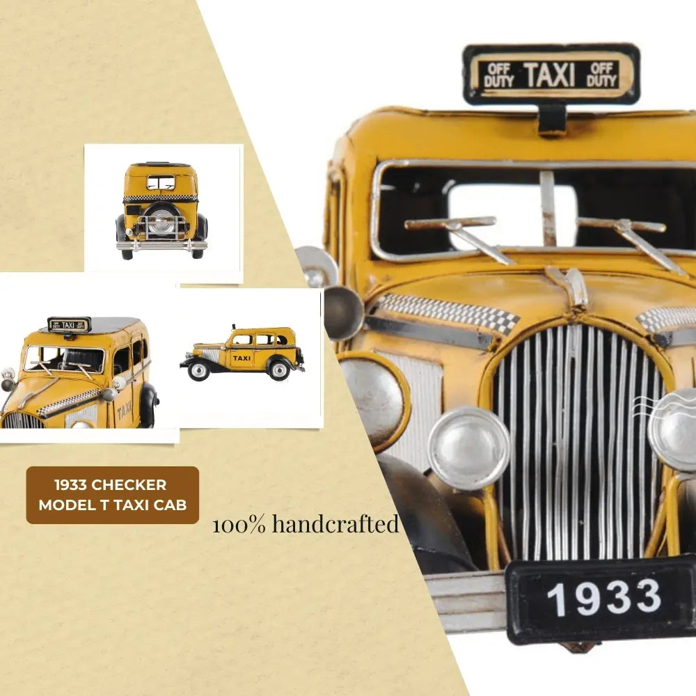 Taxi, taxi! This handmade replica of the Model T replicates the famous 8-cylinder Lycoming-powered cab of 1933 to scale. Admire true-to-life details like full-length running boards, traditional headlights, and unusual circular inserts over its otherwise traditional hood louvers. Handcrafted from iron, this model features many intricate parts such as detailed fenders, wheels, hood, grills, taxi sign, and a signature 1933 license plate. An ideal gift for fans of cars, cabs, and the Big Apple. • 100% iron frame and made by hand • Rolling metal wheels • Exterior details are securely welded on • Scale of 1:8