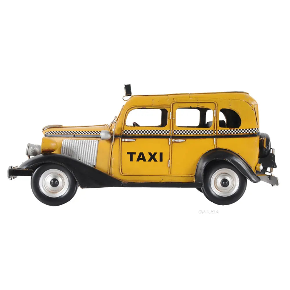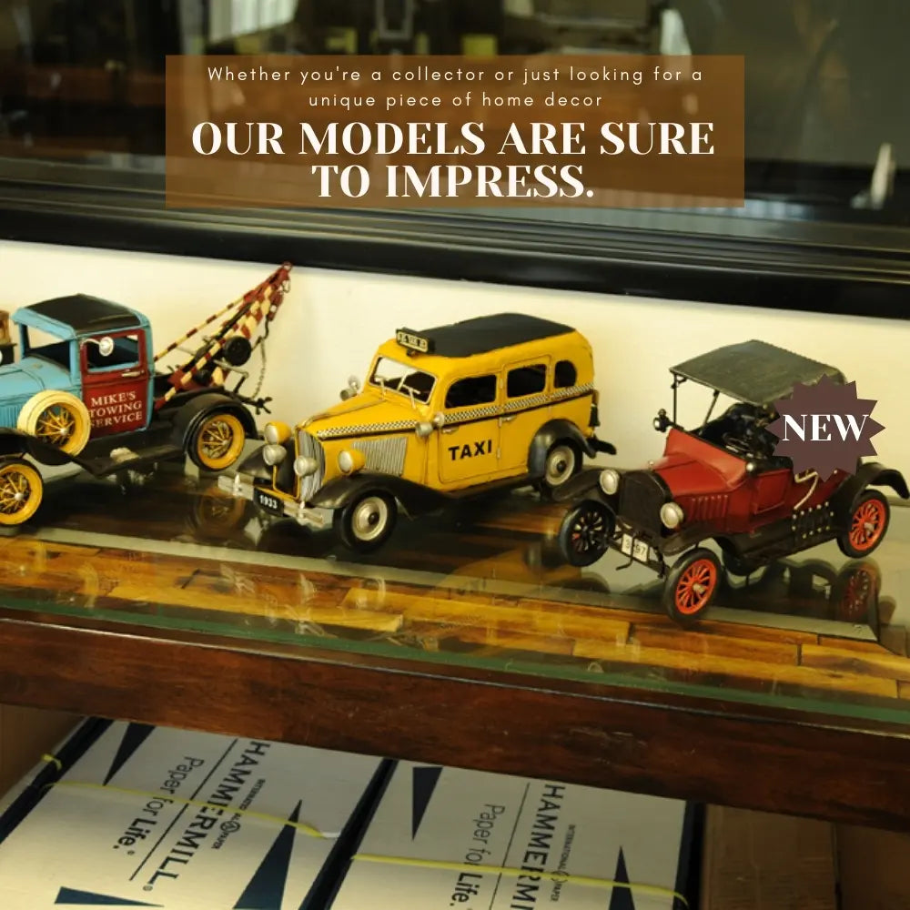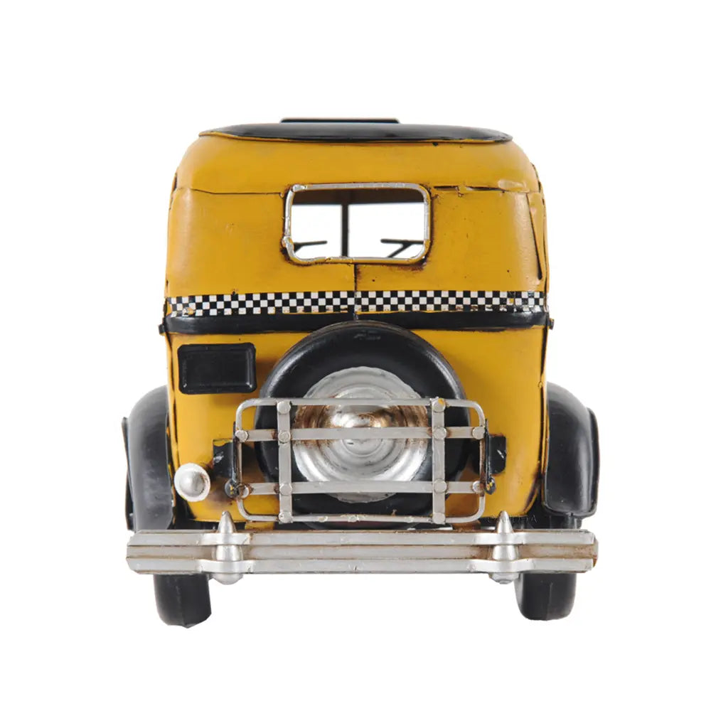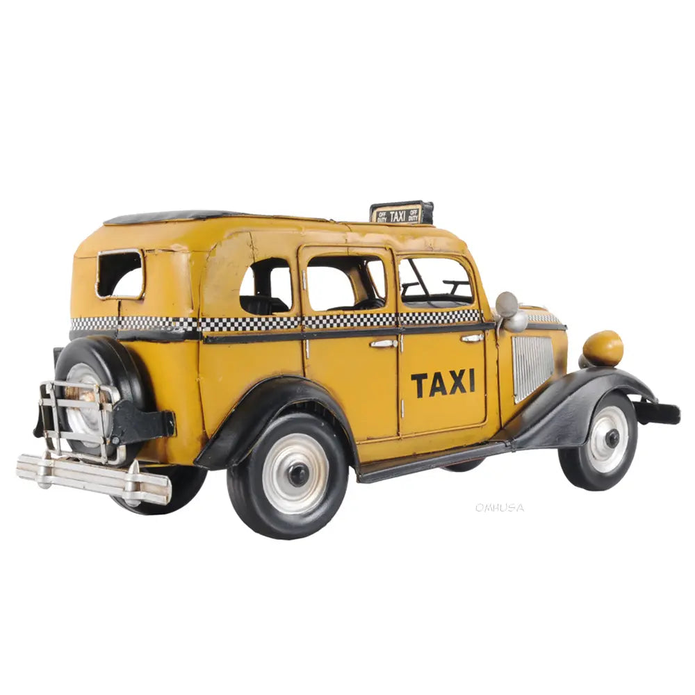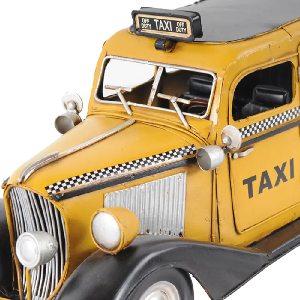 Taxi, taxi! This handmade replica of the Model T replicates the famous 8-cylinder Lycoming-powered cab of 1933 to scale. Admire true-to-life details like full-length running boards, traditional headlights, and unusual circular inserts over its otherwise traditional hood louvers. Handcrafted from iron, this model features many intricate parts such as detailed fenders, wheels, hood, grills, taxi sign, and a signature 1933 license plate. An ideal gift for fans of cars, cabs, and the Big Apple. • 100% iron frame and made by hand • Rolling metal wheels • Exterior details are securely welded on • Scale of 1:8