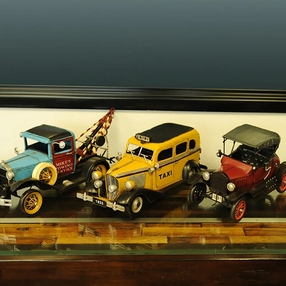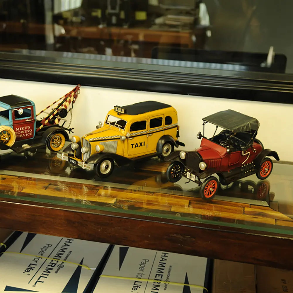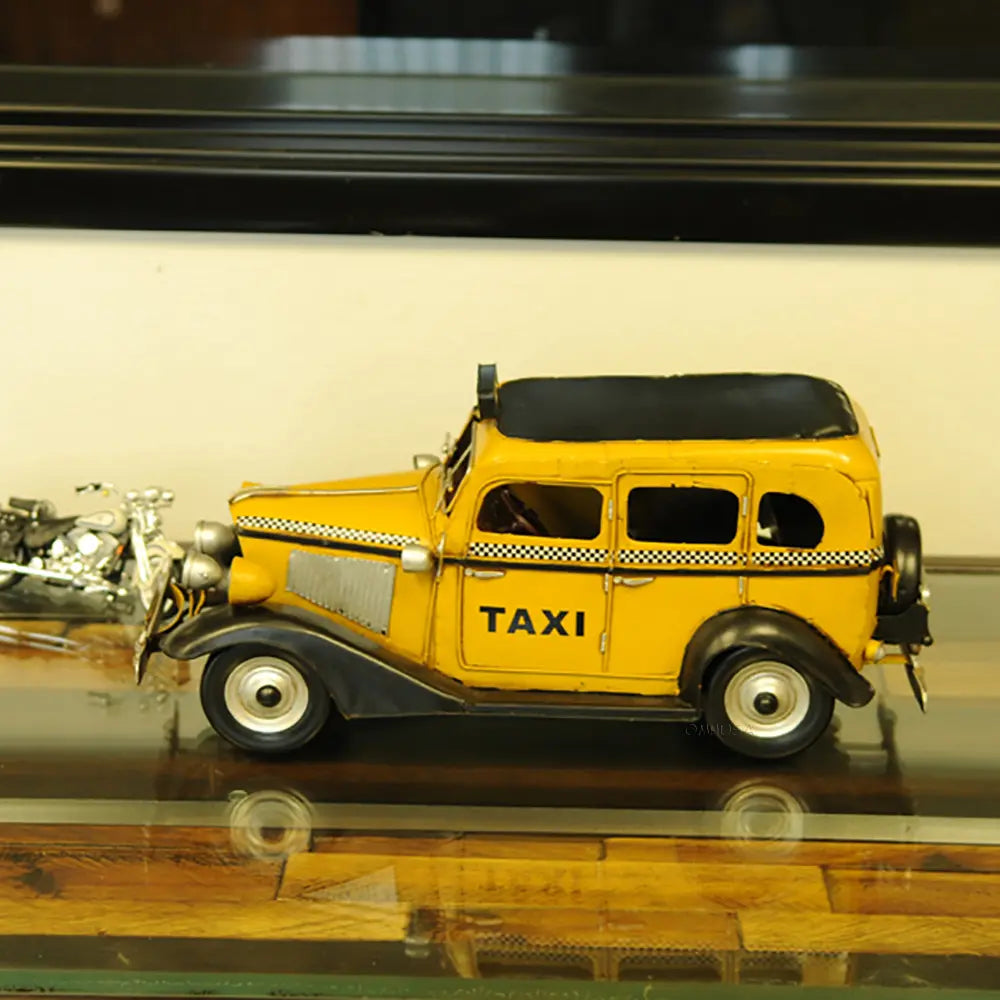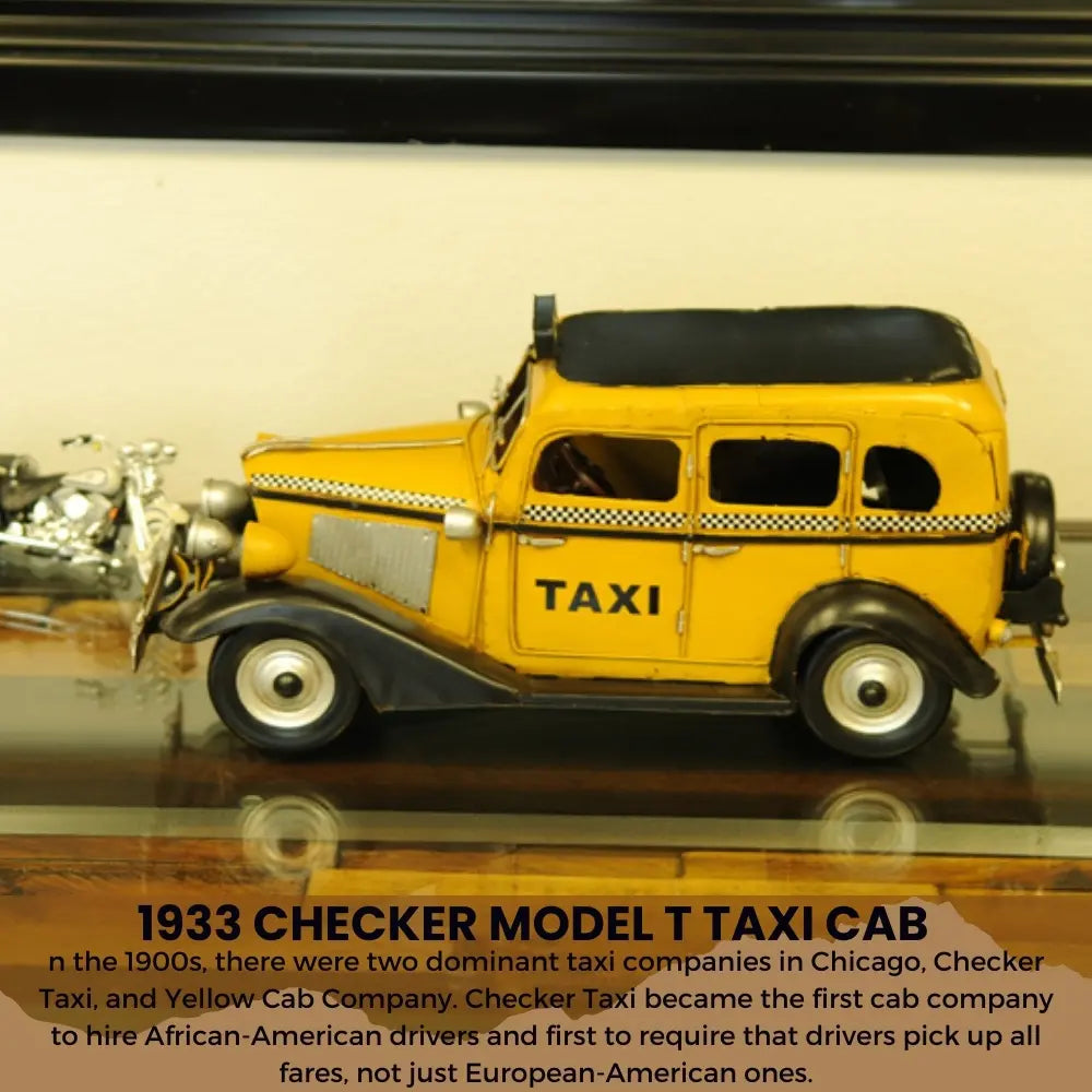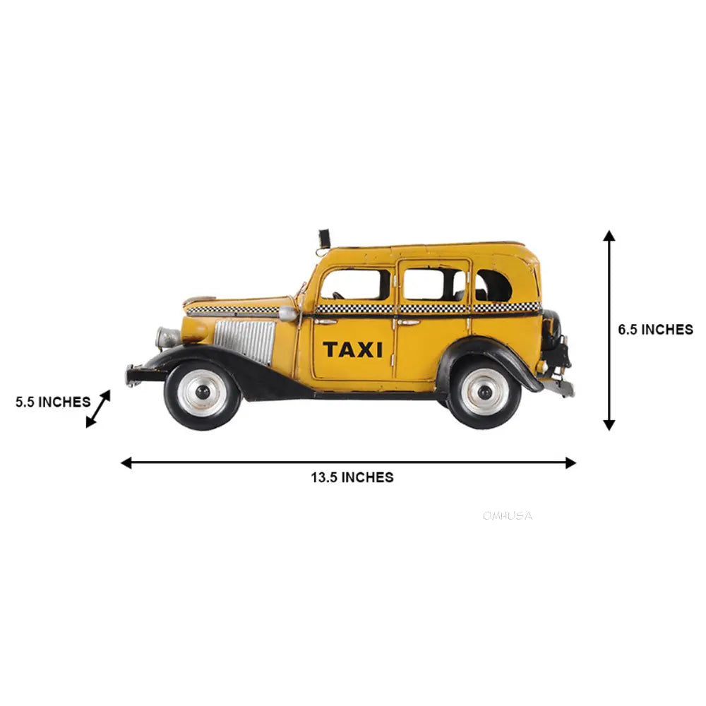 Taxi, taxi! This handmade replica of the Model T replicates the famous 8-cylinder Lycoming-powered cab of 1933 to scale. Admire true-to-life details like full-length running boards, traditional headlights, and unusual circular inserts over its otherwise traditional hood louvers. Handcrafted from iron, this model features many intricate parts such as detailed fenders, wheels, hood, grills, taxi sign, and a signature 1933 license plate. An ideal gift for fans of cars, cabs, and the Big Apple. • 100% iron frame and made by hand • Rolling metal wheels • Exterior details are securely welded on • Scale of 1:8