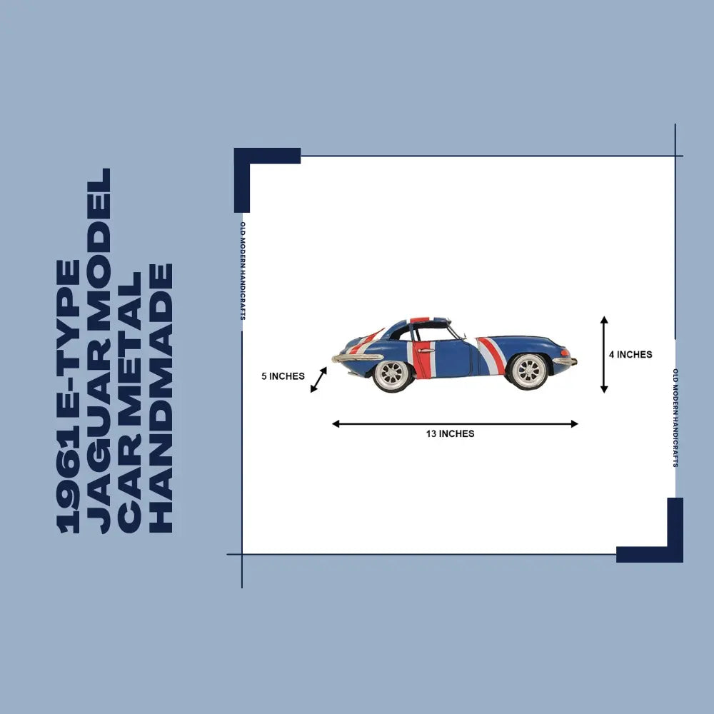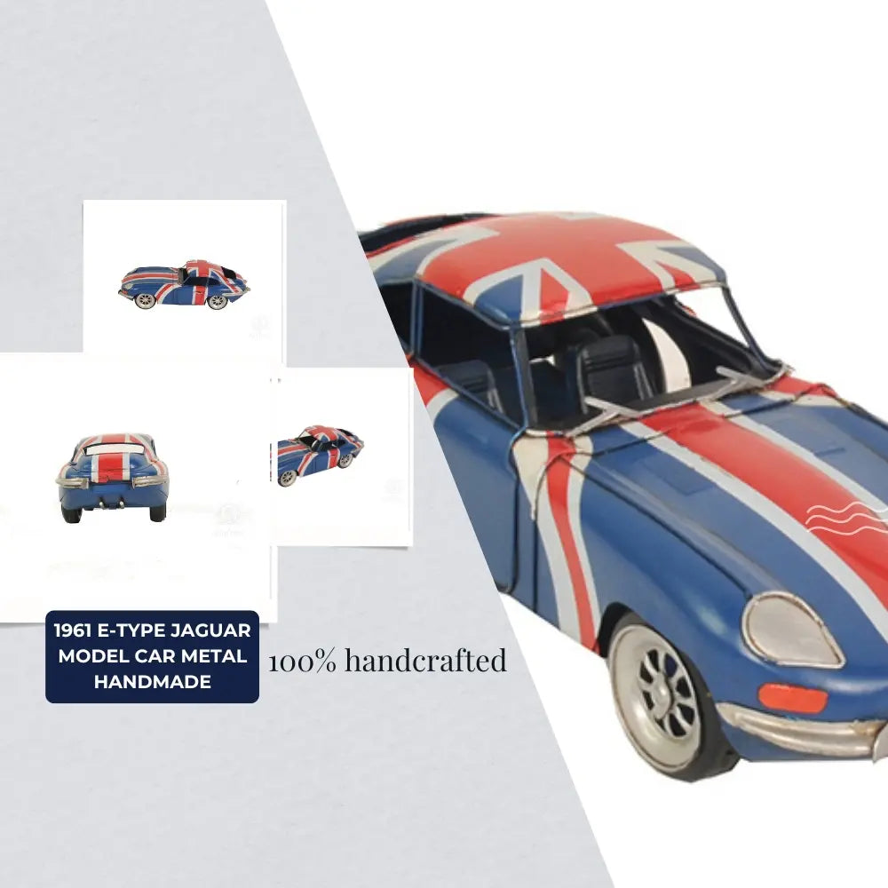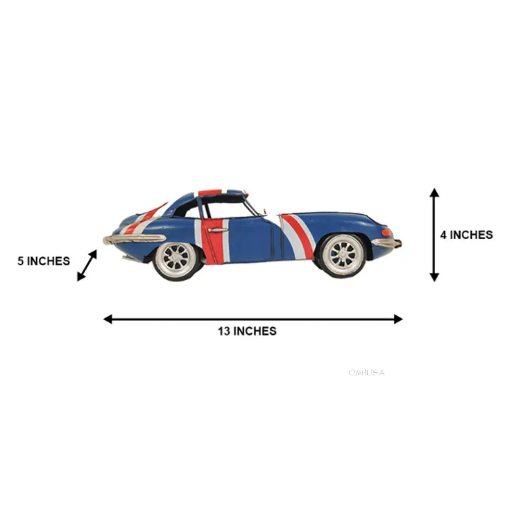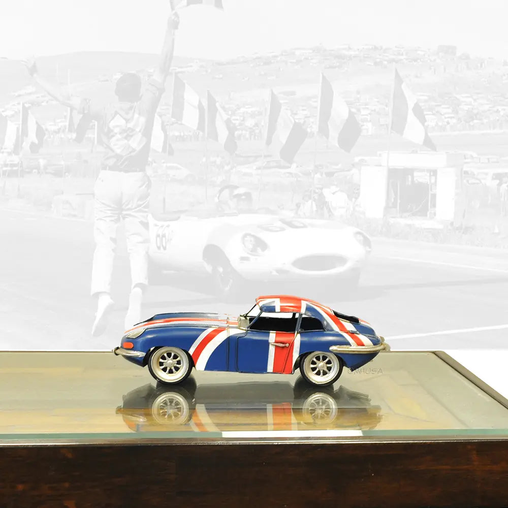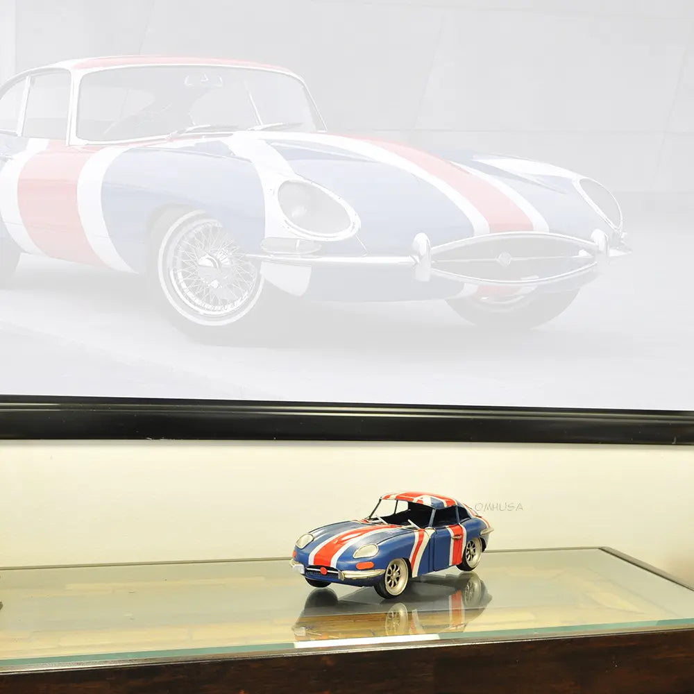 Old Modern Handicrafts 1961 E-Type Jaguar Model Car – Handmade Iron, British Flag Paint, 13" Length