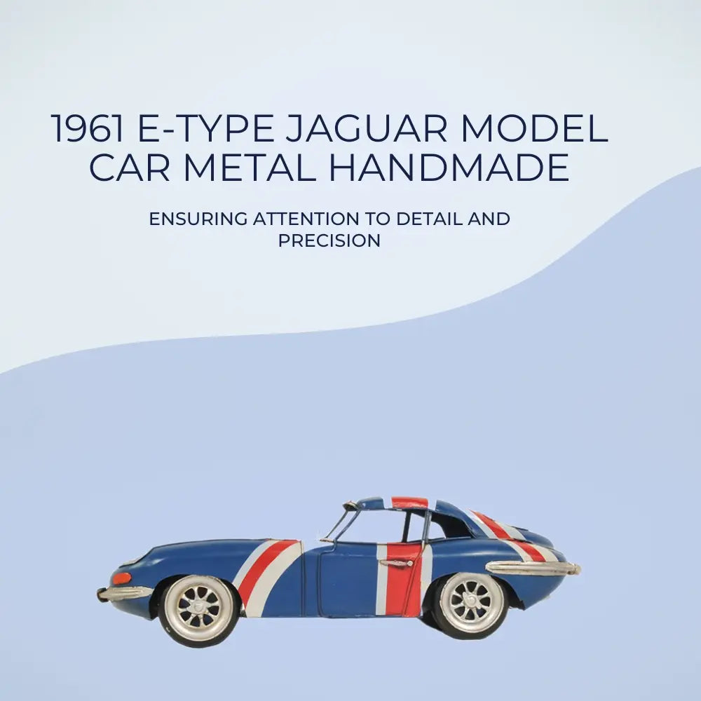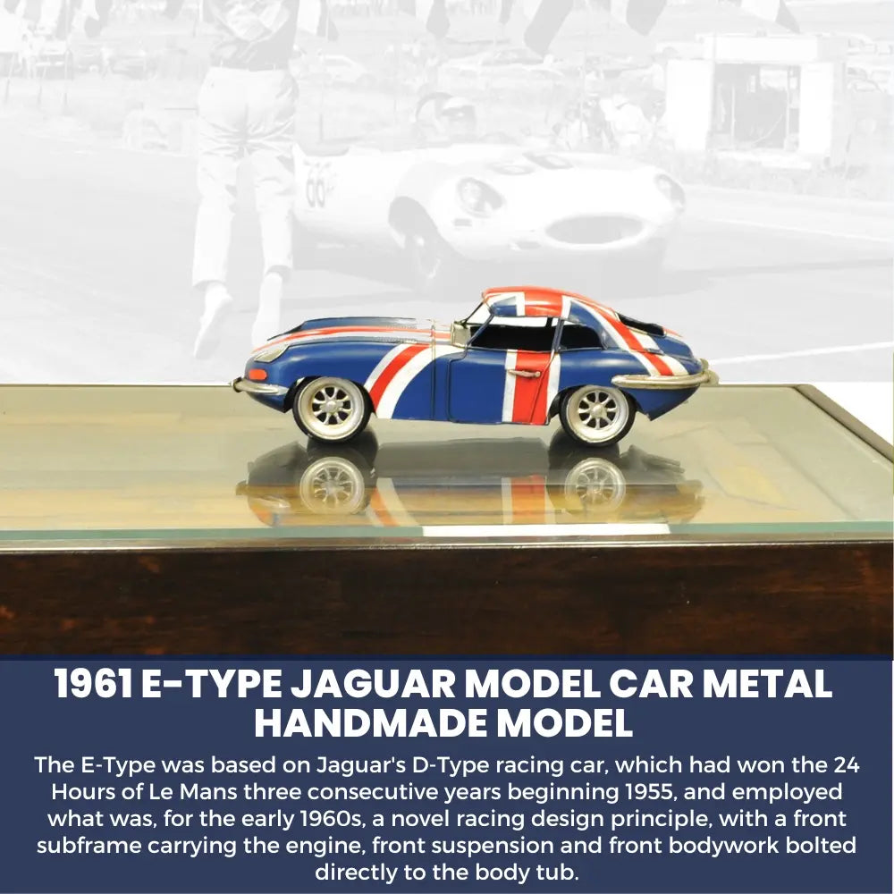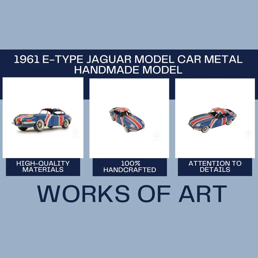The Jaguar E-Type, or the Jaguar XK-E for the North American market, is a British sports car that was manufactured by Jaguar Cars Ltd between 1961 and 1975. Its combination of beauty, high performance, and competitive pricing established the model as an icon of the motoring world. This 1961 E-Type model is handmade in iron frame and painted with a British flag color scheme. The model has seats as well as a steering wheel and minor details on the dash. The exterior details such as wheels, headlights, turn signals, front and rear bumper reinforcement are securely welded on. This famous Jaguar E-Type was a feature in Austin Powers films and the television series Mad Men. It is also ranked in The Daily Telegraph online list of the world's "100 most beautiful cars" of all time! A must-have for the collector and enthusiast!