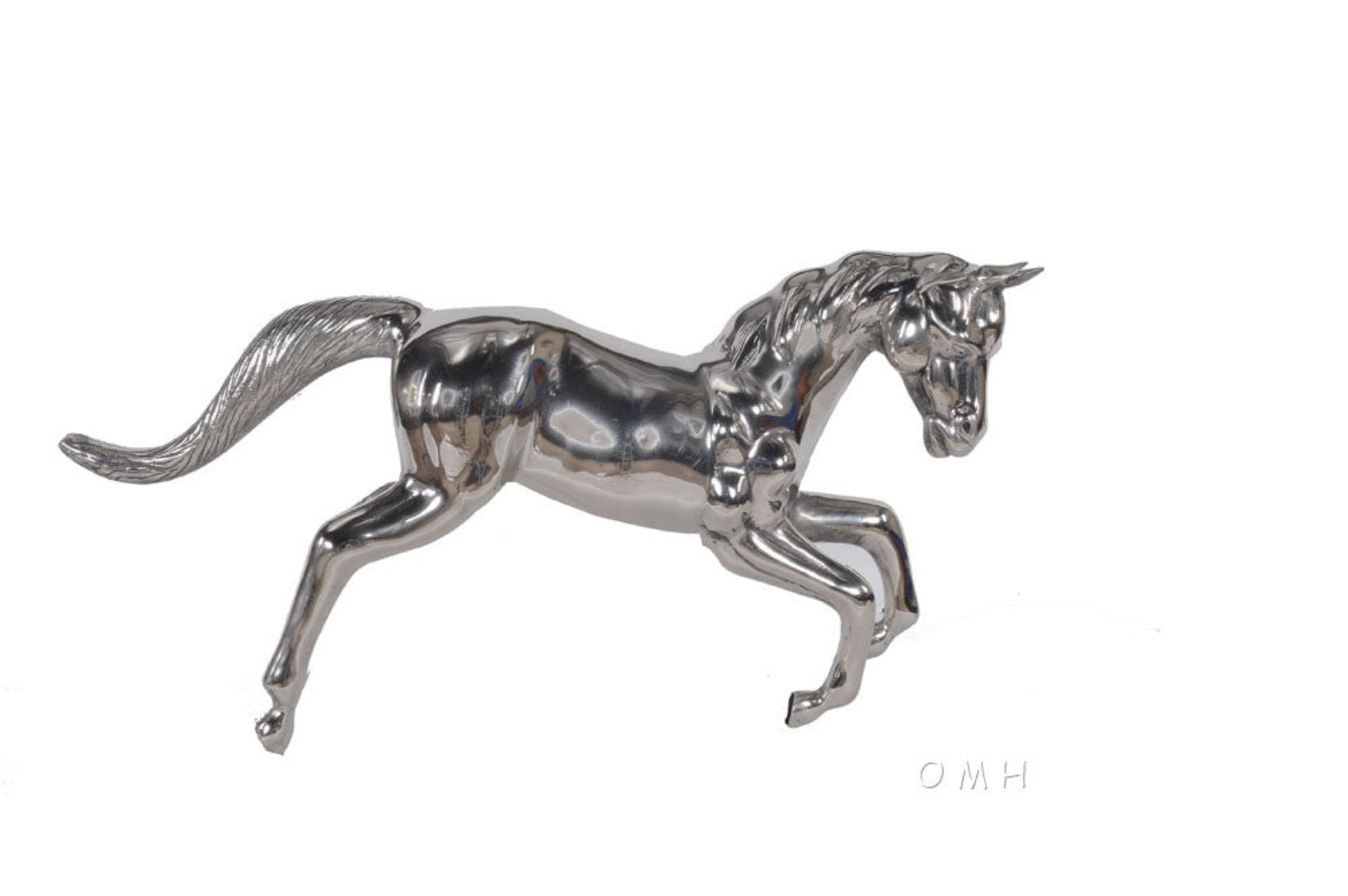Make a bold statement with this large handcrafted horse statue, standing at 19" H. Symbolizing power, passion, and freedom, the statue is made from 100% hand-cast solid aluminum and finished with a sleek nickel plating. Every curve and detail is hand polished to a brilliant luster, giving it a striking presence in any room. Ideal for living rooms, offices, or entryways, this piece reflects both strength and elegance. Whether you’re a collector or a décor enthusiast, this sculpture offers timeless style and enduring quality.