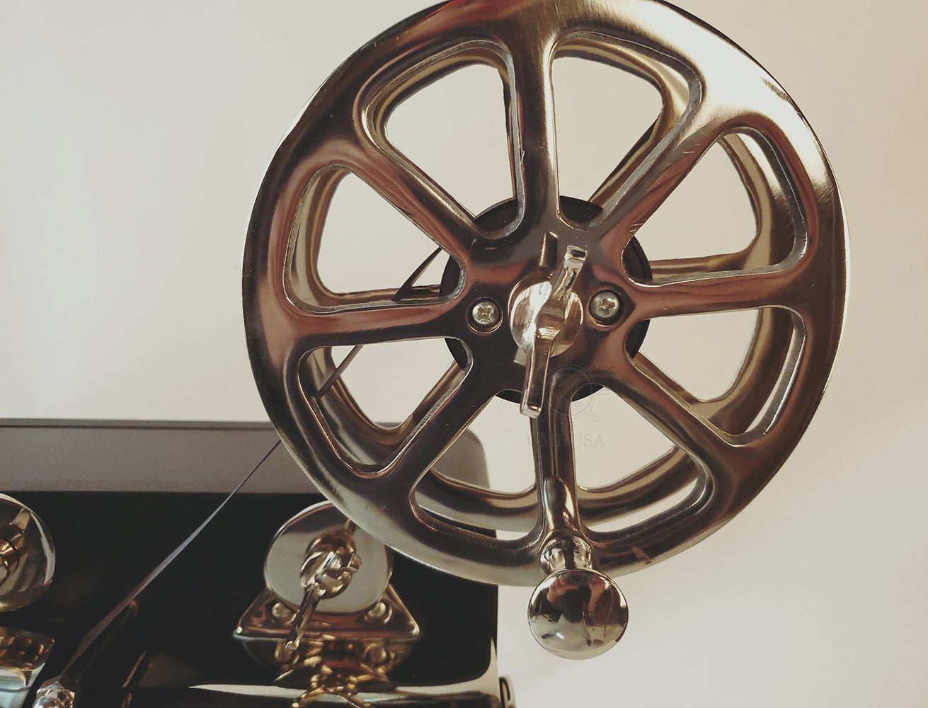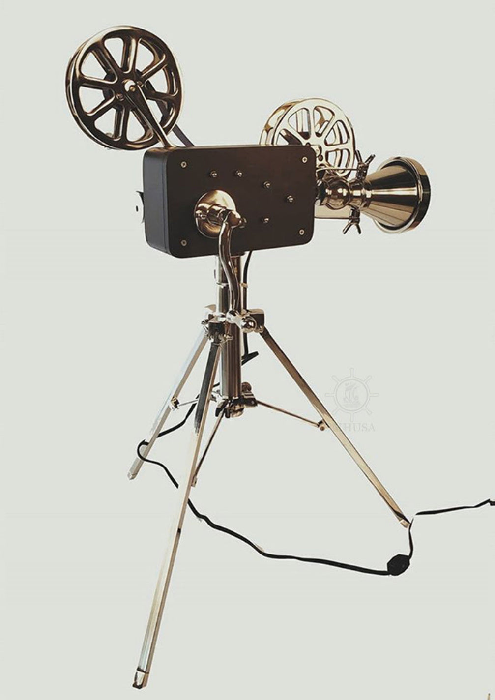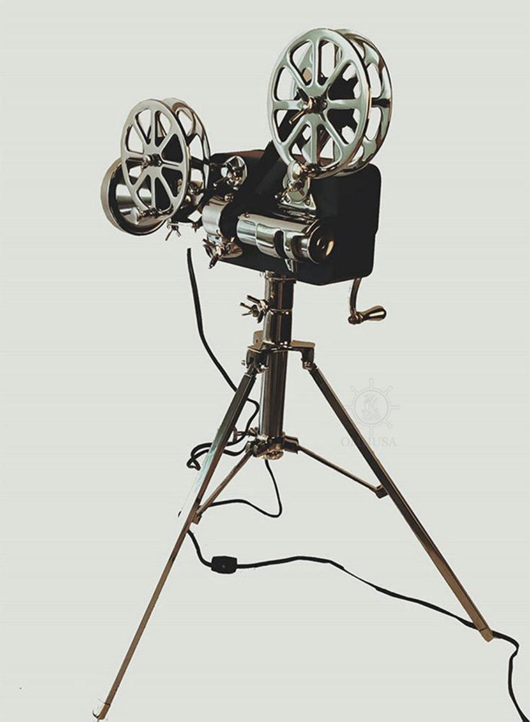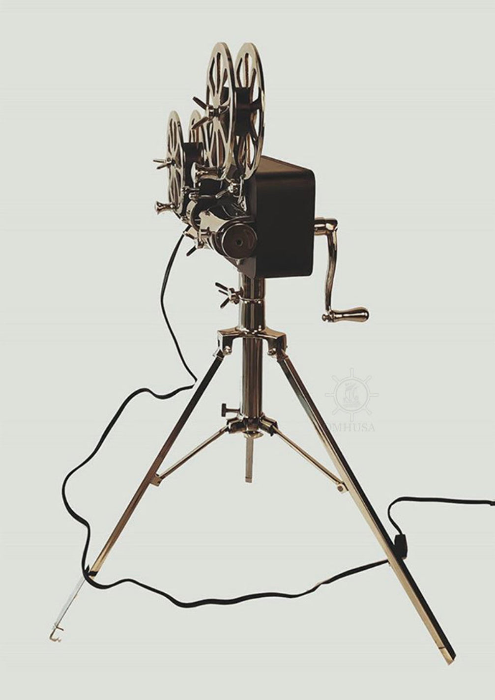 A movie projector is an optomechanical device for displaying motion picture film by projecting it onto a screen. Most of the optical and mechanical elements, except for the illumination and sound devices, are present in movie cameras. Our display movie projector has a functional light at the projector lens which acts as a lamp. It is handmade out of high-quality aluminum and wood. It features many intricate details such as wood case, two-reel system, lens, inching wheel, intermittent sprocket, focusing knob, and a stand. Proudly display this model anywhere you like and it will surely make a conversational piece. A must-have for the collector and enthusiast! Material: Aluminum Type of bulb base: E12 Maxed Watts: 75W Max height: 36 inches The light bulb is not included and sold separately.