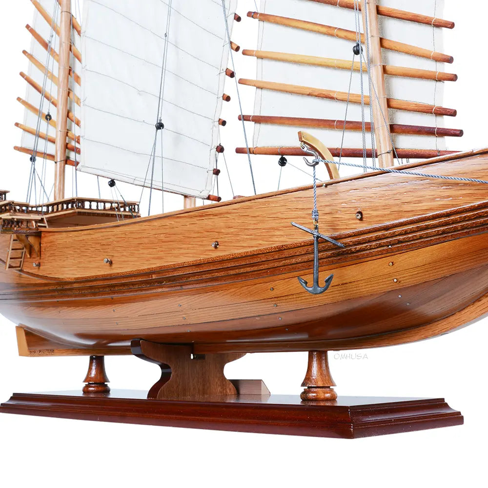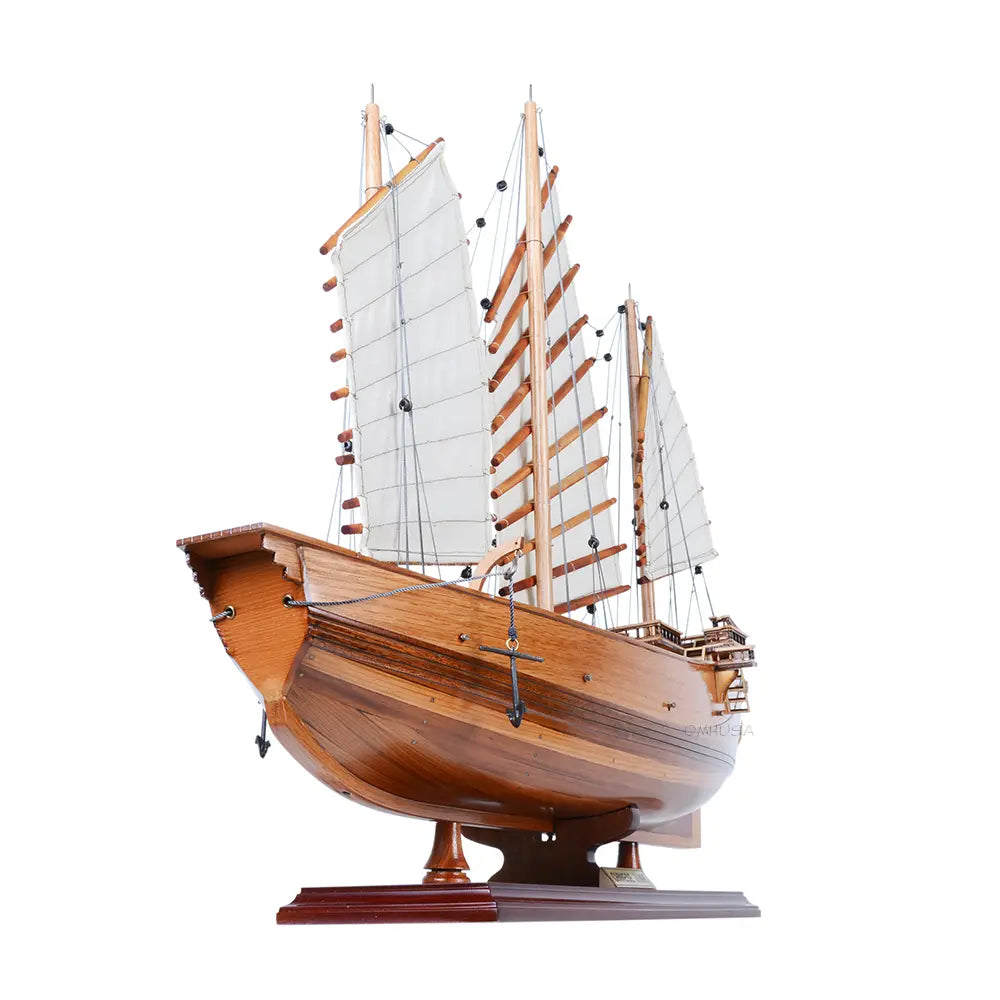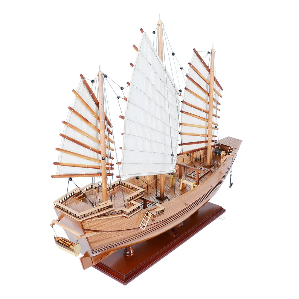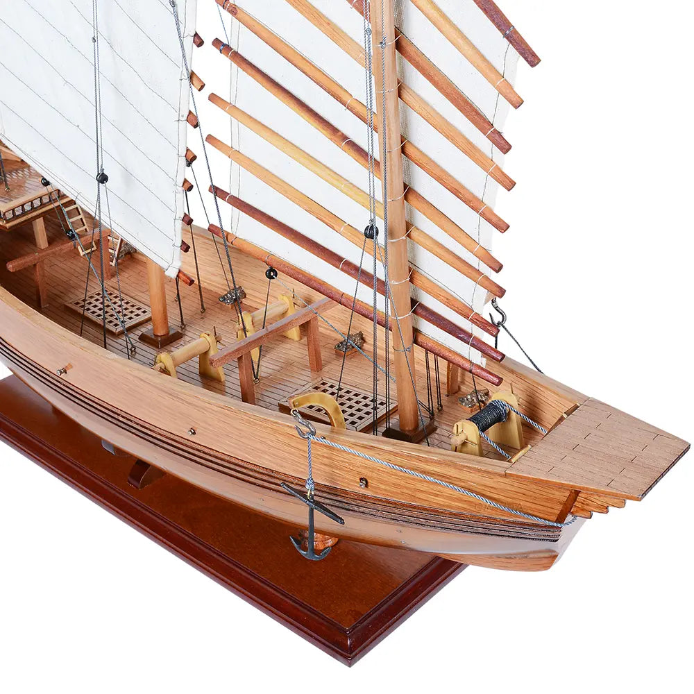 - Material: Exotic woods including mahogany and teak, brass, and hand-stitched fabric sails