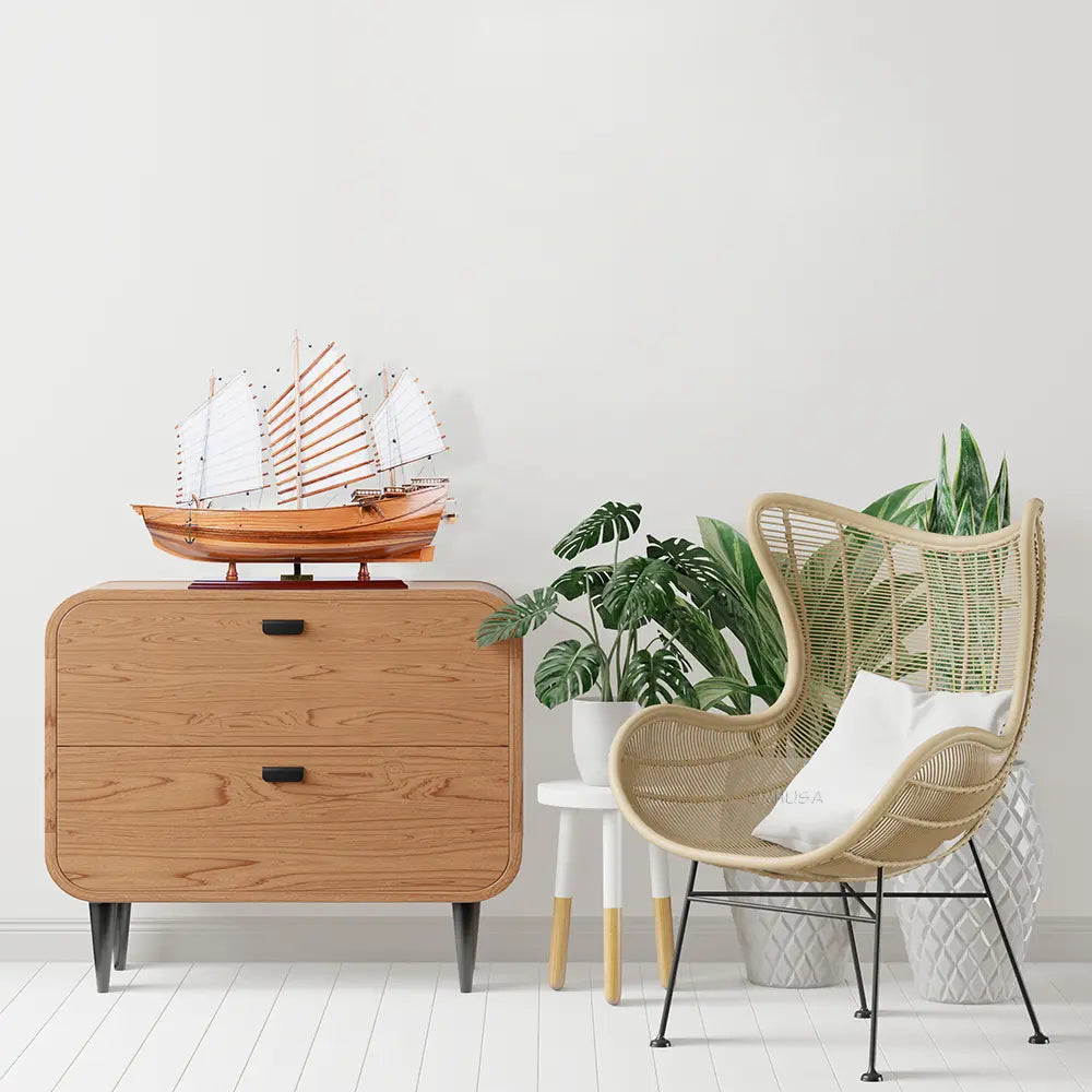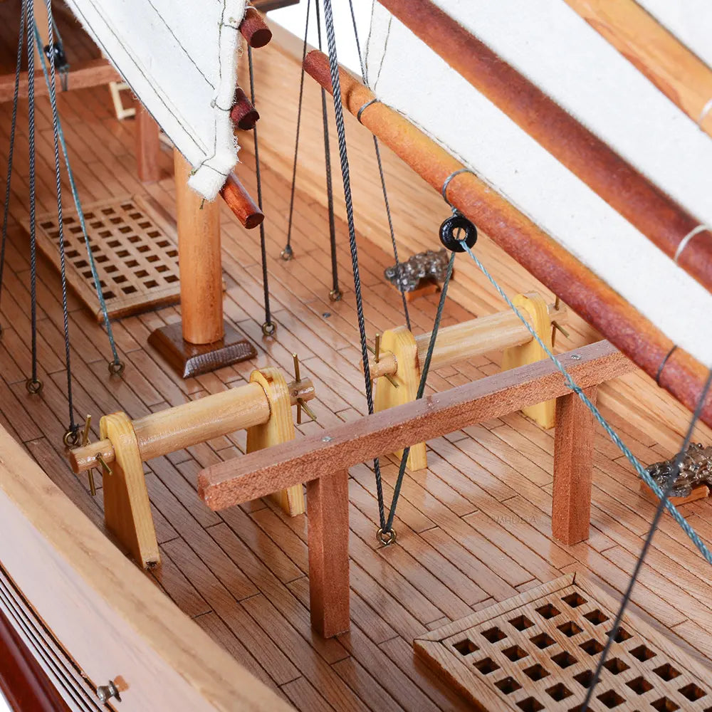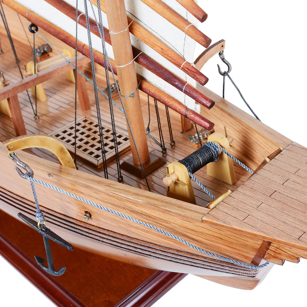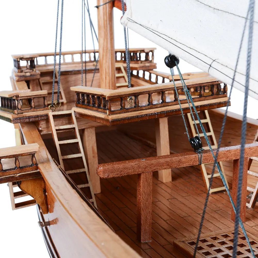 - Material: Exotic woods including mahogany and teak, brass, and hand-stitched fabric sails