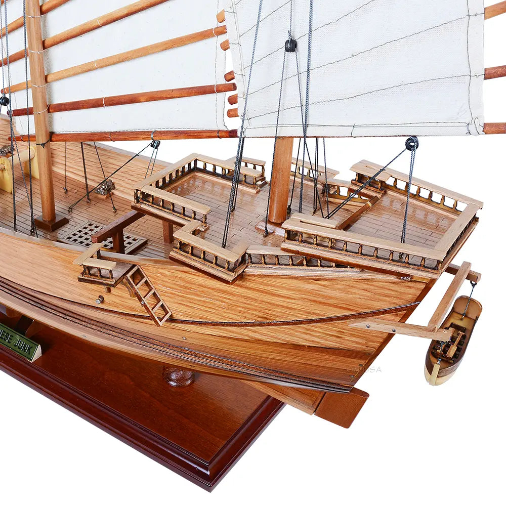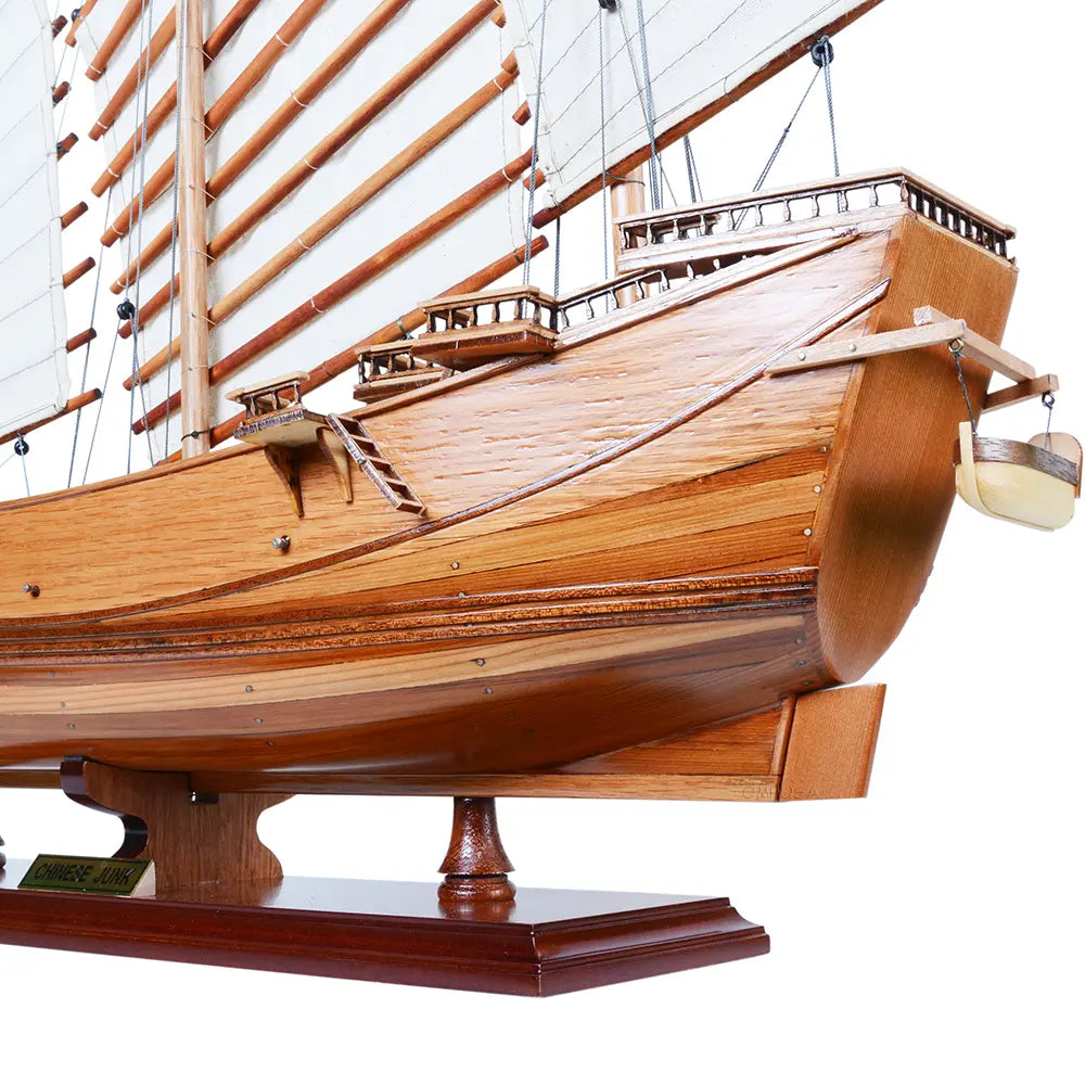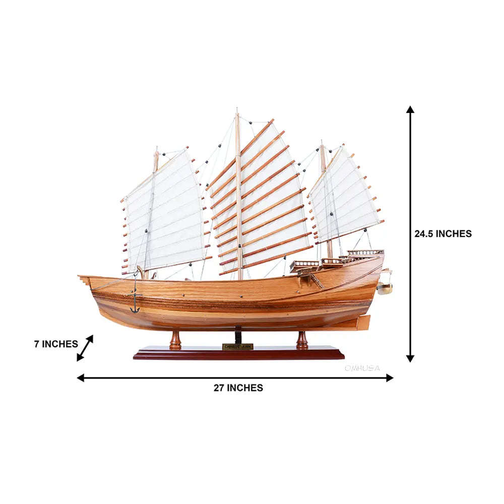 Step into the seafaring legacy of ancient China with the Old Modern Handicrafts Chinese Junk Wooden Ship Model, a masterfully handcrafted 27"L x 7"W x 24.5"H replica of one of the most iconic ships in maritime history. Built using the traditional plank-on-frame method, this model features exquisite details such as bamboo-style battened sails, brass fittings, lifeboats, anchors, and a multi-level wooden deck made from warm-toned mahogany and teak wood. The sails are made from hand-stitched fabric, and the hull rests on a sturdy wooden stand with a brass nameplate. Ideal for display in homes, offices, or maritime museums, this piece is more than décor—it’s a legacy.