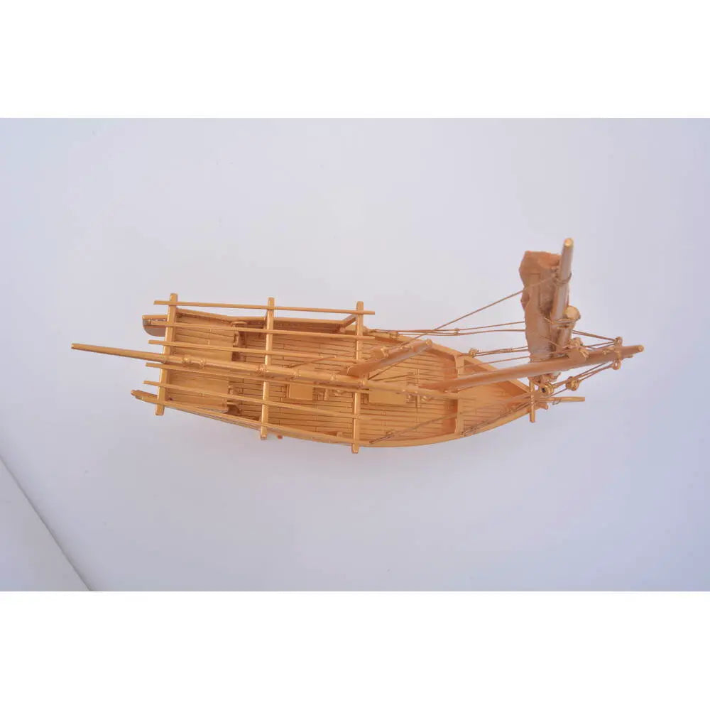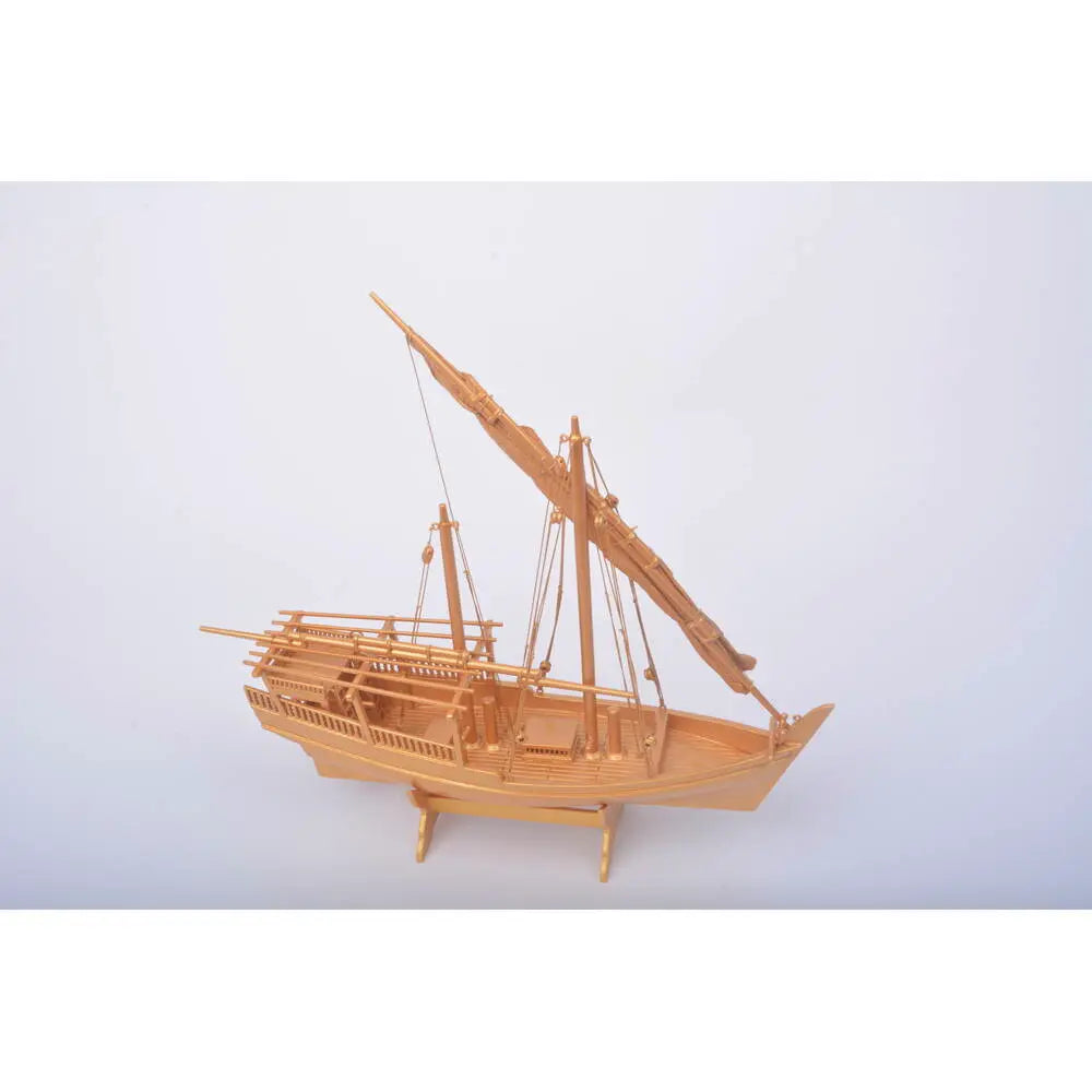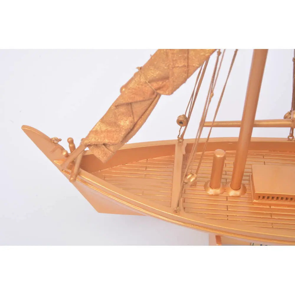 From the gold-toned, fabric-textured sails to the precision knotted rigging and hand-assembled plank-on-frame hull, every detail reflects artisanal skill and historical accuracy. A matching golden stand and a metal nameplate labeled “Dhow Boat” complete this sophisticated display, ideal for desktops, shelves, or gallery spaces. Whether you're a sailing enthusiast, historian, or collector, this model brings timeless elegance and nautical heritage into any setting.