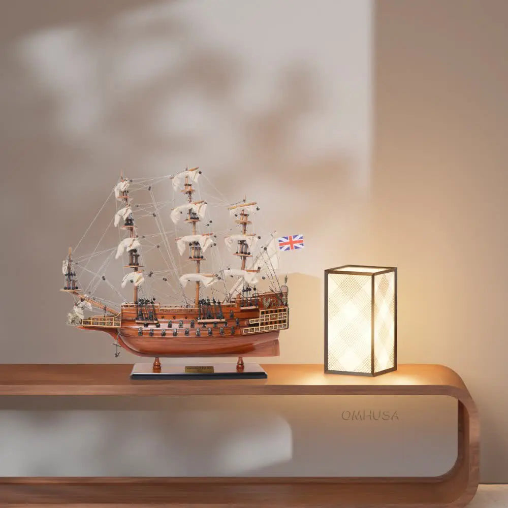 Celebrate maritime history with this handcrafted wooden model of the HMS Sovereign of the Seas. Standing 19.3 inches tall, this museum-quality replica showcases the craftsmanship of 17th-century British naval design. Built using the traditional plank-on-frame method, it features three decks, three masts, and detailed rigging with hand-stitched linen sails. Rows of miniature metal cannons line the hull, complemented by brass statues, anchors, and a finely detailed admiral’s quarter. Each model is individually numbered, reflecting its exclusive handmade origin. Mounted on a solid wood base with an engraved brass nameplate, this display piece is perfect for collectors, history enthusiasts, or elegant home décor. Every detail honors the power and artistry of the Royal Navy’s most iconic ship.