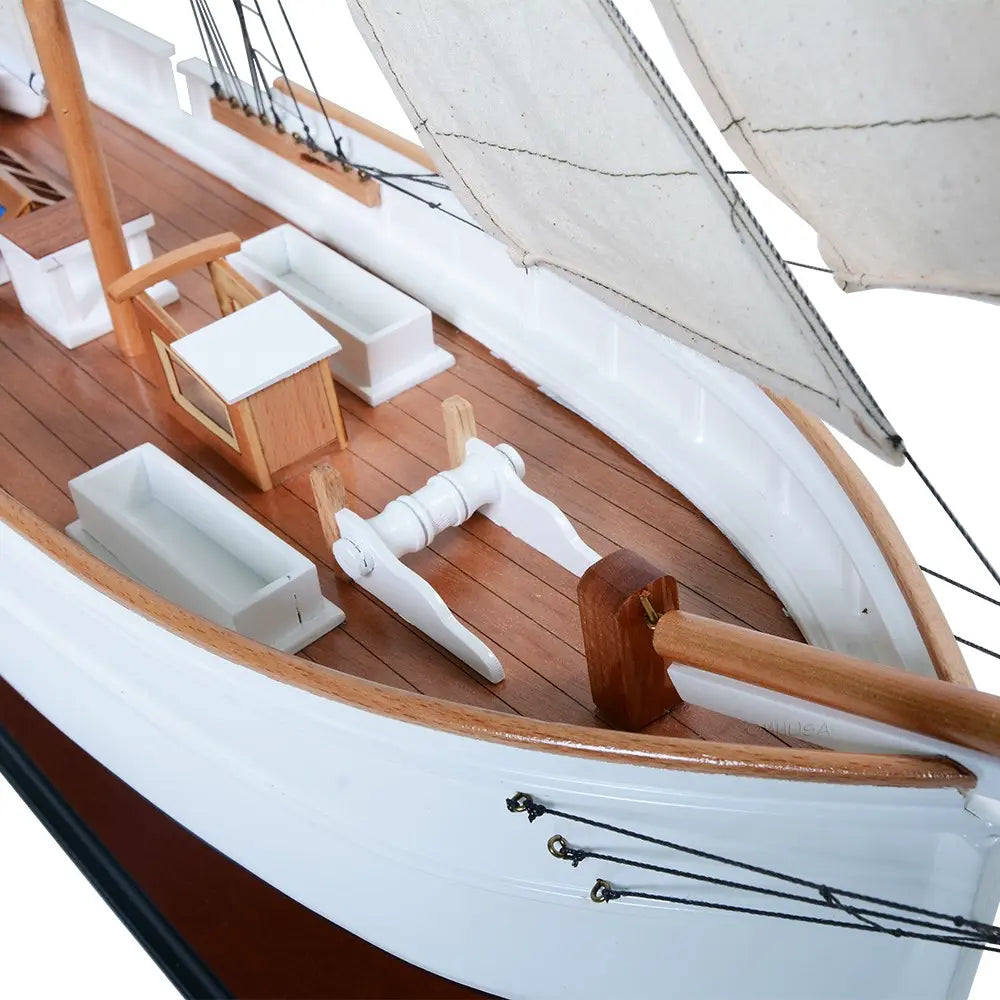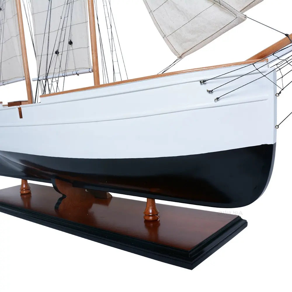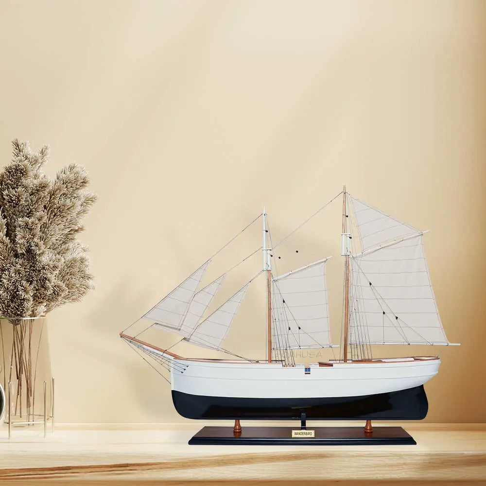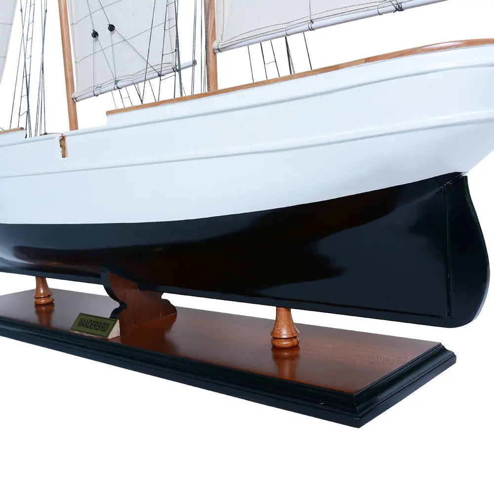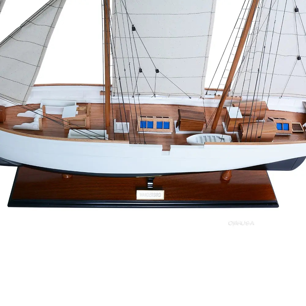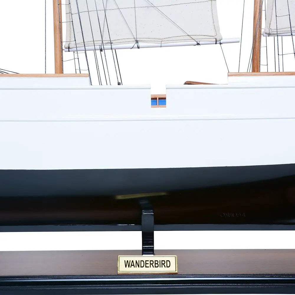 Crafted from solid mahogany wood and painted in an elegant white and dark navy (nearly black), the WanderBird model features exquisite detailing—metal steering wheel, skylights, deckhouses, intricate rigging, full cloth sails with stitched seams, and a beautifully inlaid wood deck. It is mounted on a polished wooden base with a metal nameplate, making it an ideal centerpiece for your home, office, or maritime collection.