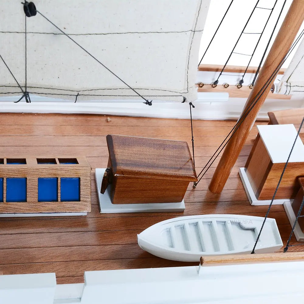- Frame Details: Full rigging, wood-inlaid deck, skylights, deckhouses, cloth sails, metal steering wheel