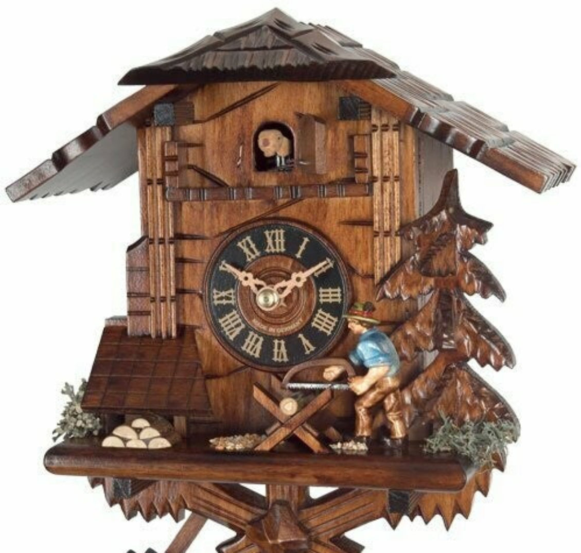 One Day Cuckoo Clock – 9.8 in – Man Sawing Wood, Hand-carved Black Forest By River City Clocks