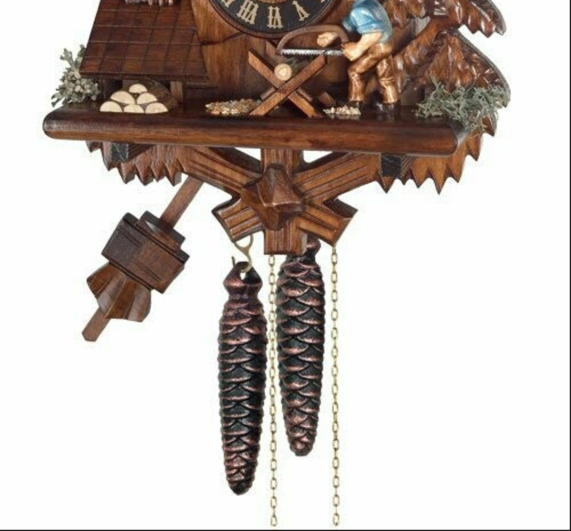 This 9.8-inch hand-carved Black Forest cuckoo clock features a man sawing wood at the top of every hour. The clock case is beautifully adorned with a hand-carved tree, foliage, and wood pile. On the hour, the man moves his saw across the log as the cuckoo bird cuckoos the time, with a single cuckoo call at the half hour. The 30-hour all-brass mechanical Regula movement is wound daily with two pine cone weights, one powering the time and the other powering the cuckoo and the moving figure. A hand-made pendulum ensures accurate timing, and a manual night shut-off allows you to silence the cuckoo and stop the man sawing. Each clock is unique, with slight variations in color and carving.