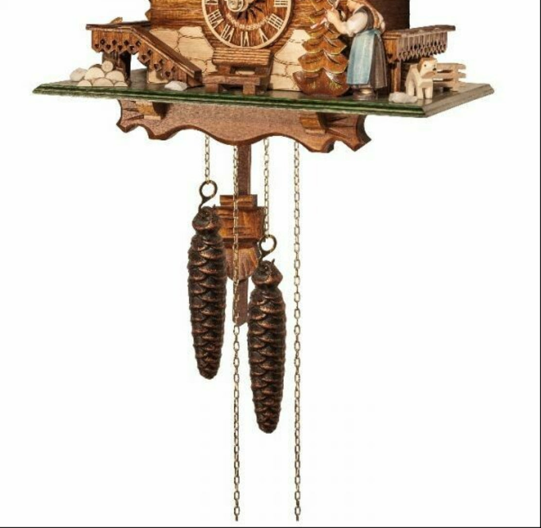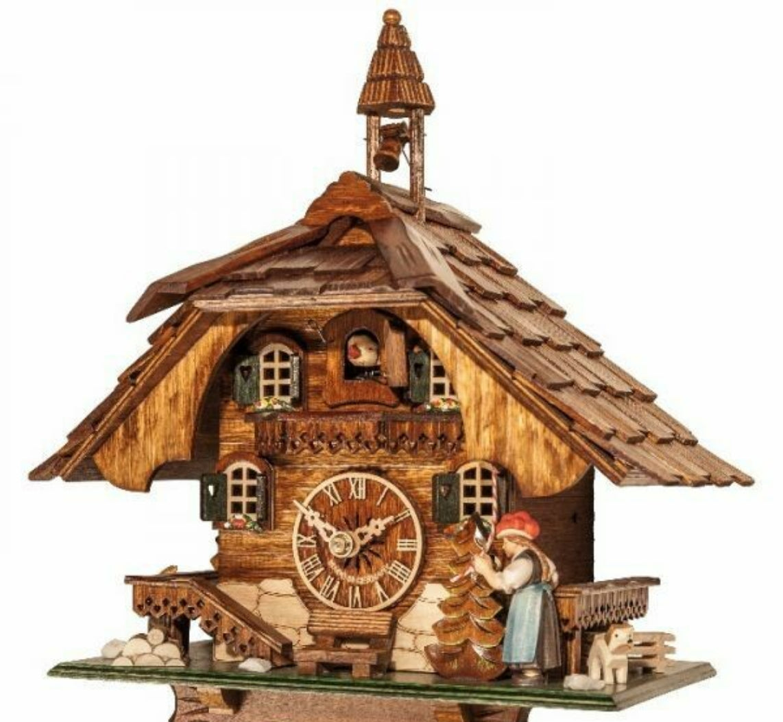 This Black Forest chalet cuckoo clock features a hand-carved lady ringing a bell at the top of every hour, surrounded by trees, a dog, and a playful bunny. The chalet has a shingled roof, bell tower, and four windows with green wooden shutters, showcasing intricate craftsmanship. The cuckoo bird calls each hour (one cuckoo at 1 o’clock, eight at 8 o’clock) and a single cuckoo marks the half hour. A manual night shut-off switch allows you to silence both the cuckoo and the bell-ringing action. The 30-hour all-brass mechanical Regula movement is wound daily via two cast iron pine cone weights. Each clock is unique and comes with a two-year limited warranty.