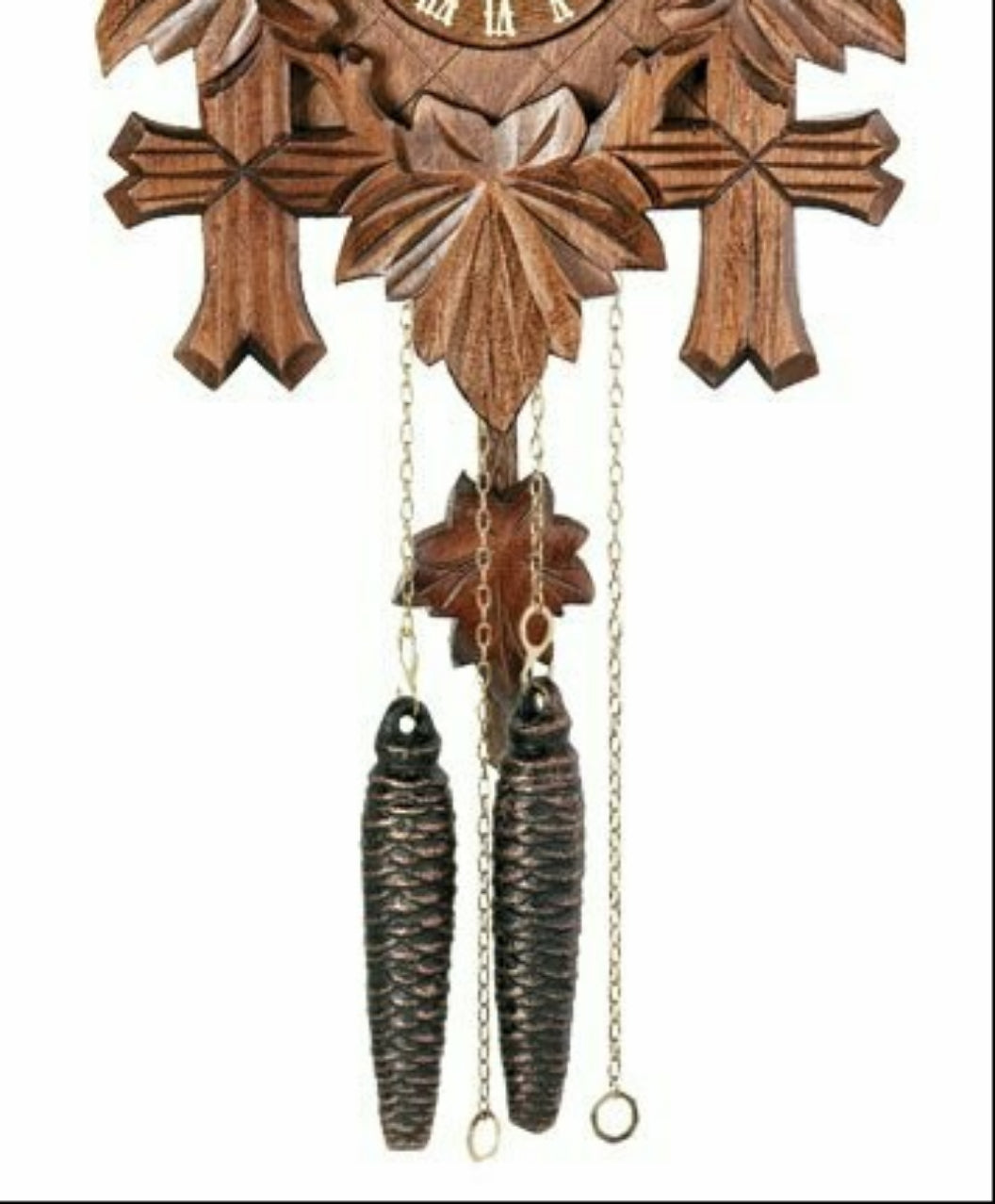 This one day cuckoo clock features a hand carved maple leaf design with a 13 in height suited for traditional wall decor. The wooden case includes five deeply carved leaves and a carved bird at the peak, paired with a hand painted cuckoo bird that announces the hour. Two cast iron pine cone weights power the mechanical brass Regula movement, with one weight driving the time and the other controlling the cuckoo call. The pendulum swings continuously and can be adjusted by sliding the carved maple leaf up or down the stick. The clock measures 13 in high, 8.3 in wide, and 6.3 in deep. Made in Germany, this clock includes a two year limited workmanship warranty.