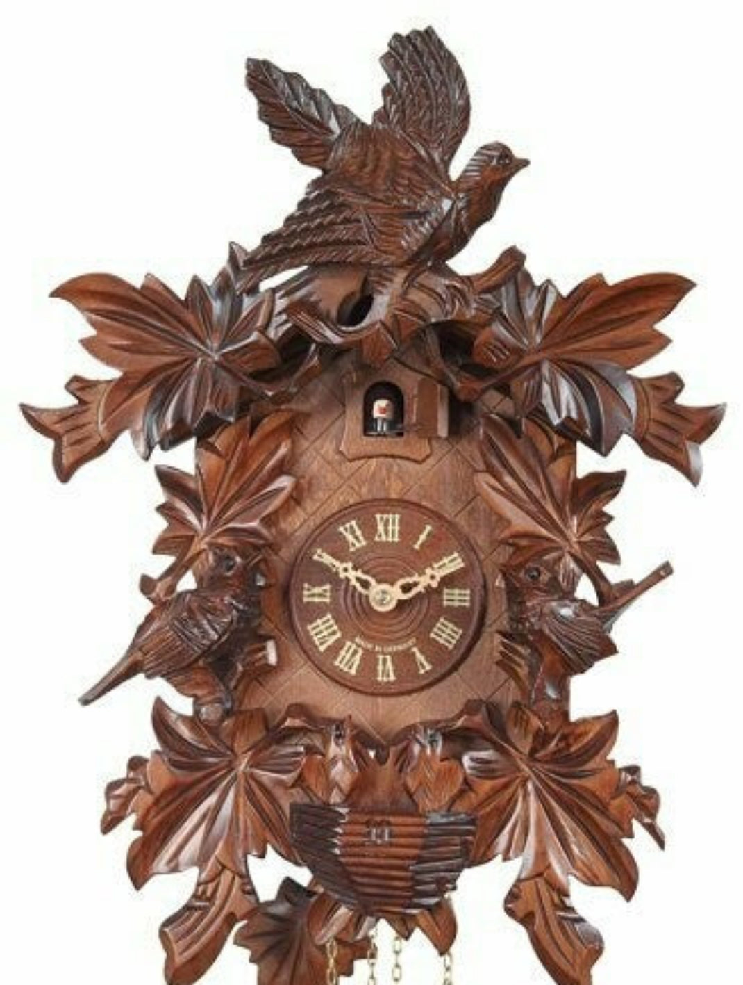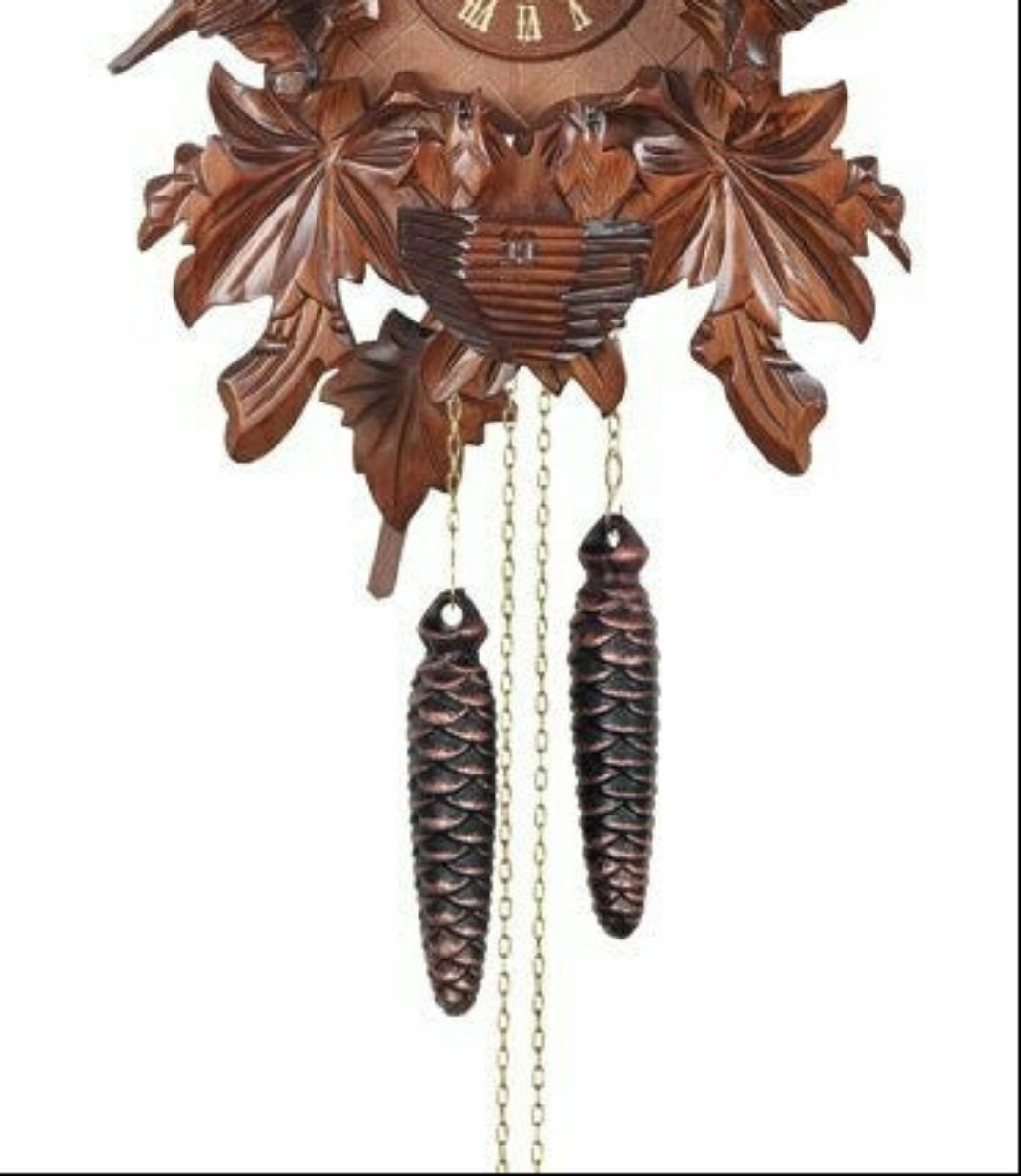 This one day cuckoo clock features a hand carved wooden case with seven maple leaves, three birds, and a small nest beneath the dial. It includes wooden hands, a wood dial with Roman numerals, and a hand painted cuckoo bird that calls every hour. Measuring 16 x 12 x 8 inches, the clock uses a one day mechanical movement powered by two cast iron pine cone weights. The pendulum swings continuously and can be adjusted for timing accuracy. The cuckoo bird appears through a small door above the dial and sounds the hour, with a single call marking the half hour. This design suits traditional or rustic home wall settings.