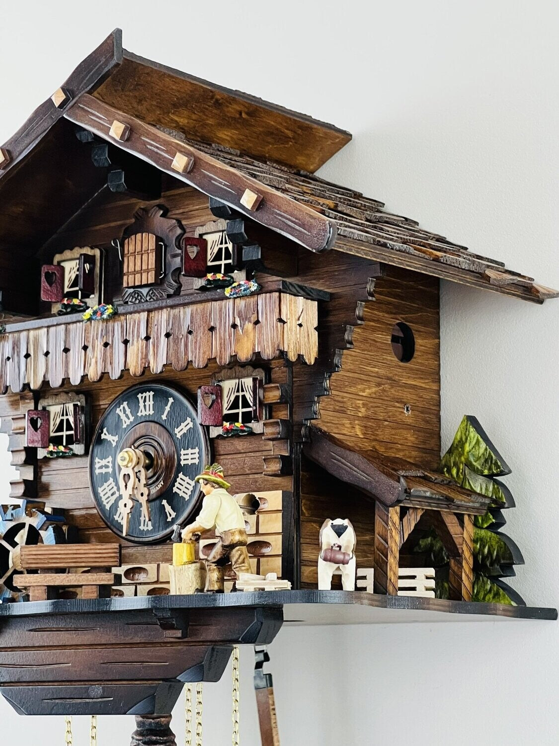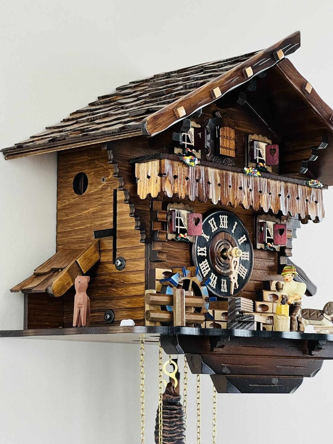 One Day Musical Cuckoo Clock Cottage – 13" Man Chopping Wood & Waterwheel – Traditional Design By River City Clocks