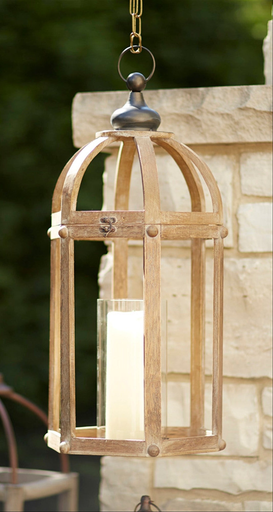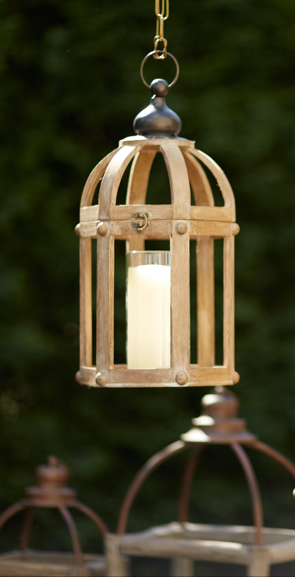 This set of open wood lanterns brings a warm and contemporary touch to home decor. Each lantern features a wooden frame accented with metal elements and paired with a clear glass hurricane for safe and attractive candle placement. The clean, open design complements a wide range of interior styles, from rustic to modern. Suitable for LED or real wax candles, the lanterns create soft, ambient lighting for everyday display or special occasions. Use them together for a tiered arrangement or place them separately for balanced styling throughout the home. Dimensions: 10 x 10 x 21 inches, 13 x 13 x 28 inches, and 5 x 5 x 6 inches.