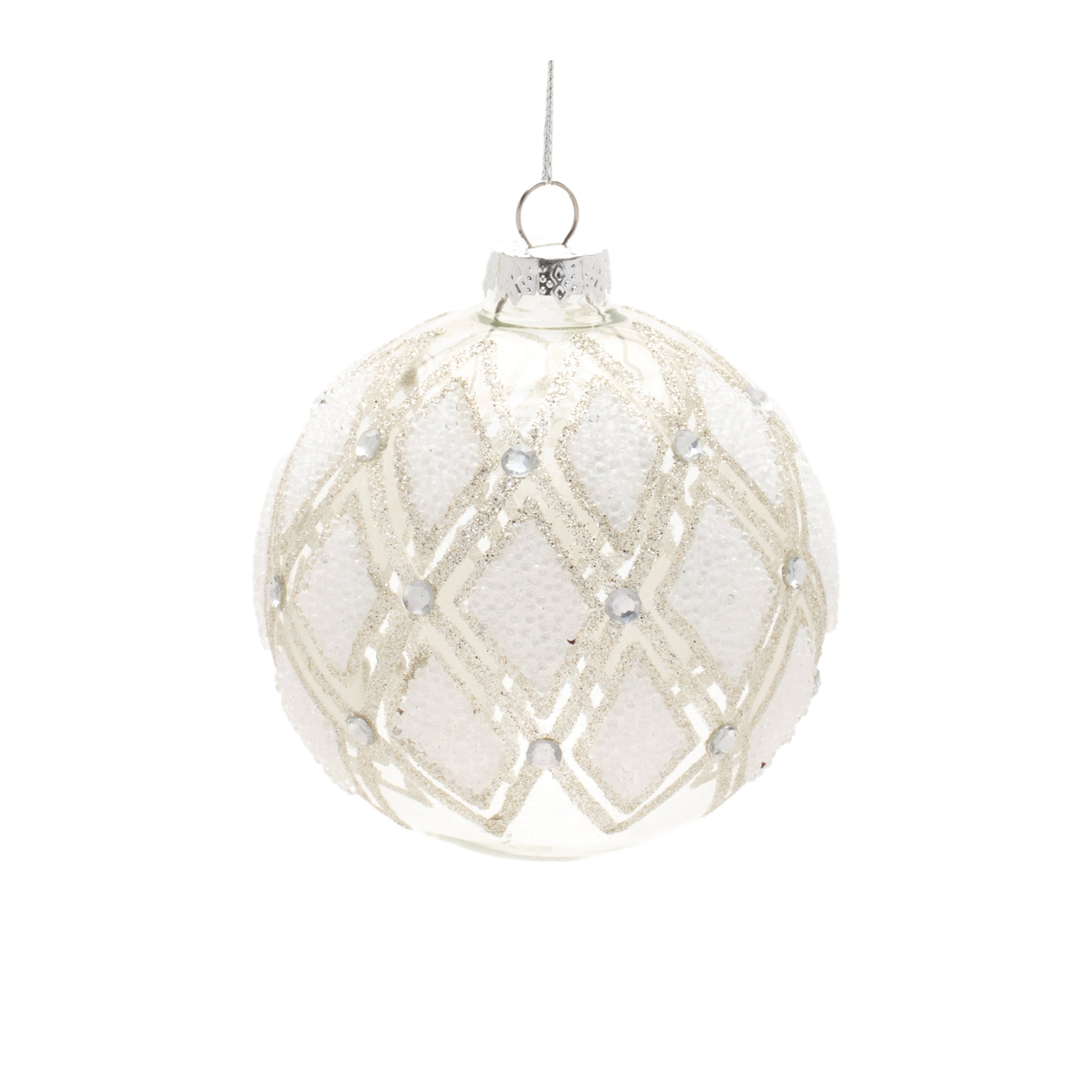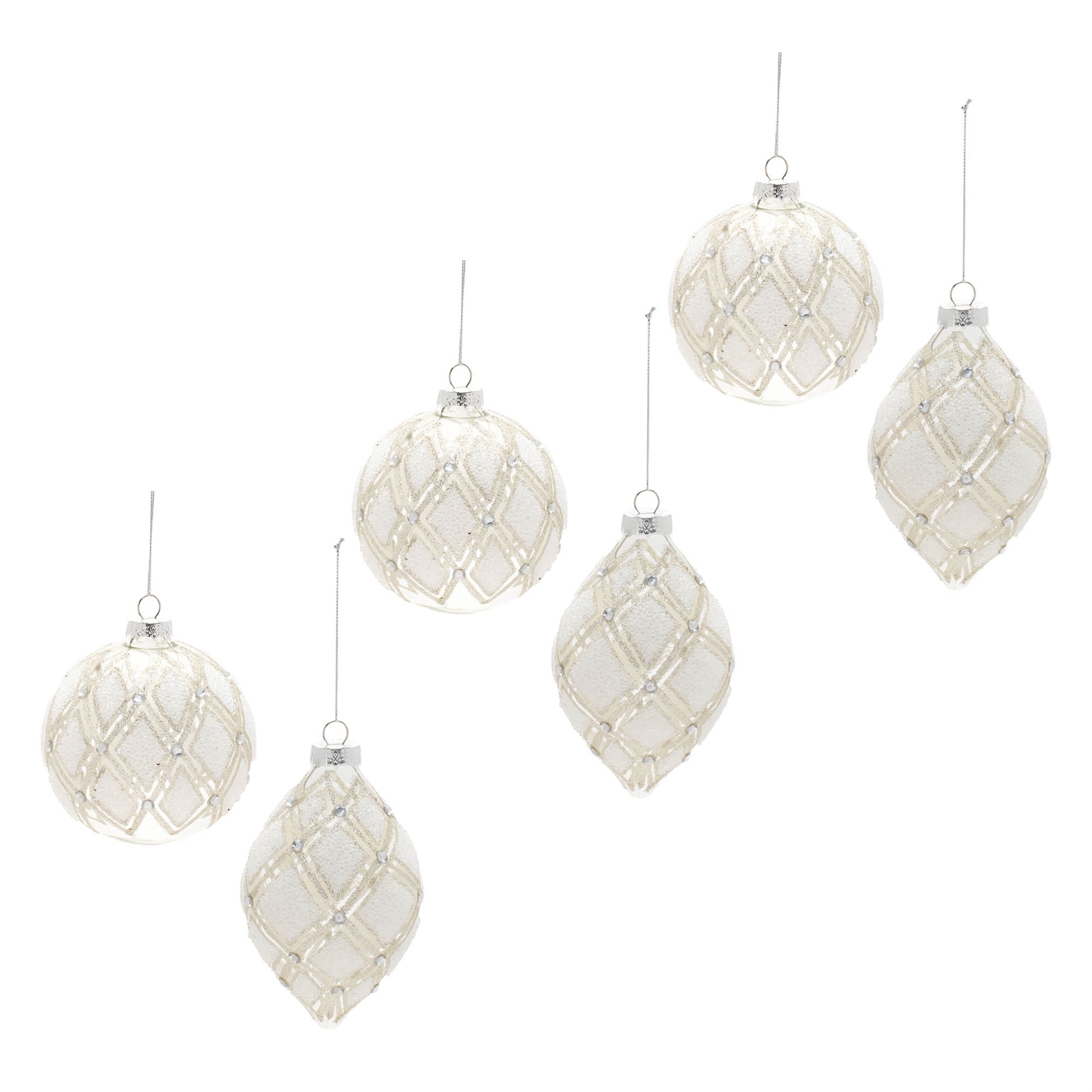 Elevate your holiday home with this set of 6 Jeweled Diamond Glass Ornaments. Crafted from clear glass, these ornaments feature wintry white and ivory tones with chic beaded and jewel accents arranged in an elegant diamond pattern. The set includes two assorted shapes, with sizes measuring 4 x 4 x 4.5 and 3 x 3 x 5.5, adding variety and visual depth to seasonal displays.